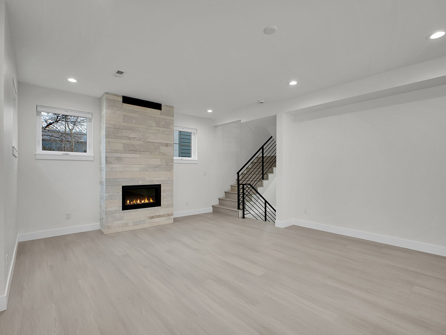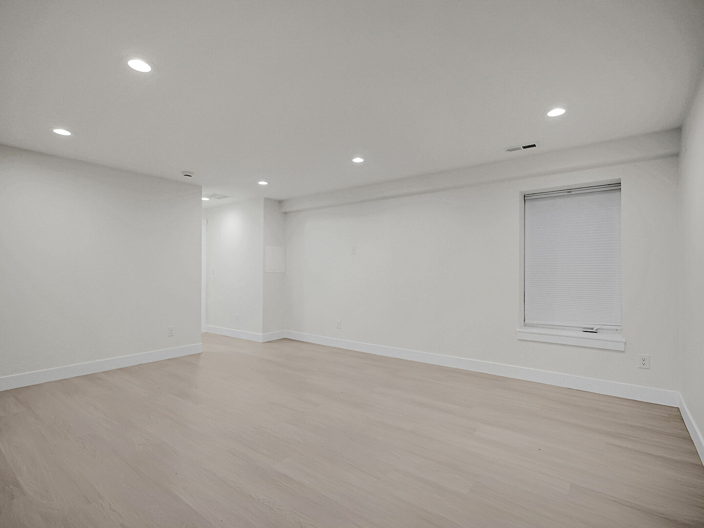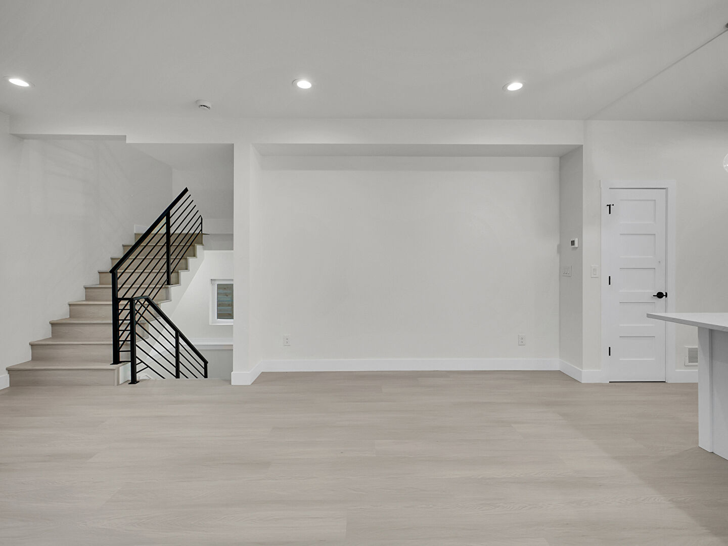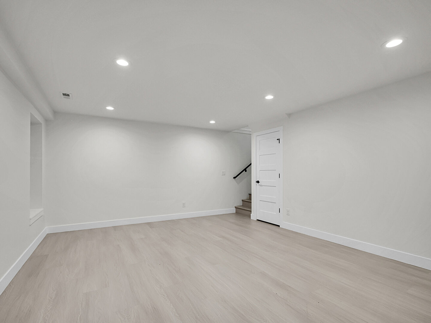 Baseboards Wall, Basement, Drywall, Recessed Lighting, Stairs, Vent, Wood Finish Floor, Baseboards Wall, Vent