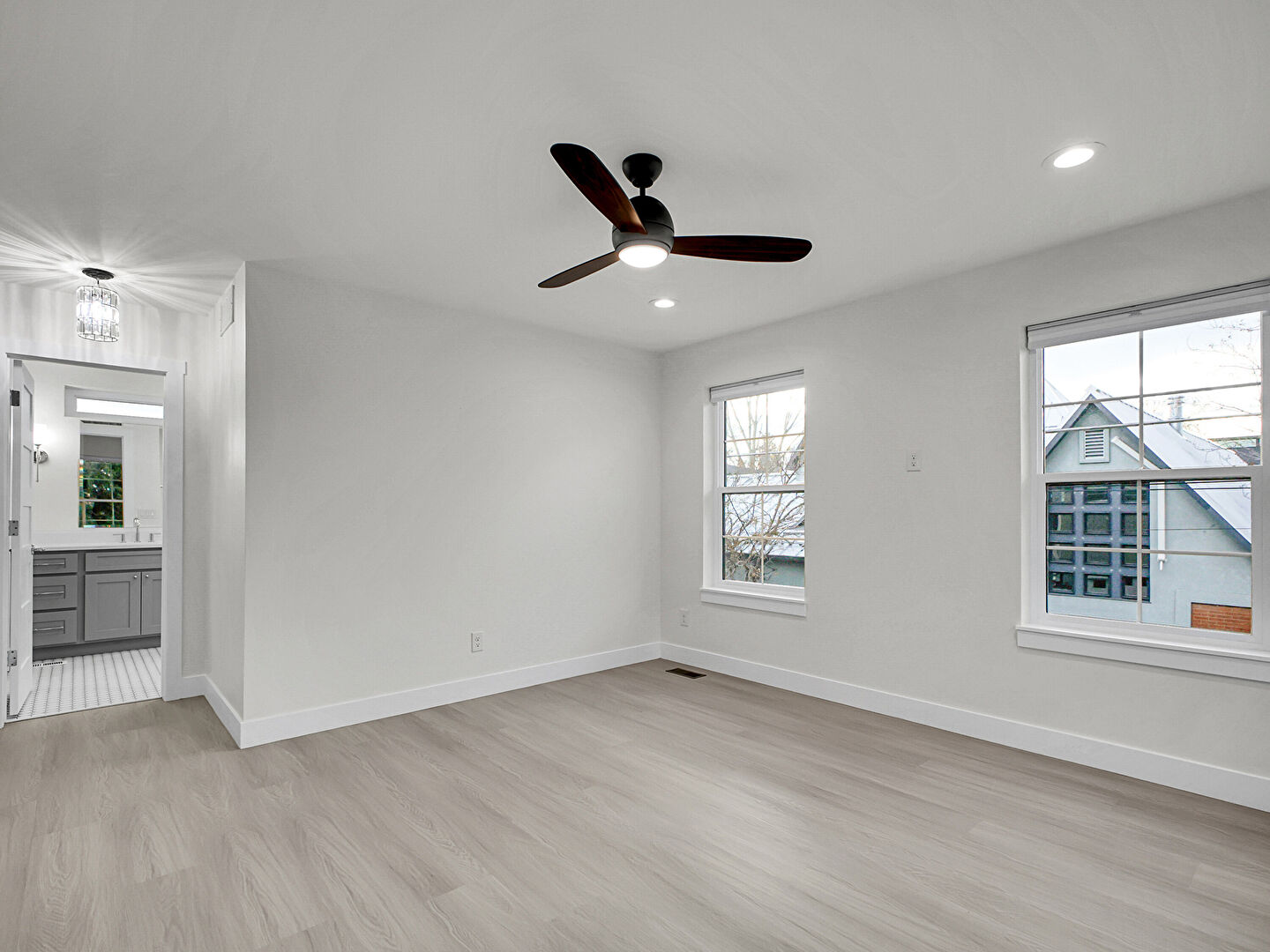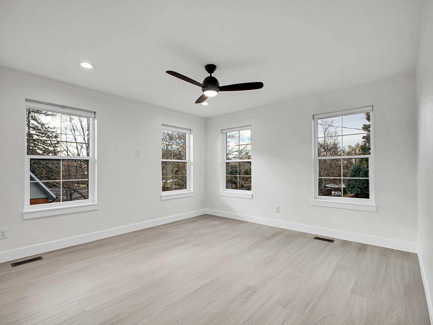 Baseboards Wall, Ceiling Fan, Drywall, Natural Light, Recessed Lighting, Vent, Wood Finish Floor, Drywall, Natural Light, Recessed Lighting