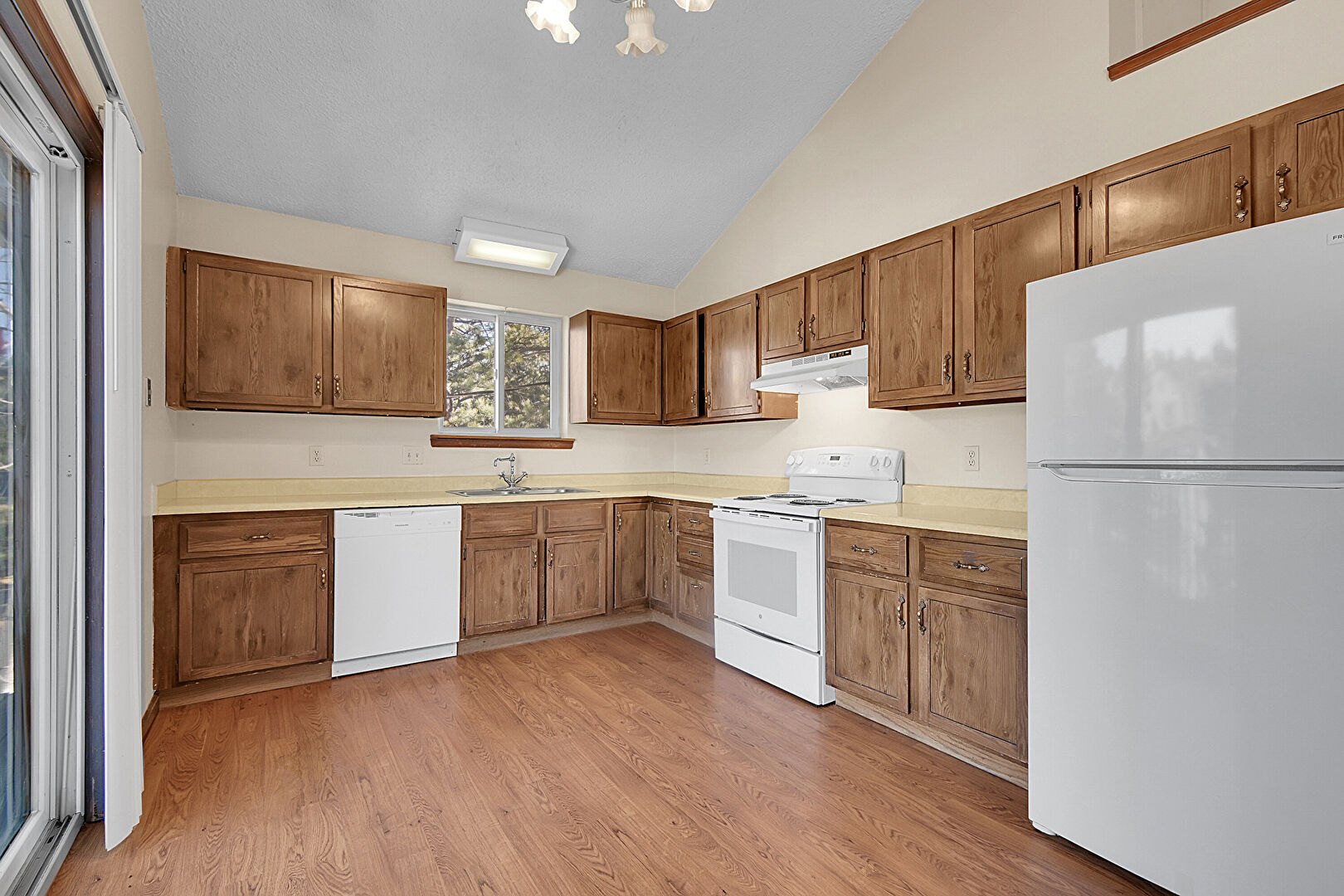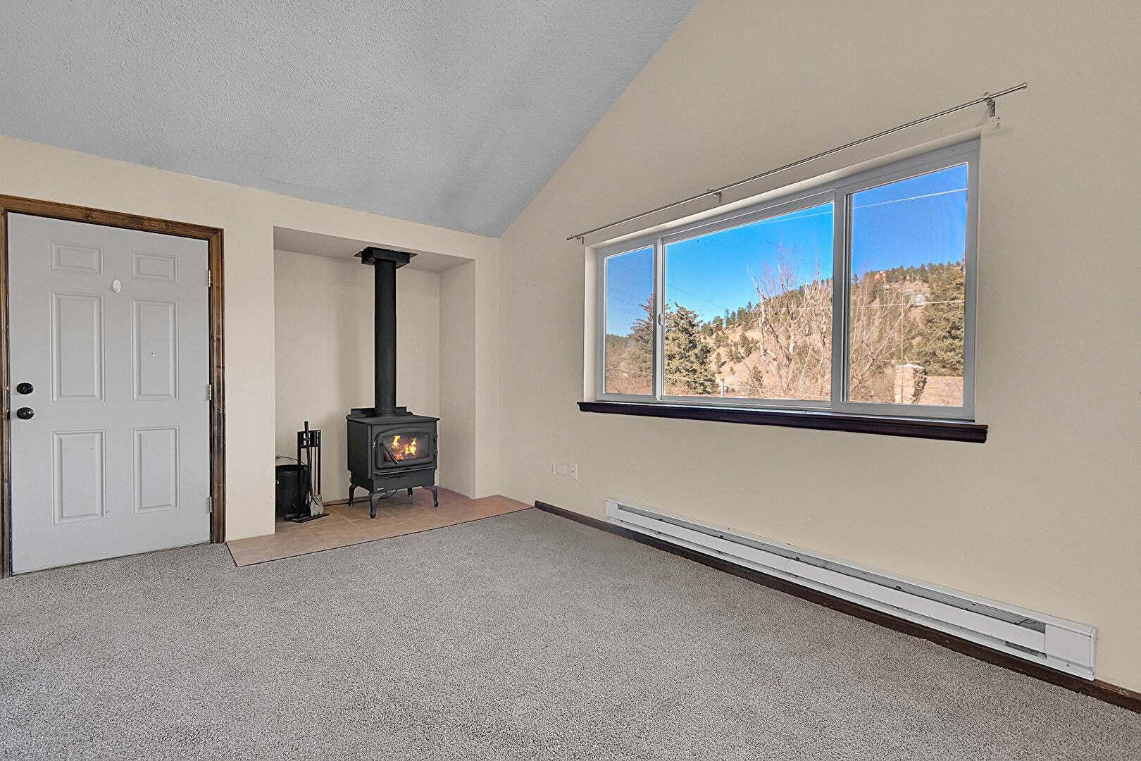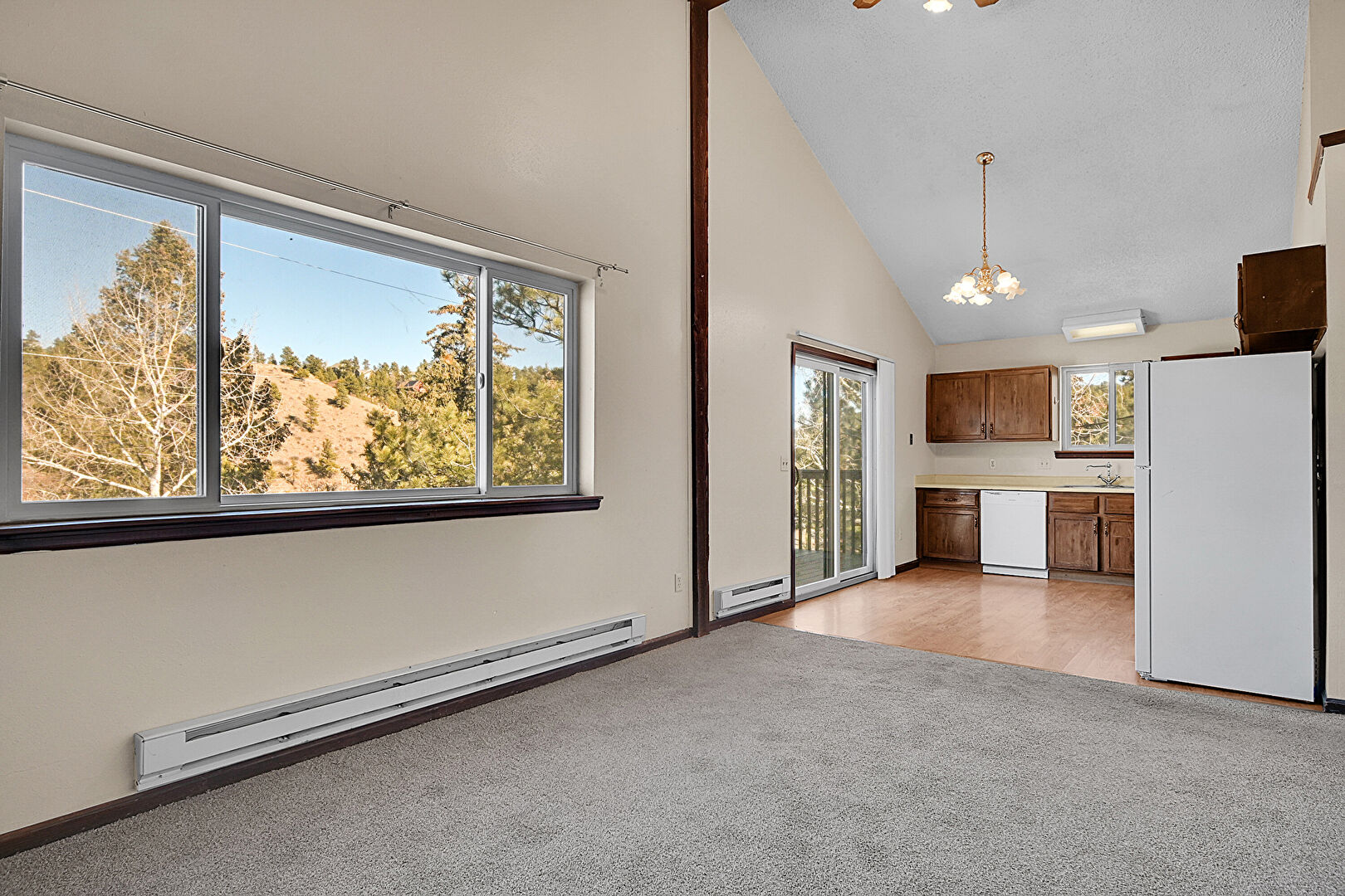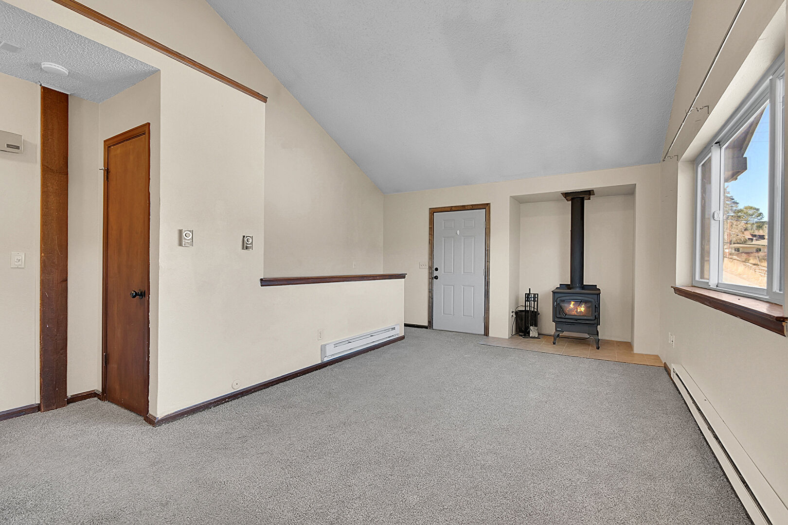 Baseboard Radiator, Baseboards Wall, Carpet, Ceiling Fan, Drywall, High Ceiling, Medium Brown Cabinets, Natural Light, Notable Chandelier, Opens To Living Area, Pendant Lighting, Shaker Cabinets, Textured Ceiling, Vaulted Ceiling, Wood Stove, Baseboard Radiator, Baseboards Wall, Natural Light