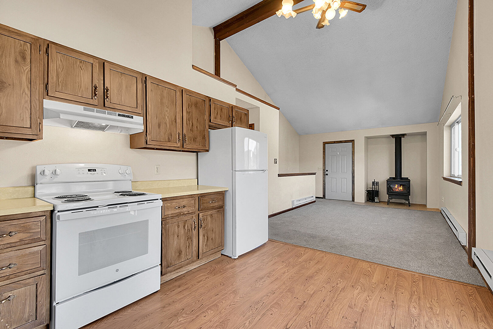 Baseboard Radiator, Baseboards Wall, Beamed Ceiling, Carpet, Cathedral Ceiling, Ceiling Fan, Drywall, High Ceiling, L Shaped Kitchen, Medium Brown Cabinets, Natural Light, Notable Chandelier, Opens To Living Area, Shaker Cabinets, Vaulted Ceiling, Vent, Visible Hinge Cabinets, Wood Finish Floor, Wood Stove, Baseboard Radiator, Pendant Lighting, Visible Hinge Cabinets, Wood Finish Floor