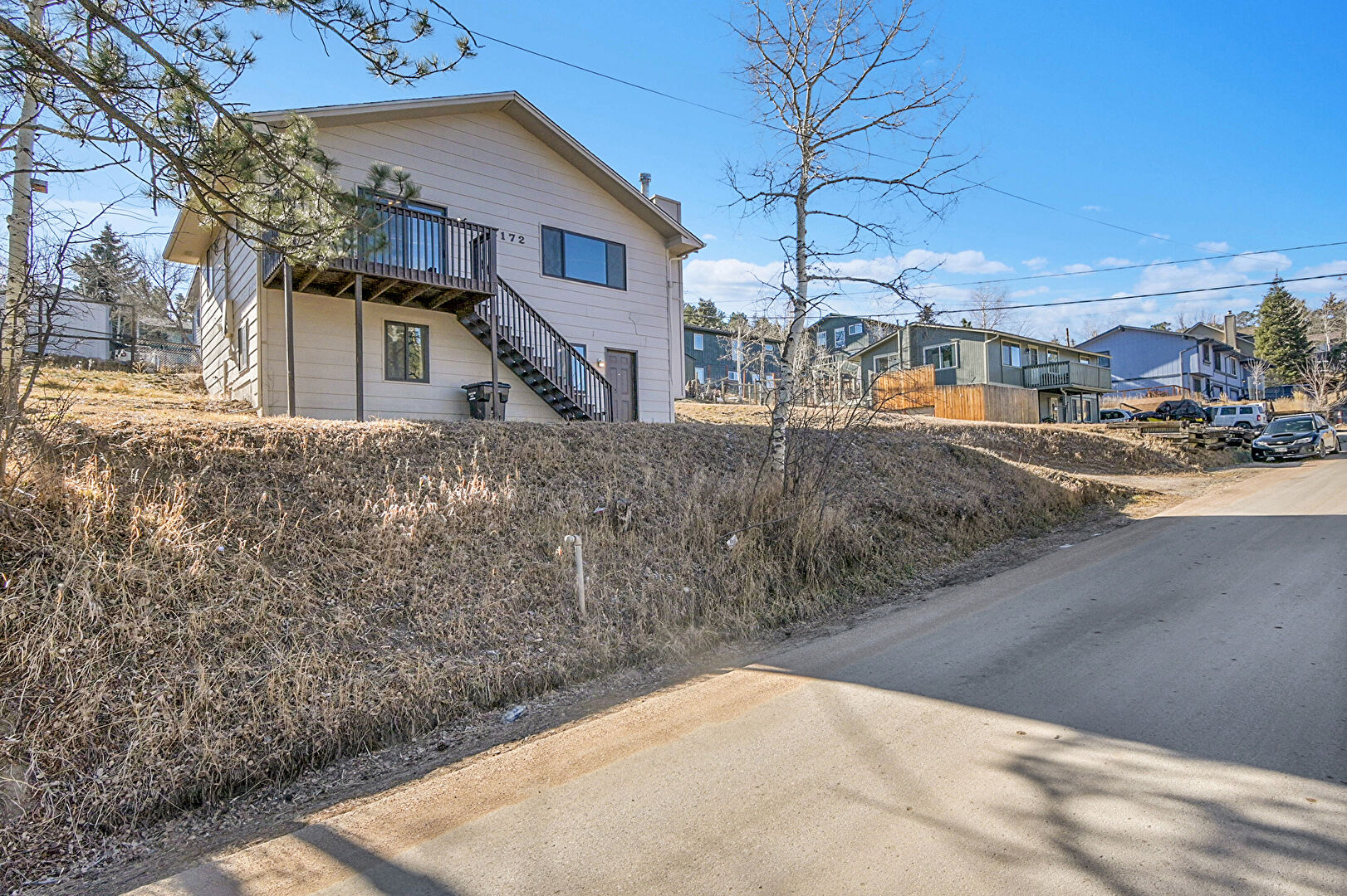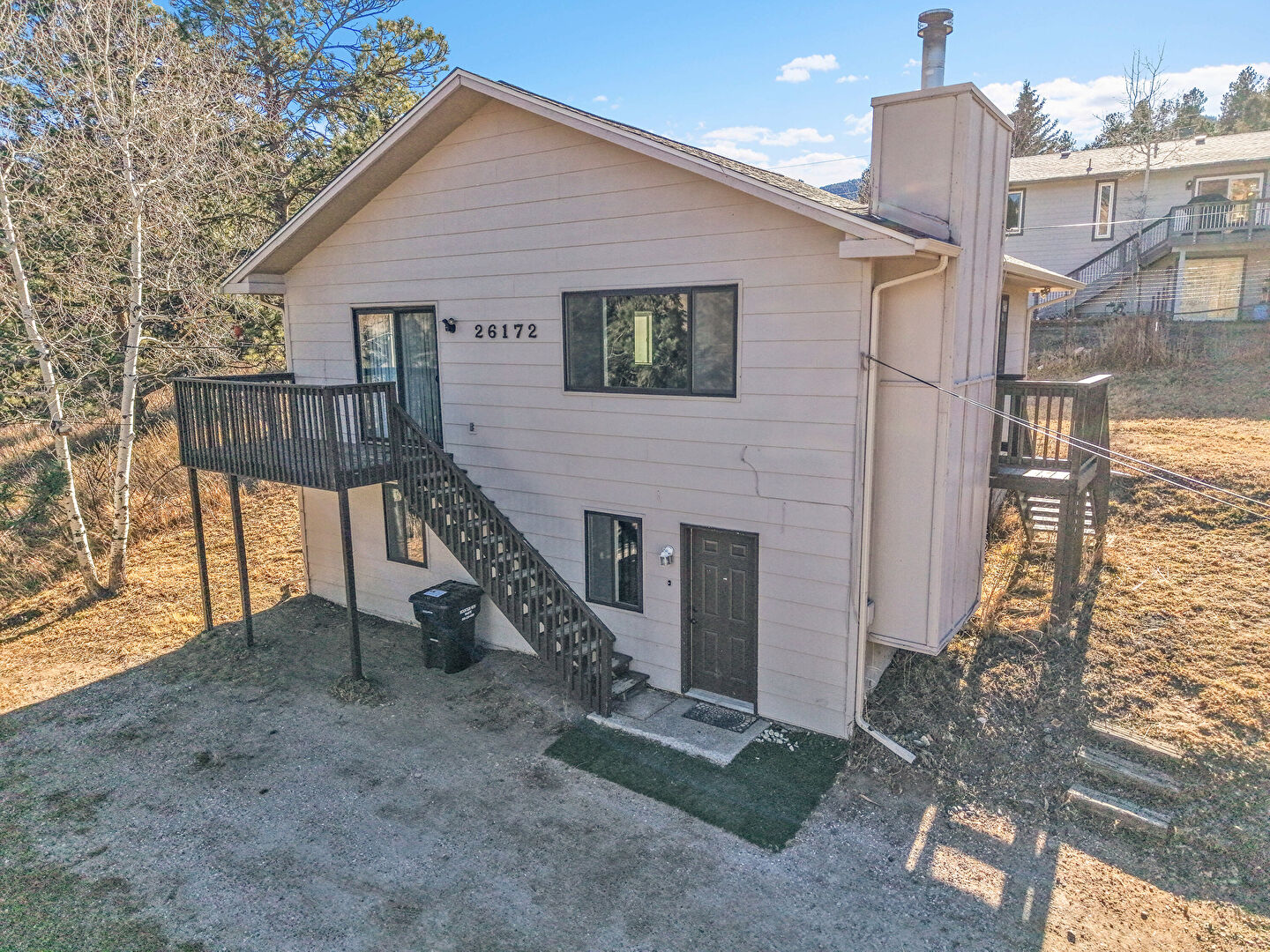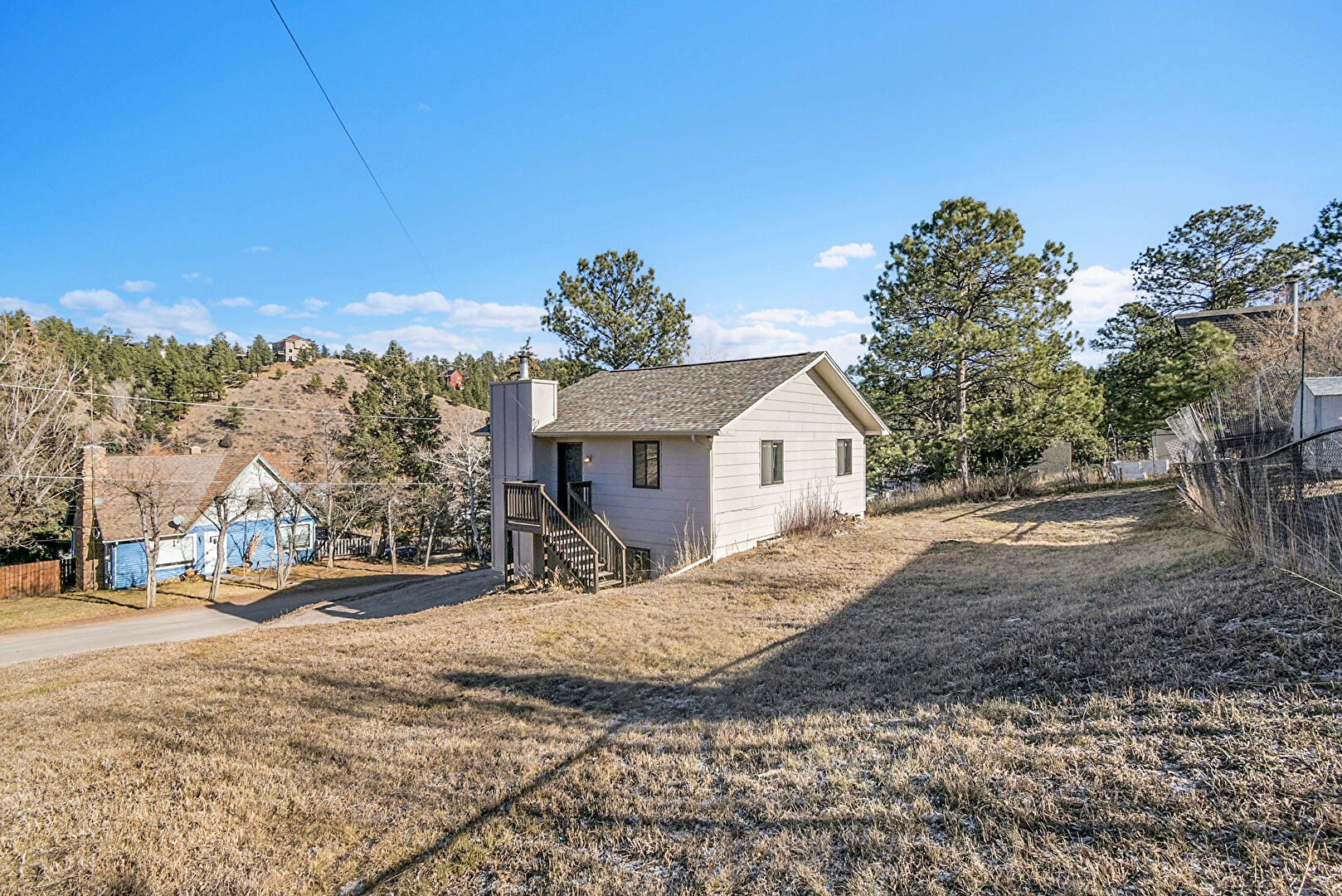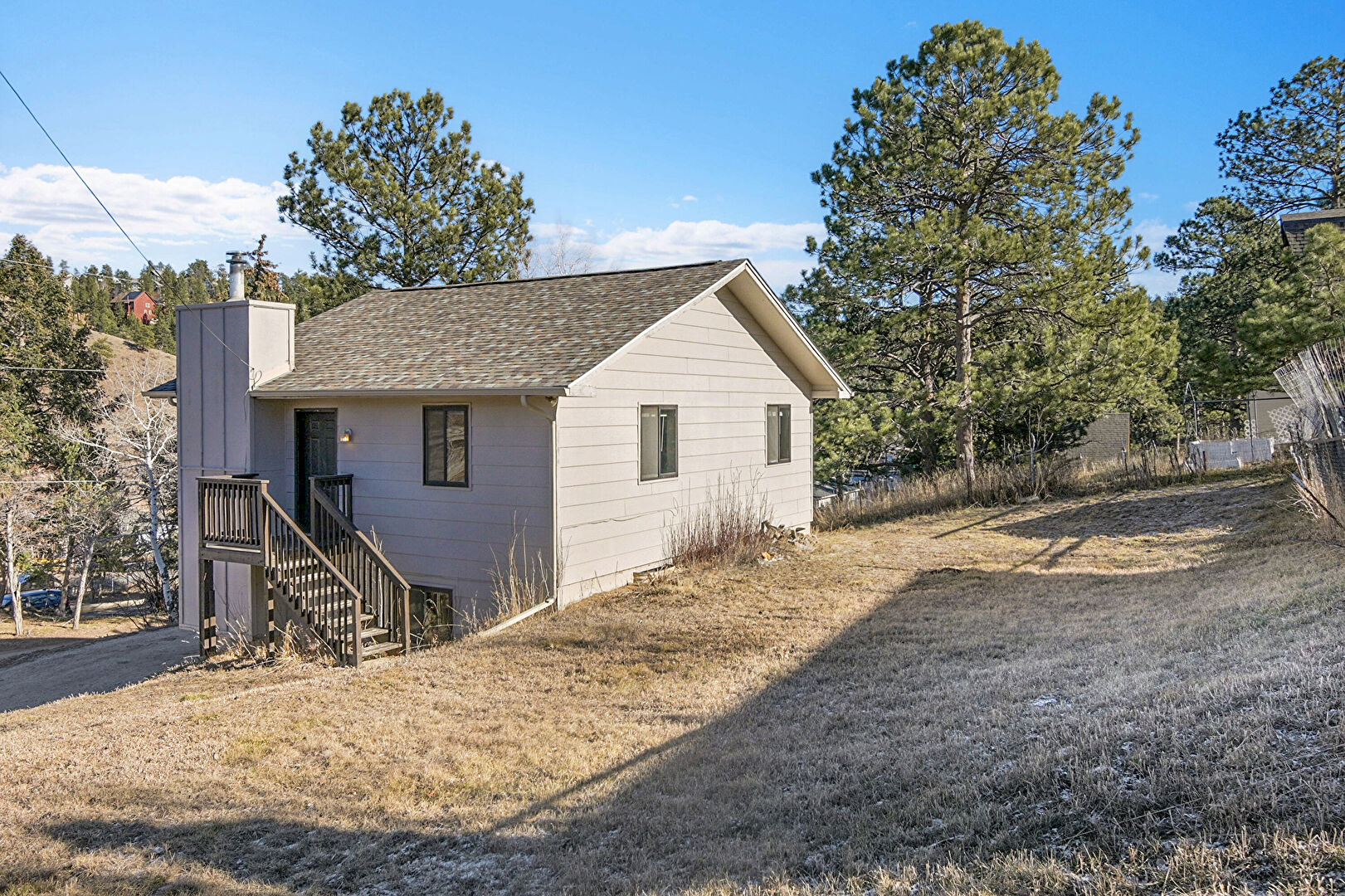 Basement Walk Out, Chimney, Deck, Downspout, Fence, Gutters, Horizontal Siding, Lawn, Shingle Roof, Stairs, Downspout, Patio
