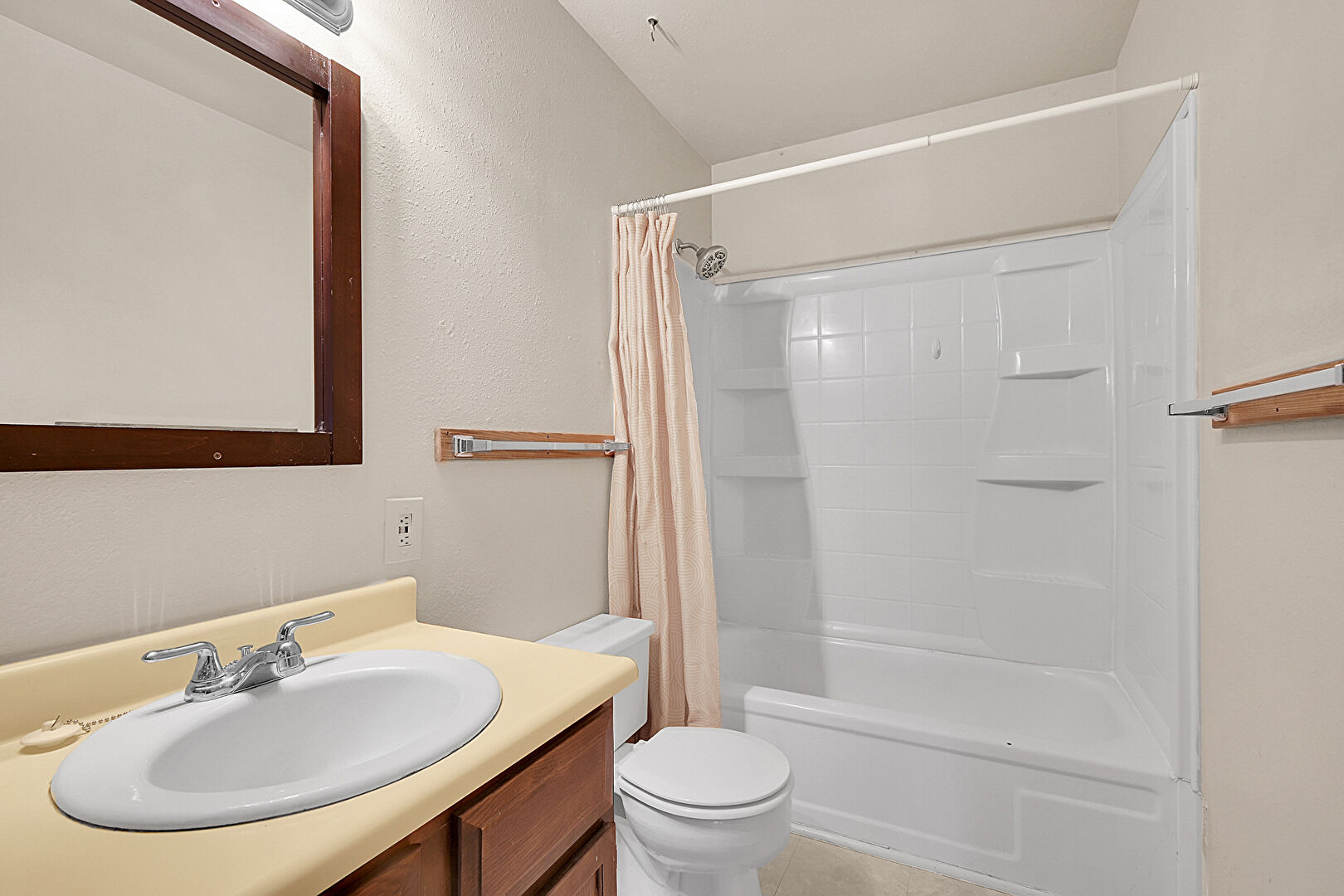 Full Bathroom, Textured Wall, Tile Floor, Vanity, Combined Bath Shower, Vanity