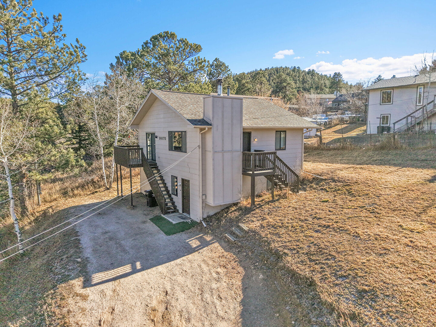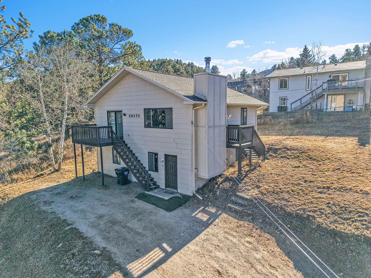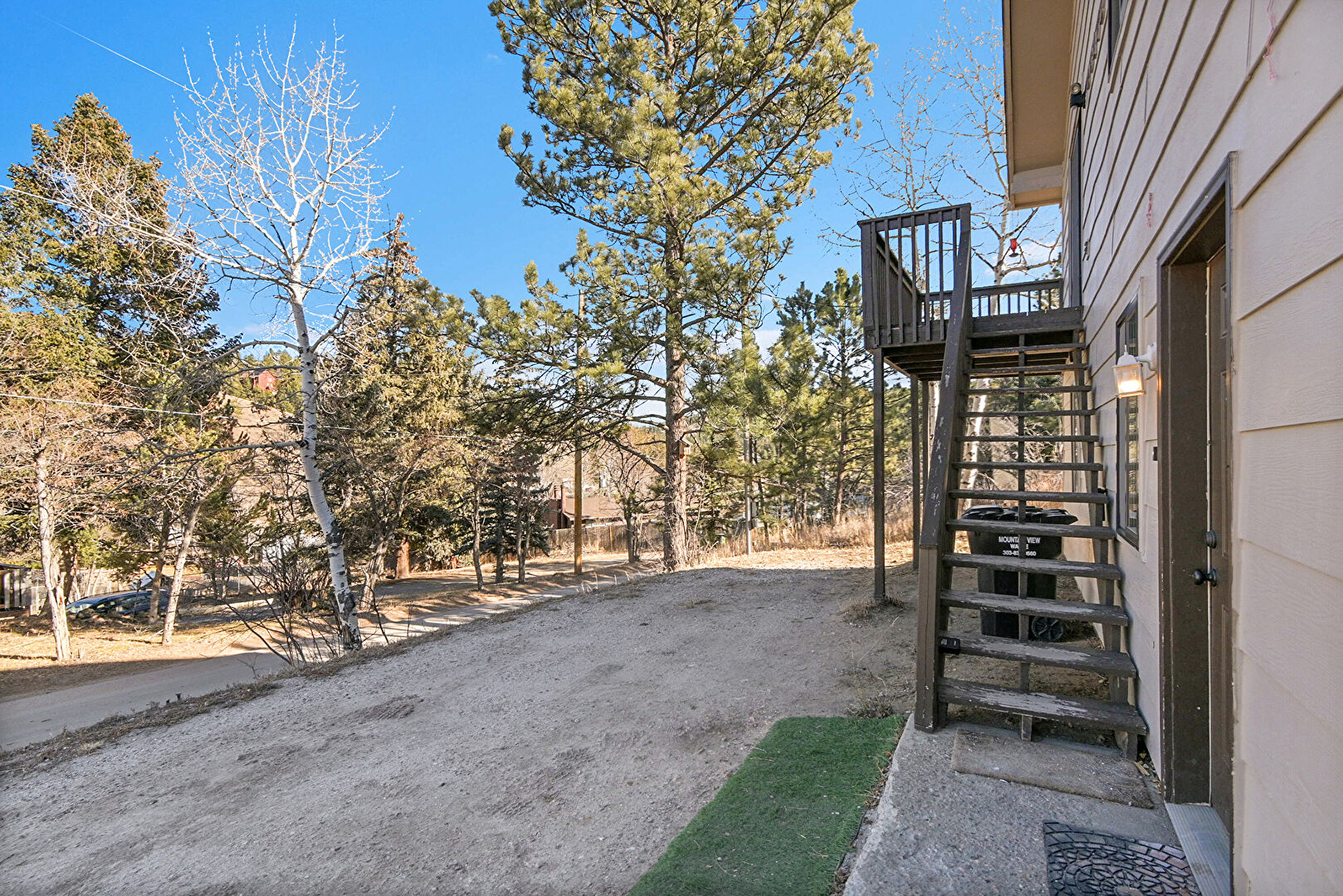 Basement Walk Out, Chimney, Concrete Foundation, Deck, Downspout, Fence, Gutters, Horizontal Siding, Lawn, Shingle Roof, Stairs, Stoop, Woods View, Chimney, Fence, Lawn, Stairs