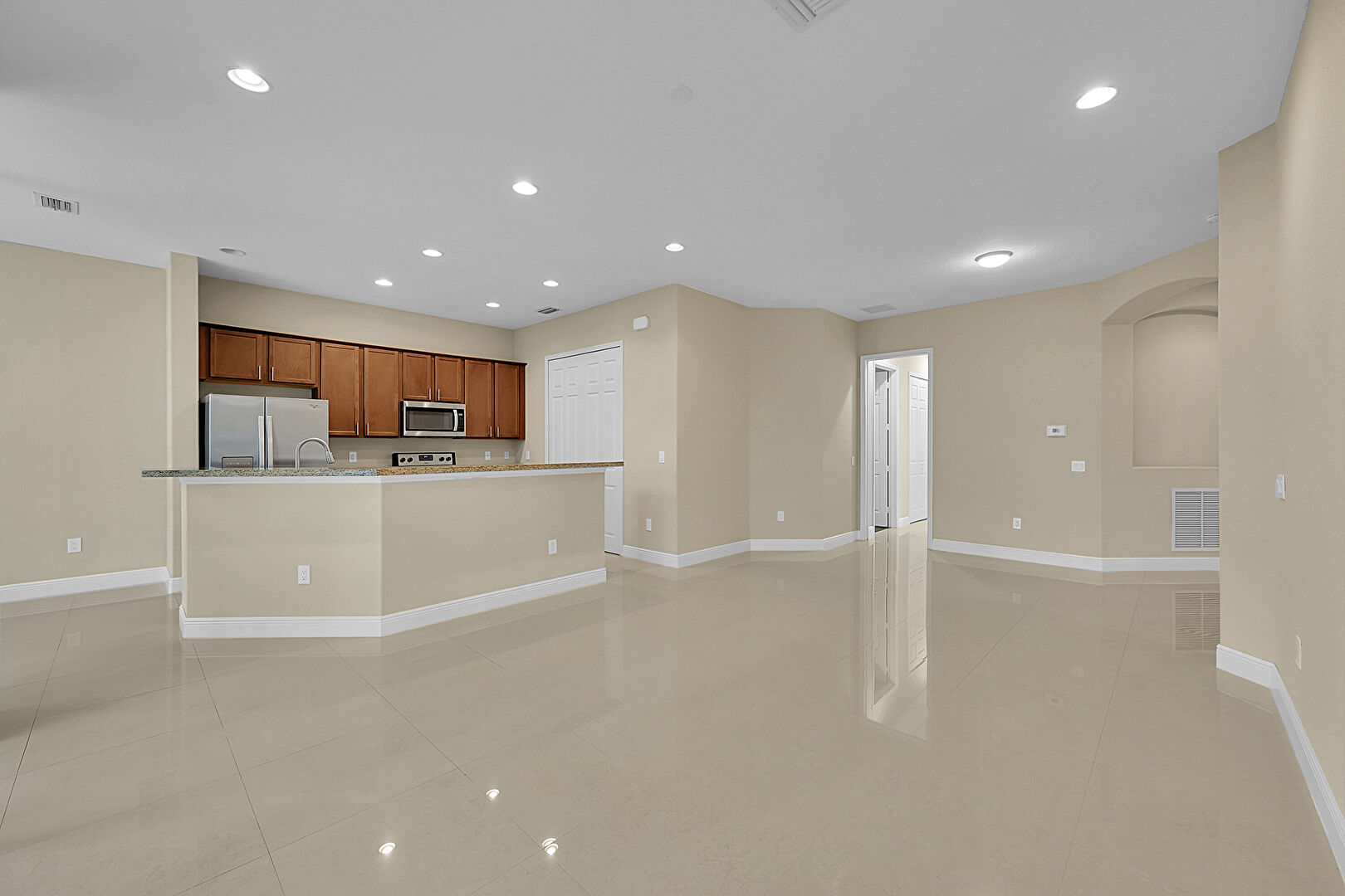 Arched Walkways, Baseboards Wall, Drywall, Kitchen Island, Medium Brown Cabinets, Opens To Living Area, Recessed Lighting, Shaker Cabinets, Stone Countertops, Tile Floor, Vent, Baseboards Wall, Recessed Lighting