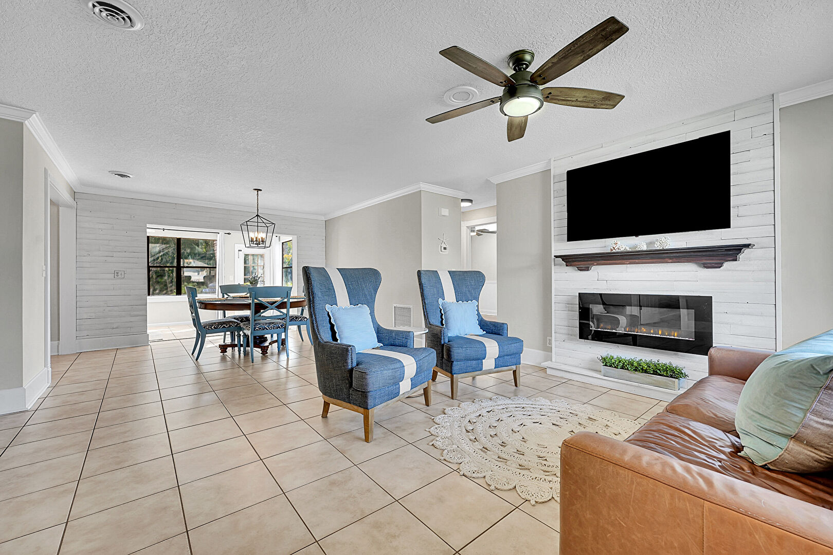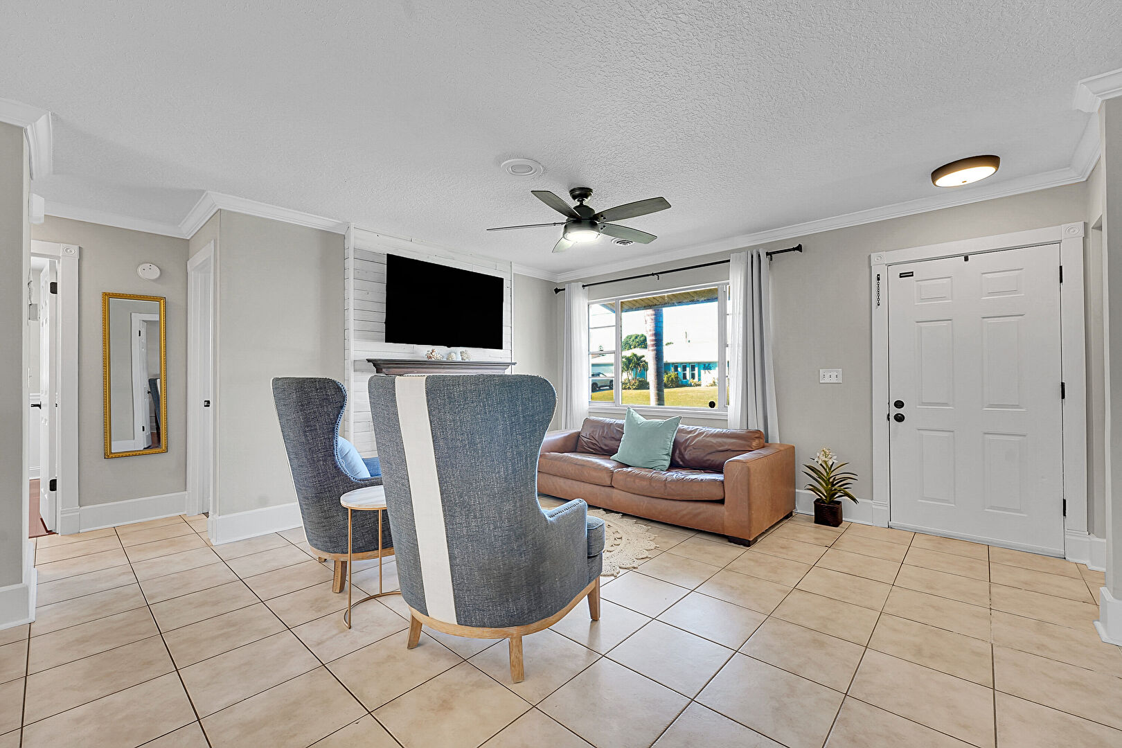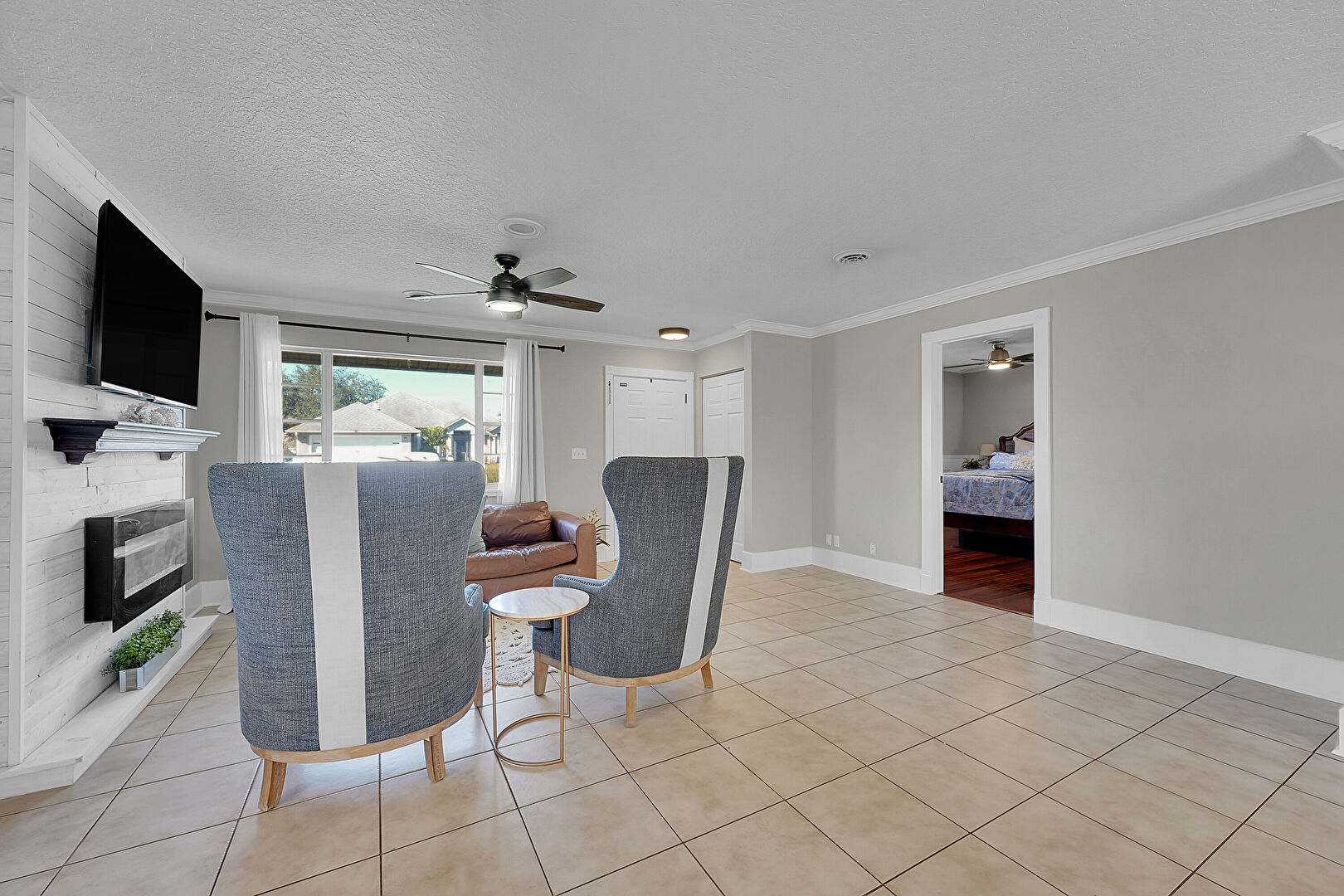 Baseboards Wall, Ceiling Fan, Crown Molding, Drywall, Fireplace, Natural Light, Notable Chandelier, Textured Ceiling, Tile Floor, Vent, Drywall, Tile Floor, Vent