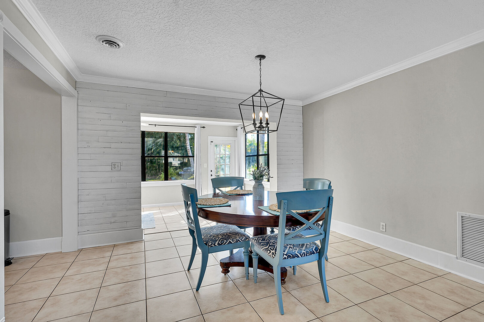 Baseboards Wall, Crown Molding, Drywall, Natural Light, Notable Chandelier, Textured Ceiling, Vent, Wood Wall, Tile Floor