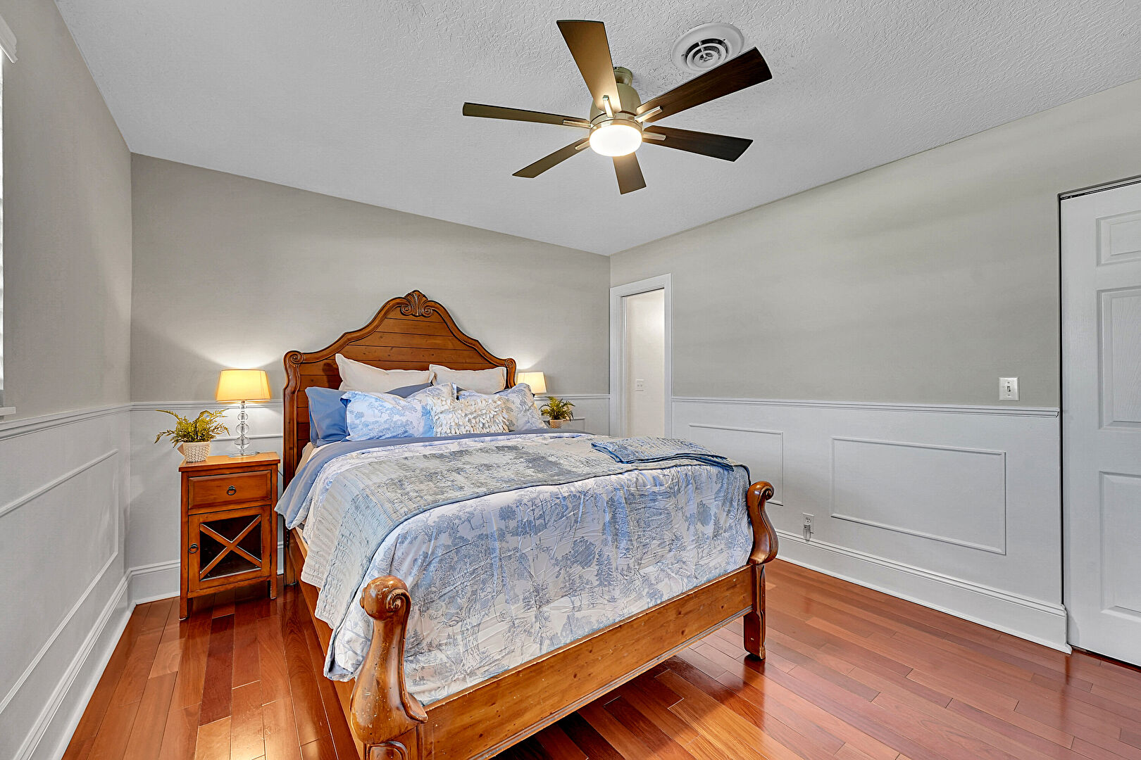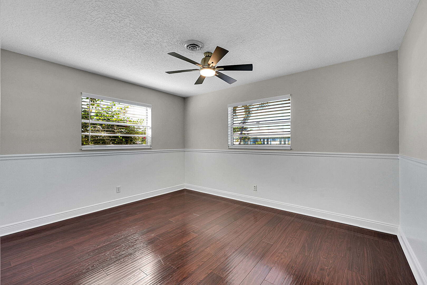 Ceiling Fan, Drywall, Natural Light, Paneling Wall, Textured Ceiling, Vent, Wainscot Wall, Wood Finish Floor, Textured Ceiling, Wainscot Wall