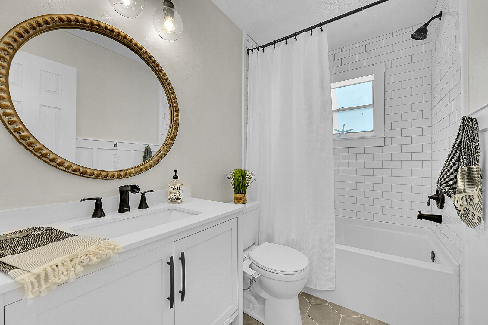 Combined Bath Shower, Drywall, Natural Light, Tile Floor, Vanity, Full Bathroom