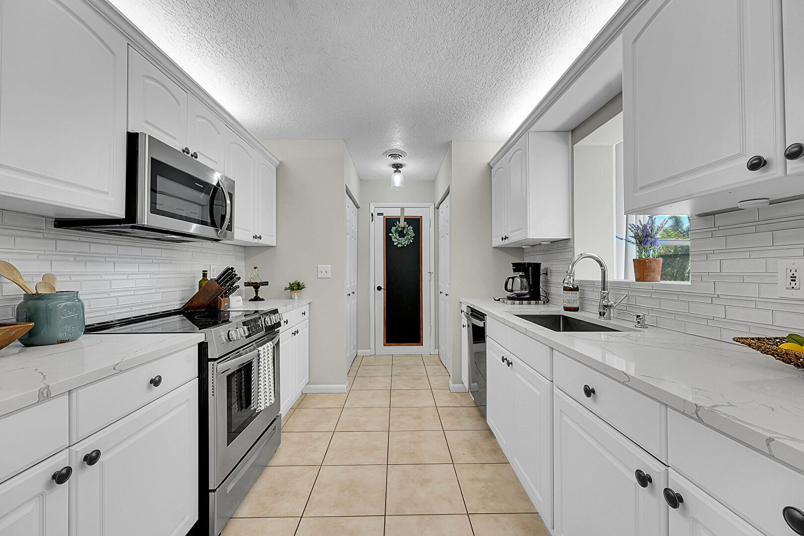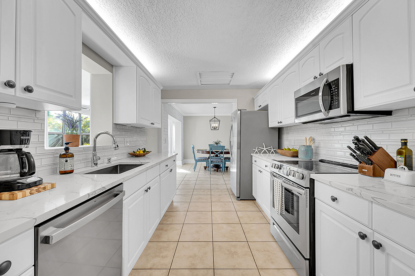 Arched Cabinets, Baseboards Wall, Crown Molding Cabinets, Drywall, Natural Light, Pendant Lighting, Raised Cabinets, Stone Countertops, Textured Ceiling, Tile Floor, Natural Light, Raised Cabinets