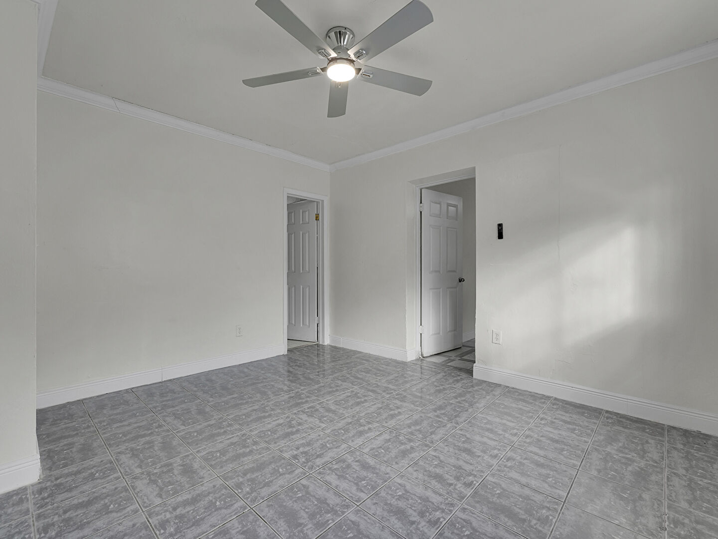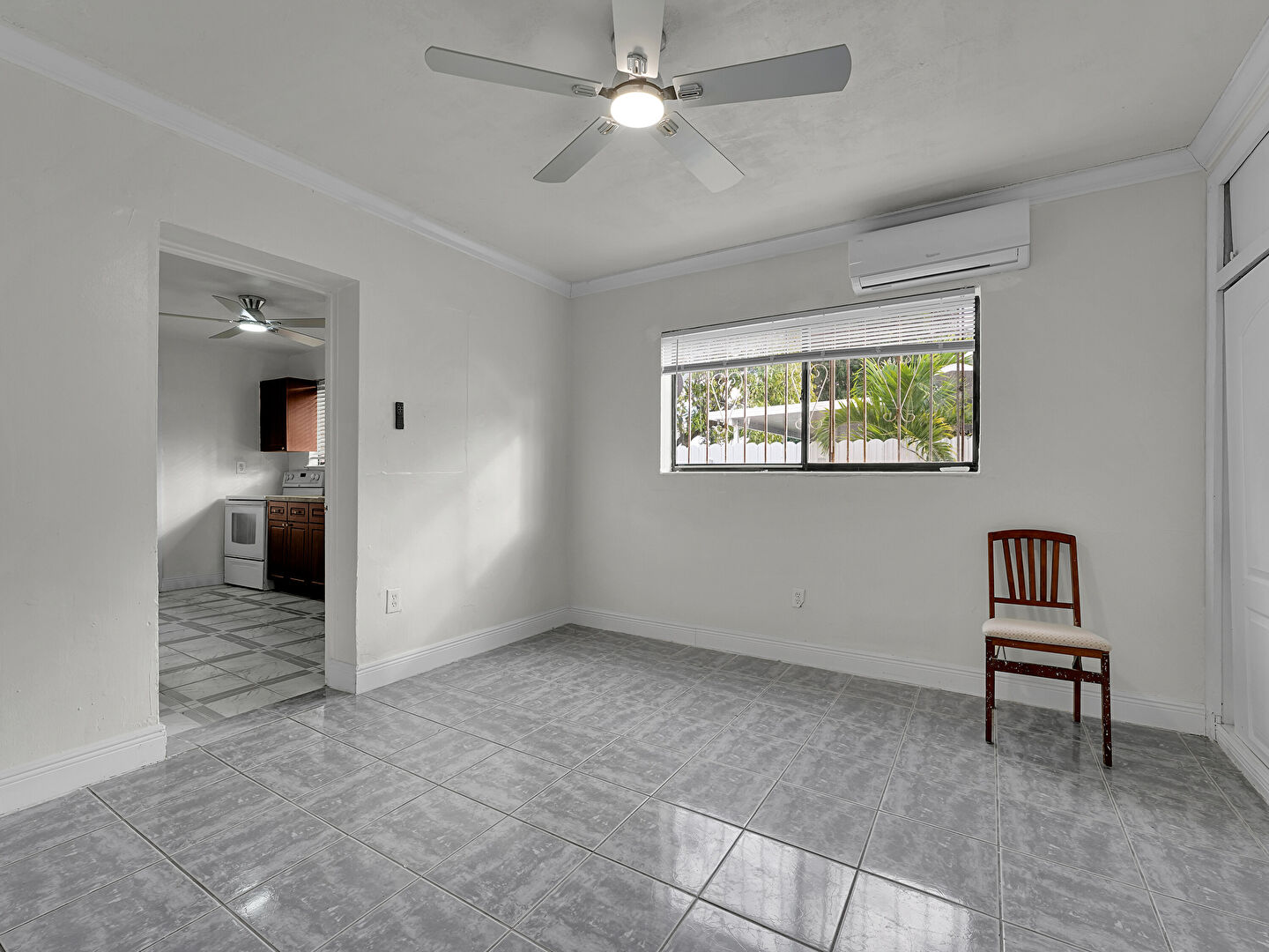 Baseboards Wall, Ceiling Fan, Closet, Crown Molding, Drywall, Ensuite Bathroom, Natural Light, Tile Floor, Vent, Wall Mounted Ac, Baseboards Wall, Ceiling Fan, Inlaid Floor, Tile Floor