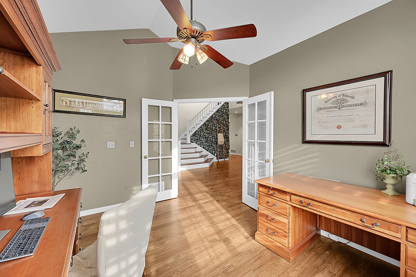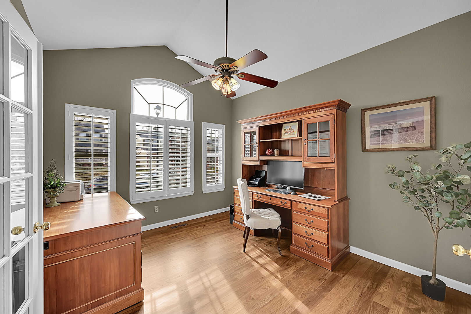 Baseboards Wall, Built In Desk, Cathedral Ceiling, Ceiling Fan, Drywall, High Ceiling, Office Area, Vaulted Ceiling, Wood Finish Floor, French Doors, Natural Light