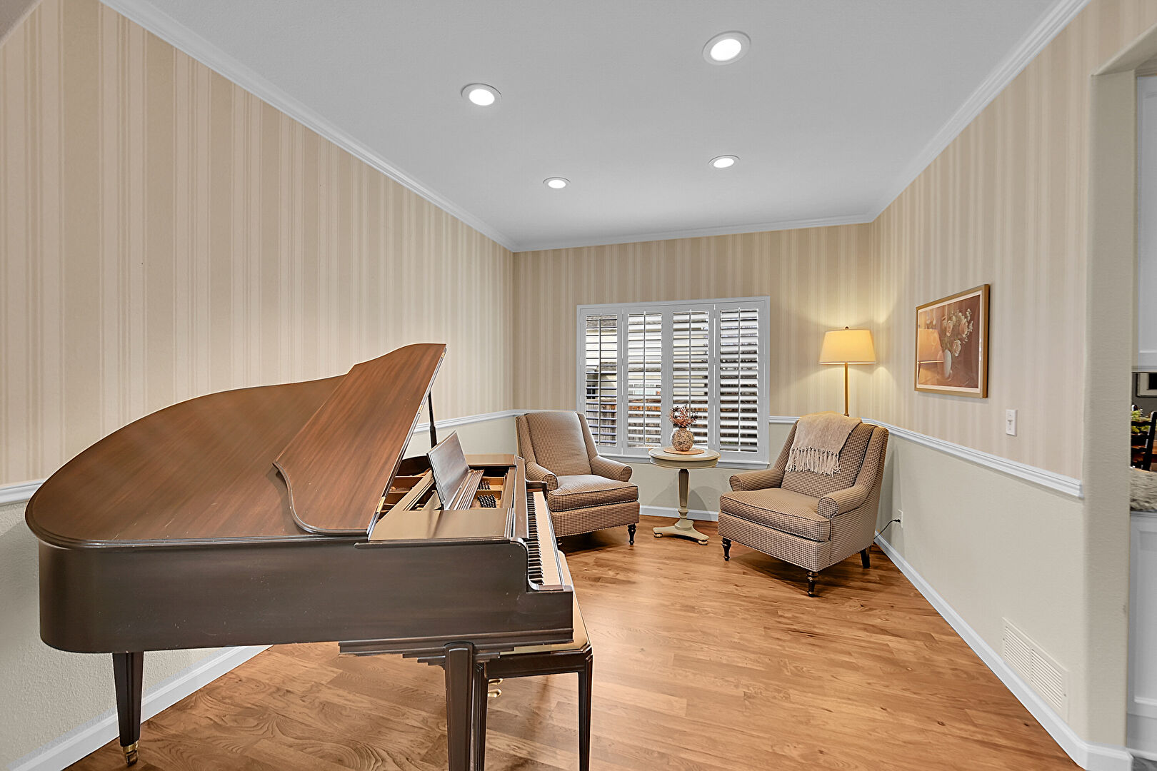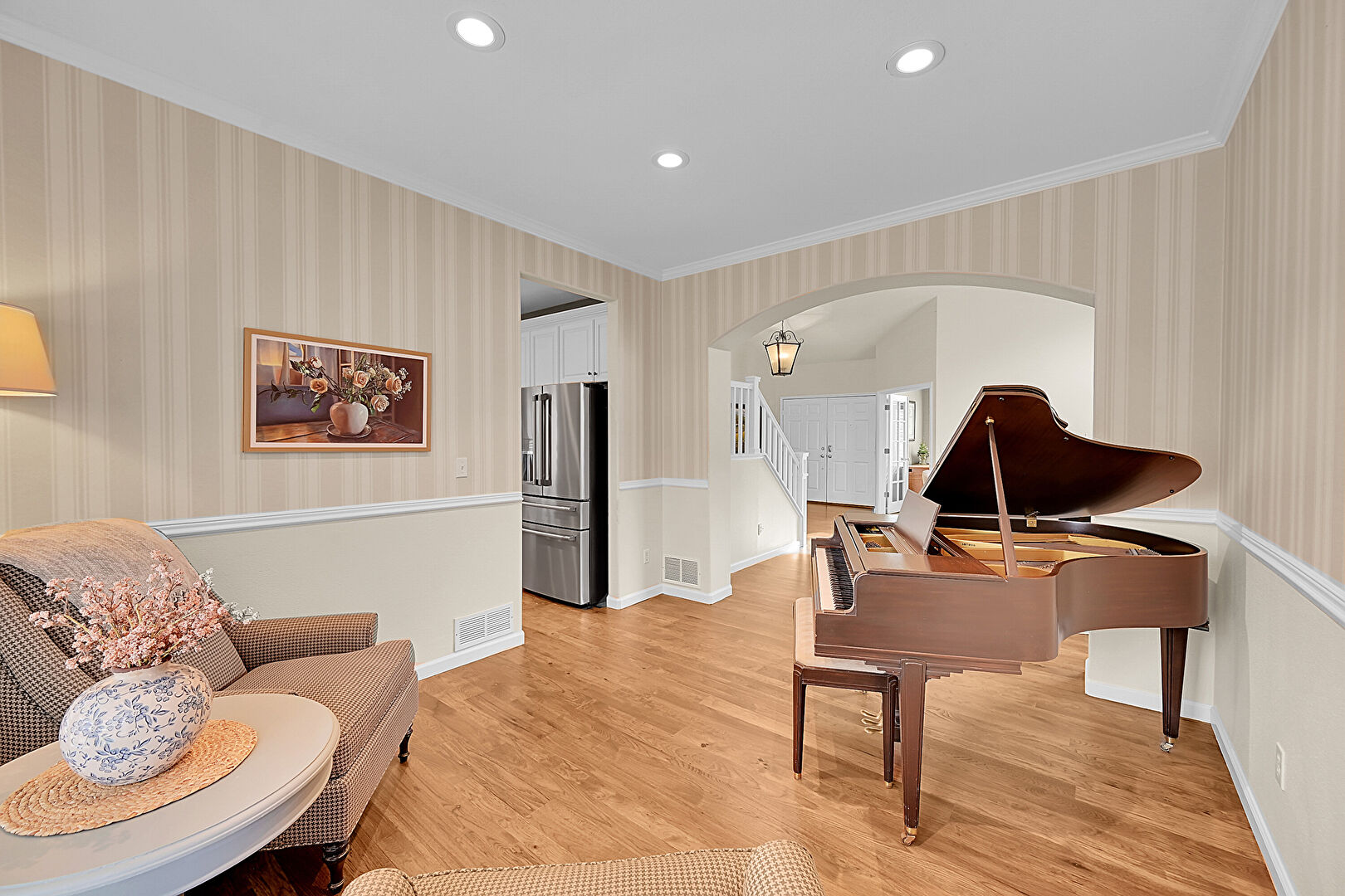 Arched Walkways, Baseboards Wall, Crown Molding, Drywall, Natural Light, Recessed Lighting, Stairs, Vent, Wallpaper Wall, Wood Finish Floor, Wallpaper Wall, Wood Finish Floor