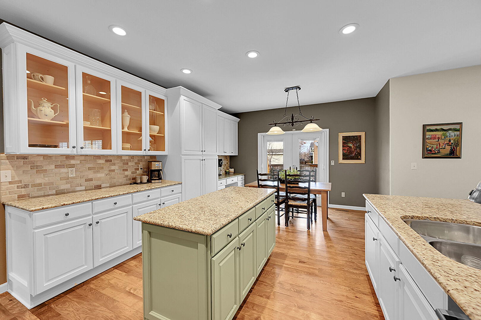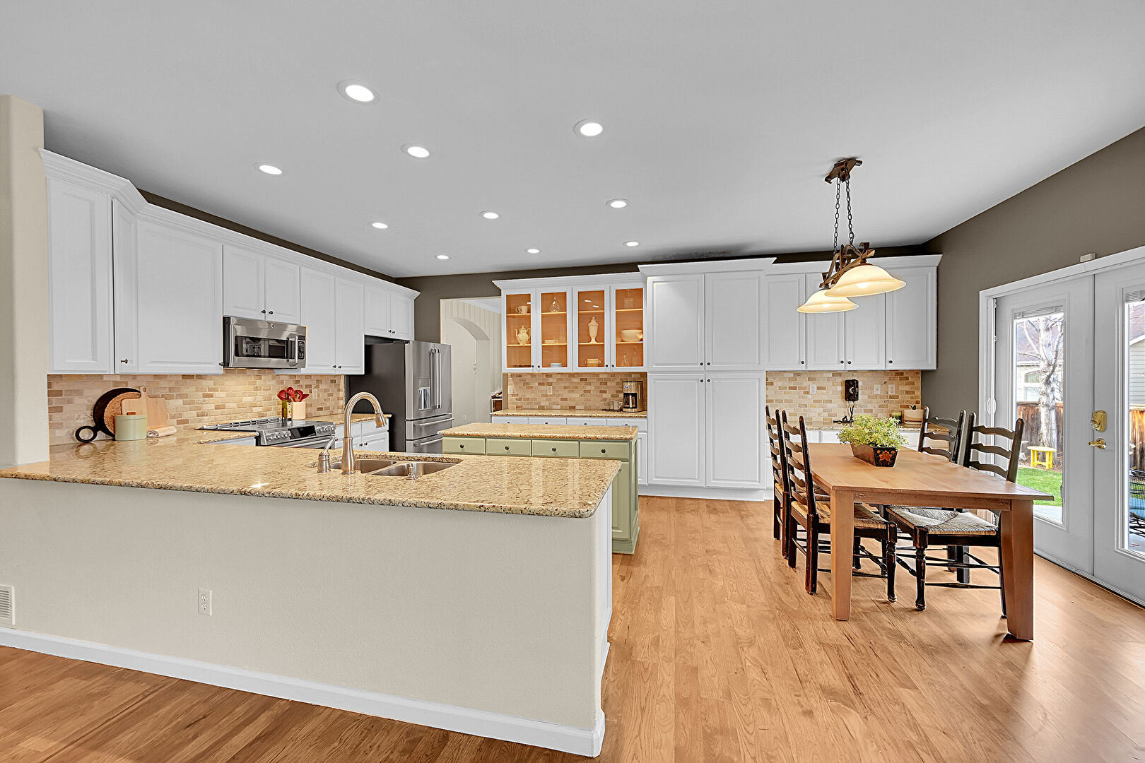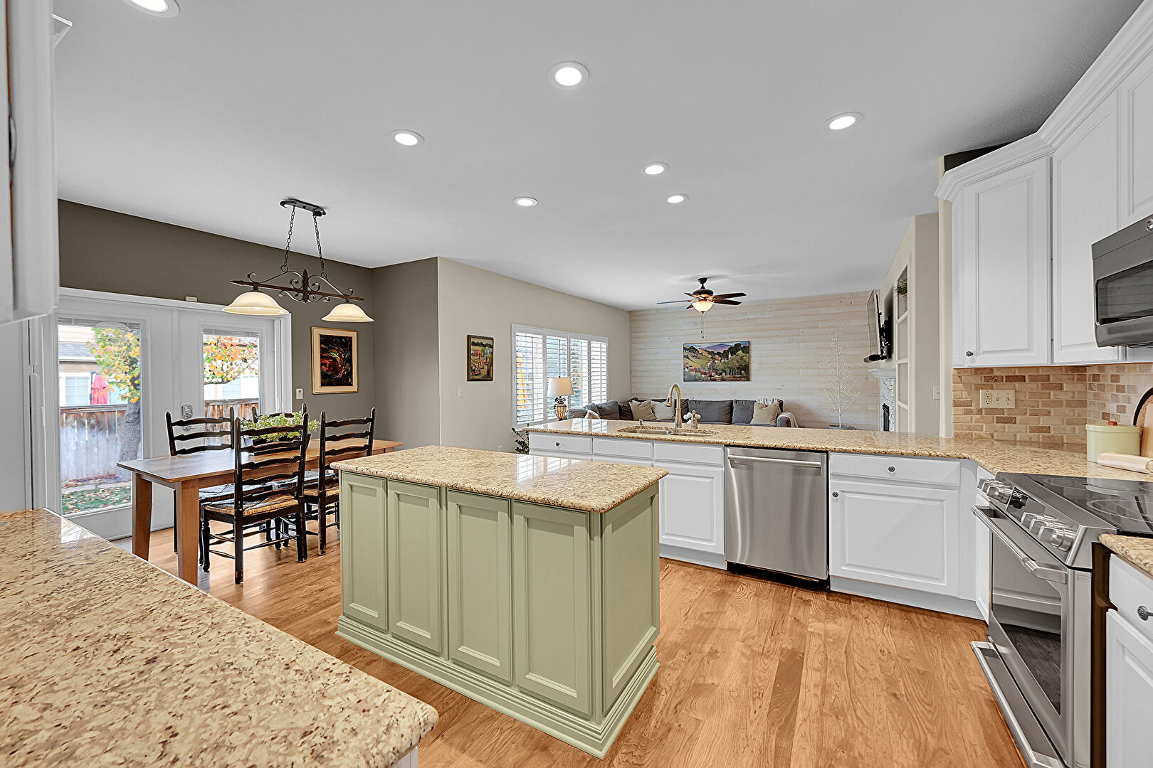 Baseboards Wall, Ceiling Fan, Crown Molding Cabinets, Drywall, Fireplace, French Doors, Glass Insert Cabinets, Green Cabinets, Kitchen Bar, Kitchen Island, Kitchen Peninsula, Natural Light, Open Shelves, Opens To Living Area, Pendant Lighting, Raised Cabinets, Recessed Lighting, Stone Countertops, Tile Countertops, Tile Floor, U Shaped Kitchen, Vent, Wood Finish Floor, Drywall, Kitchen Island, Natural Light, Opens To Living Area, Raised Cabinets, Stone Countertops, Vent