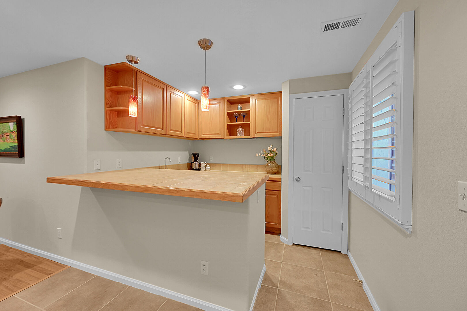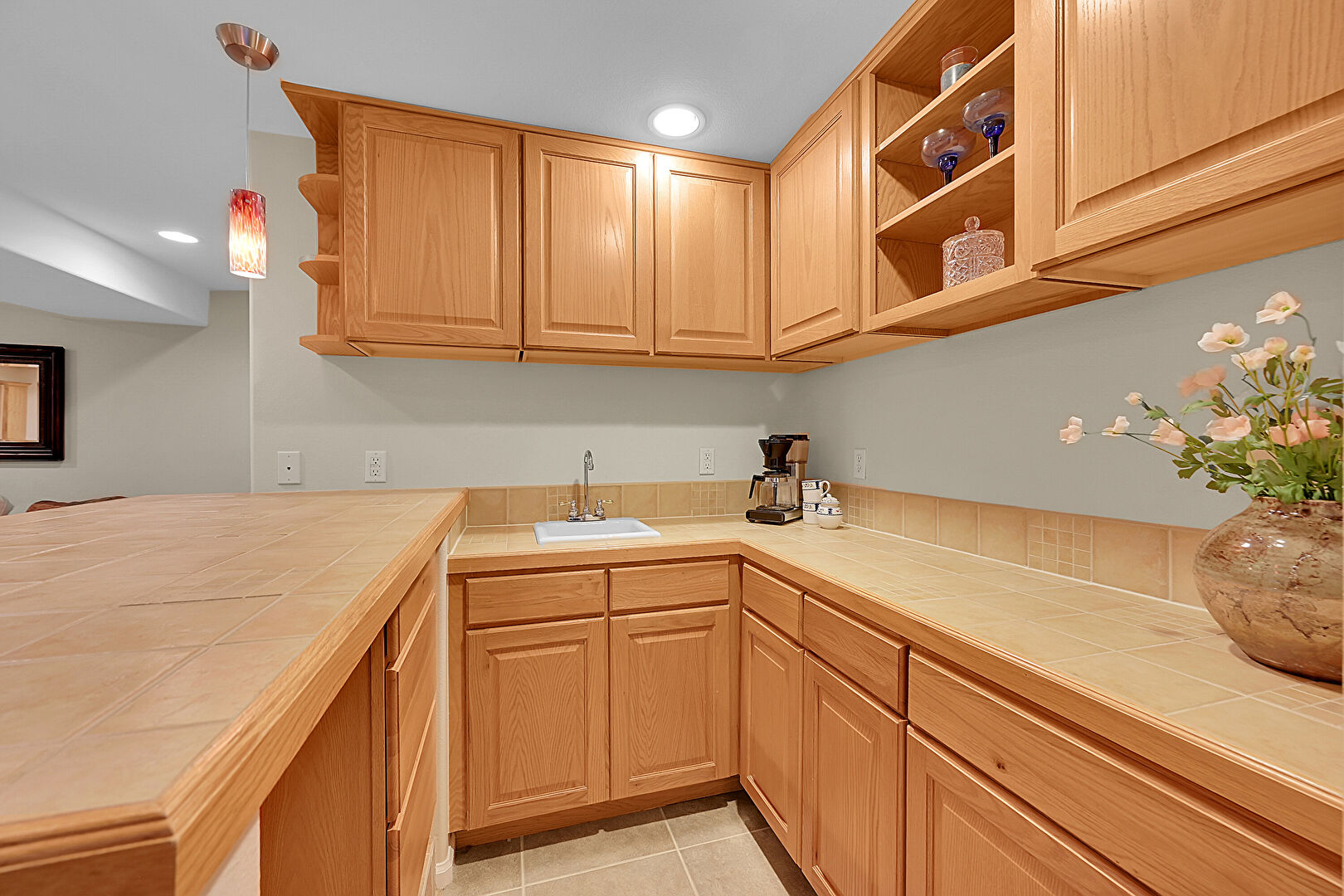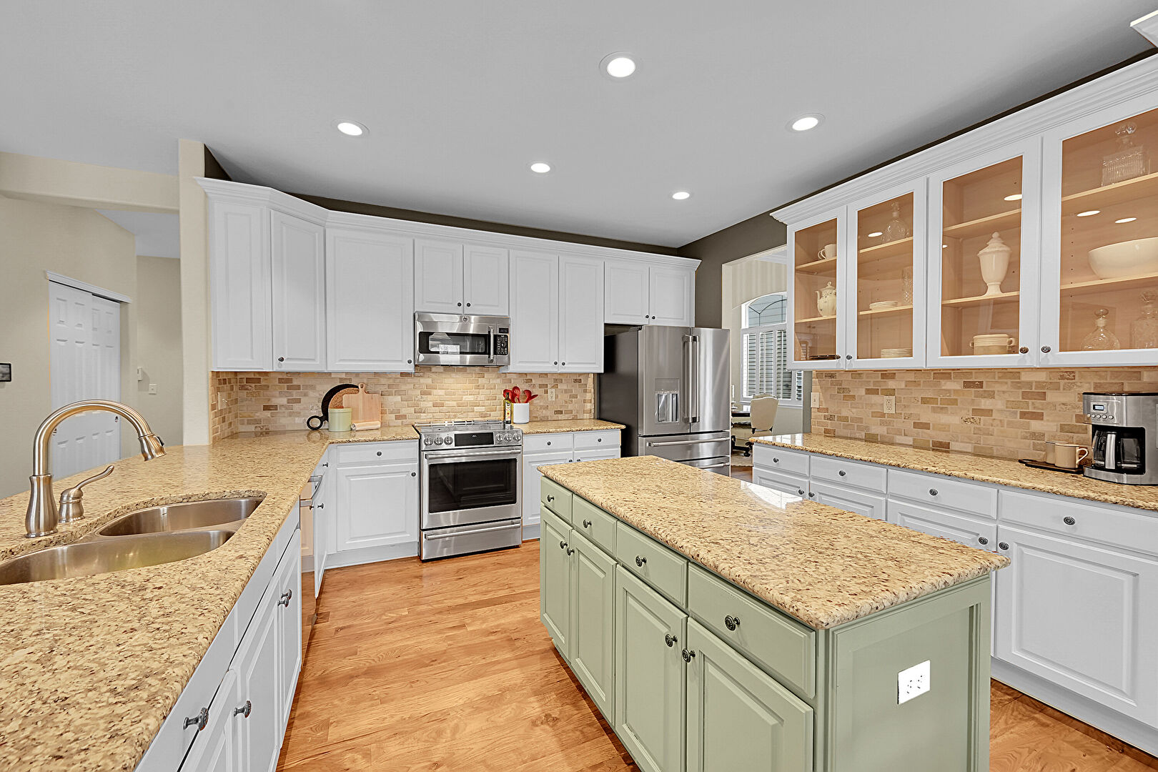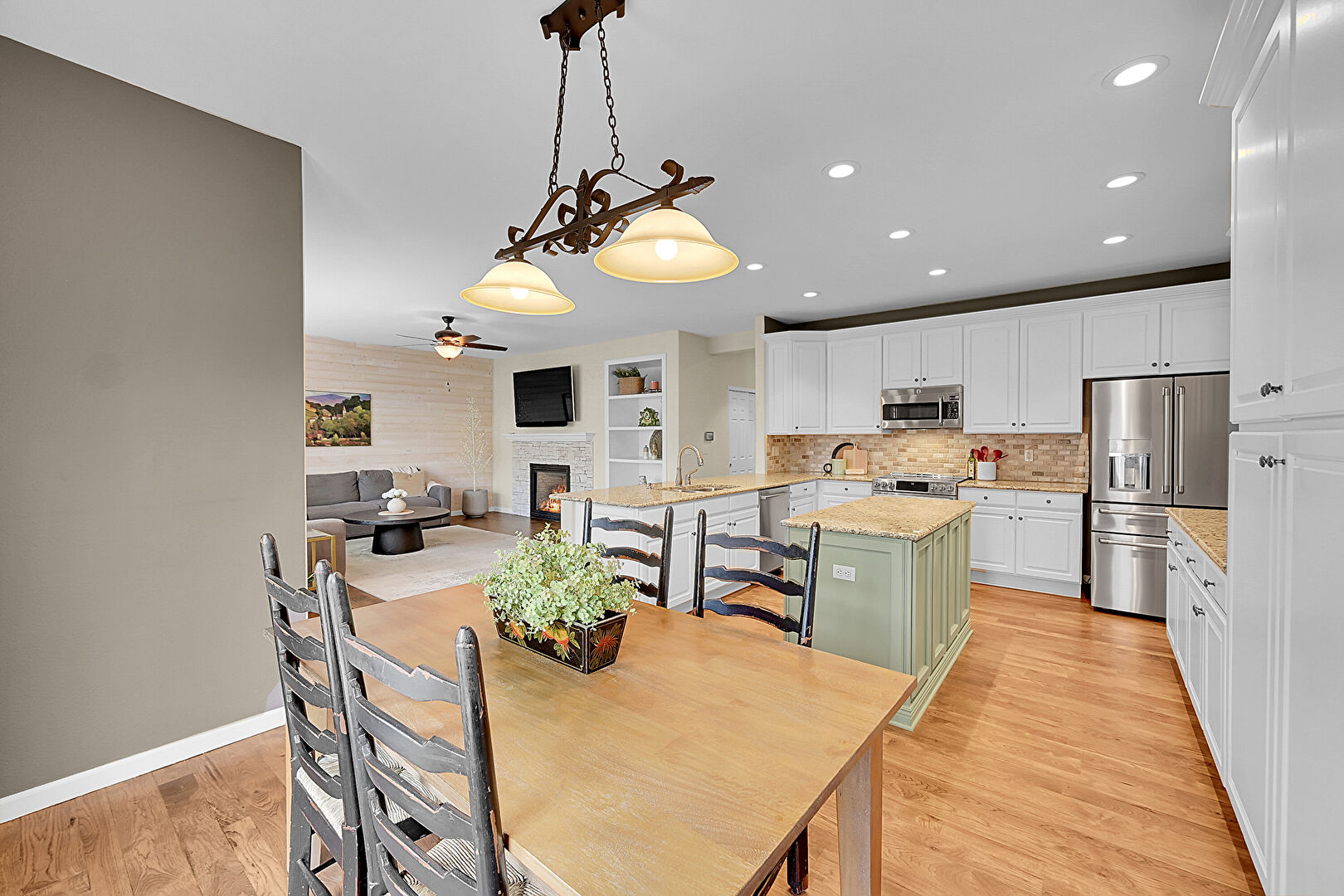 Baseboards Wall, Ceiling Fan, Crown Molding Cabinets, Drywall, Fireplace, French Doors, Glass Insert Cabinets, Green Cabinets, Kitchen Bar, Kitchen Island, Kitchen Peninsula, Natural Light, Open Shelves, Opens To Living Area, Pendant Lighting, Raised Cabinets, Recessed Lighting, Stone Countertops, Tile Countertops, Tile Floor, U Shaped Kitchen, Vent, Wood Finish Floor, Drywall, Kitchen Island, Natural Light, Opens To Living Area, Raised Cabinets, Stone Countertops, Vent