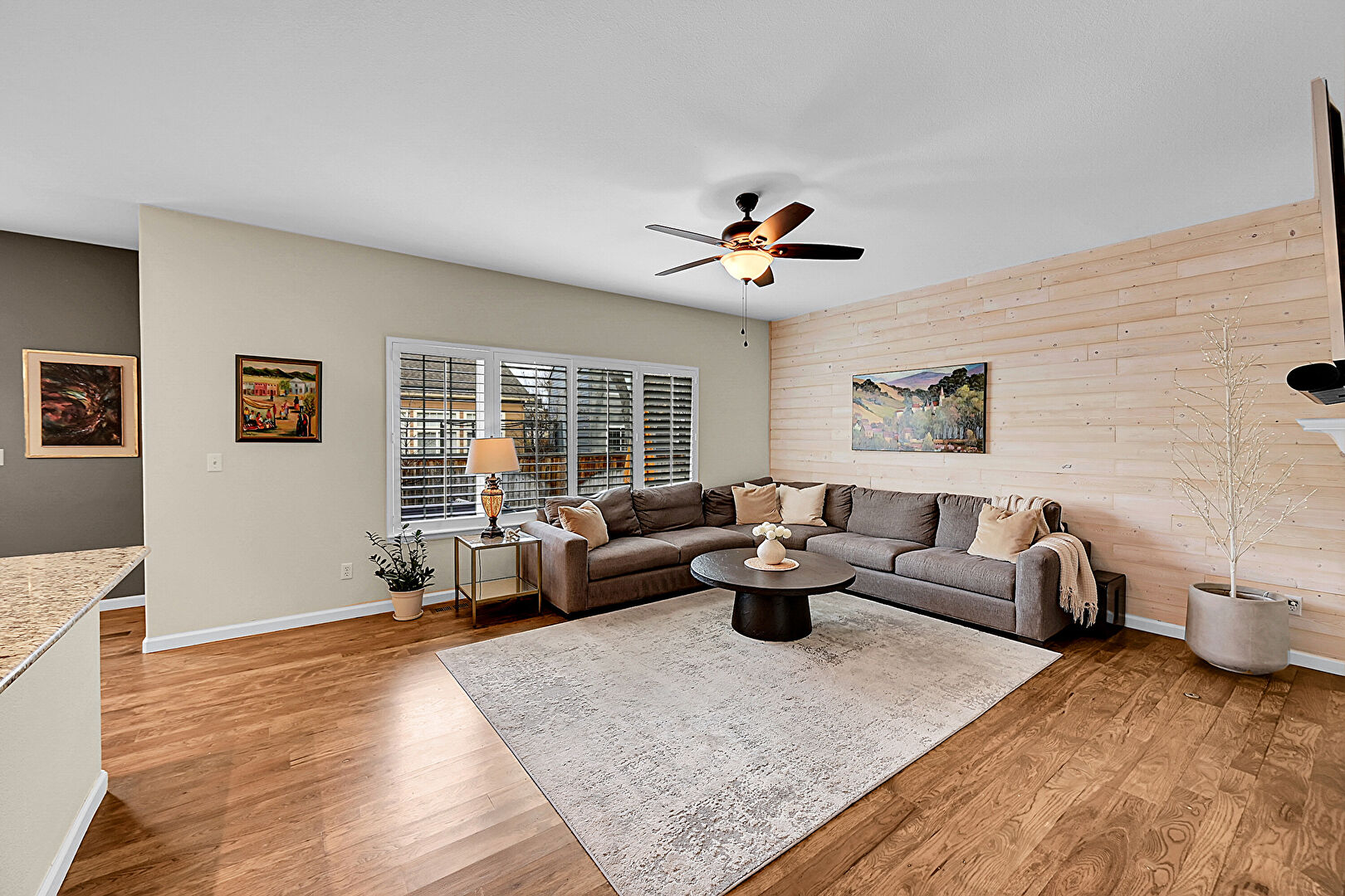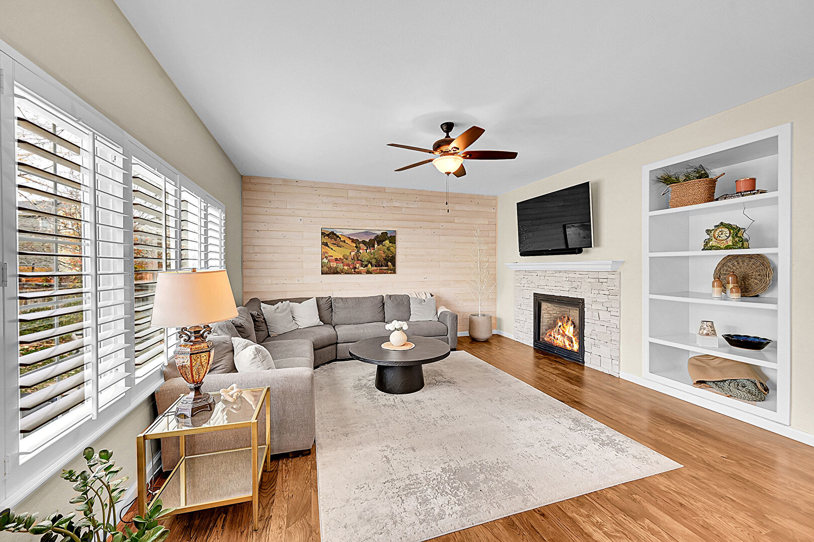 Accent Wall, Baseboards Wall, Built In Shelves, Ceiling Fan, Drywall, Fireplace, G Shaped Kitchen, Natural Light, Recessed Lighting, Vent, Wood Finish Floor, Wood Wall, Baseboards Wall, Natural Light, Wood Wall