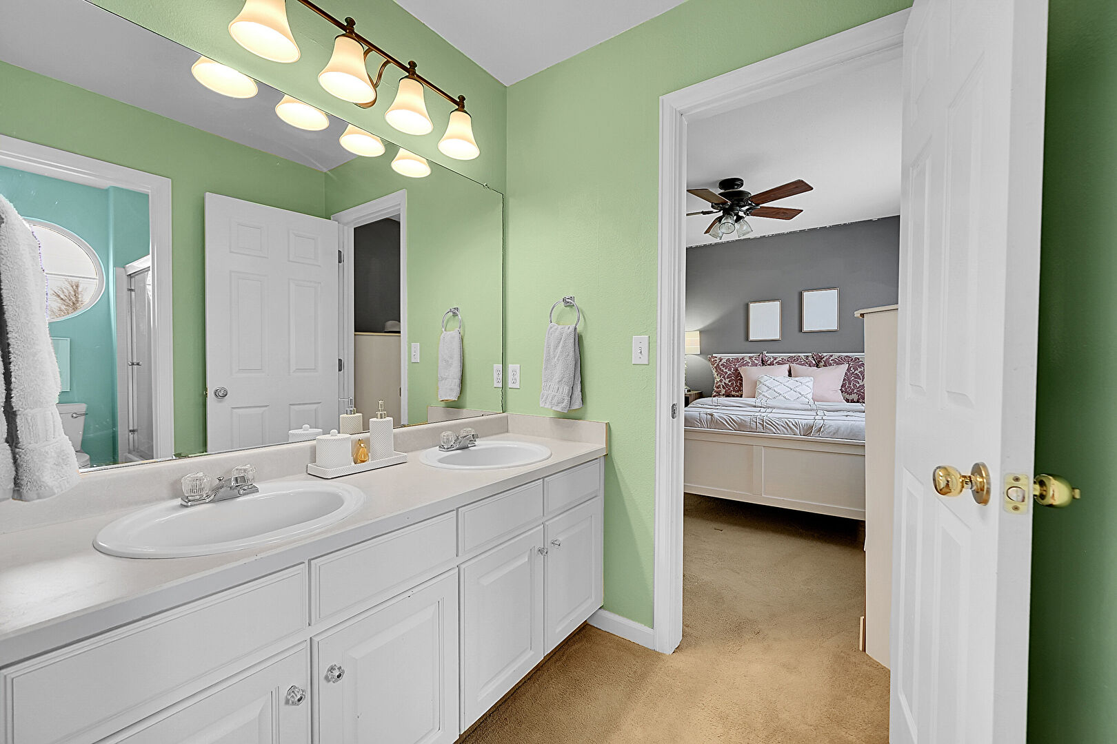 Baseboards Wall, Carpet, Ceiling Fan, Combined Bath Shower, Double Vanity, Drywall, Full Bathroom, Half Bathroom, Natural Light, Textured Wall, Tile Floor, Vanity, Vent, Baseboards Wall, Ensuite Bathroom, Full Bathroom, Tile Floor, Wood Finish Floor