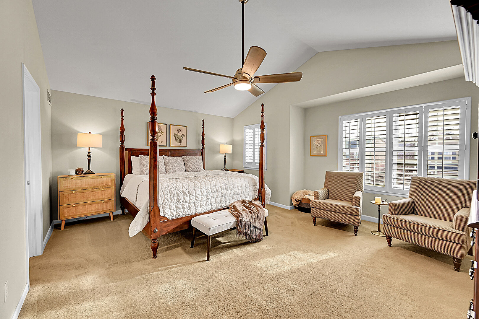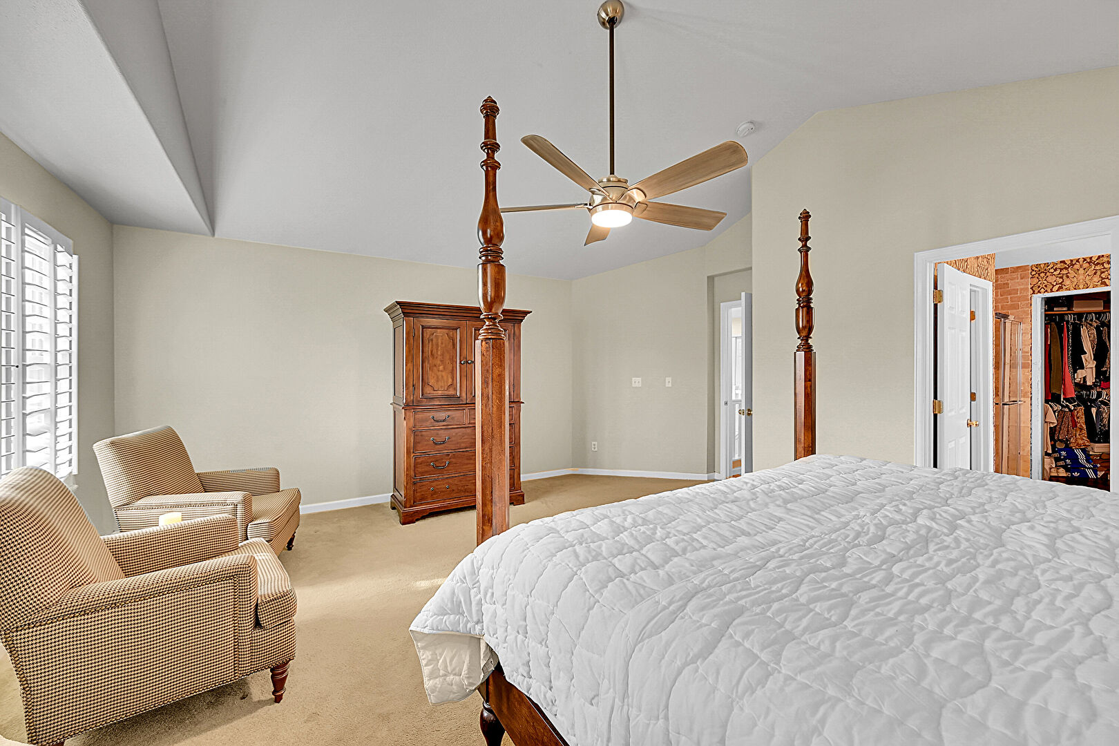 Baseboards Wall, Carpet, Ceiling Fan, Drywall, Natural Light, Vaulted Ceiling, Walk In Closet, Cathedral Ceiling, Ceiling Fan