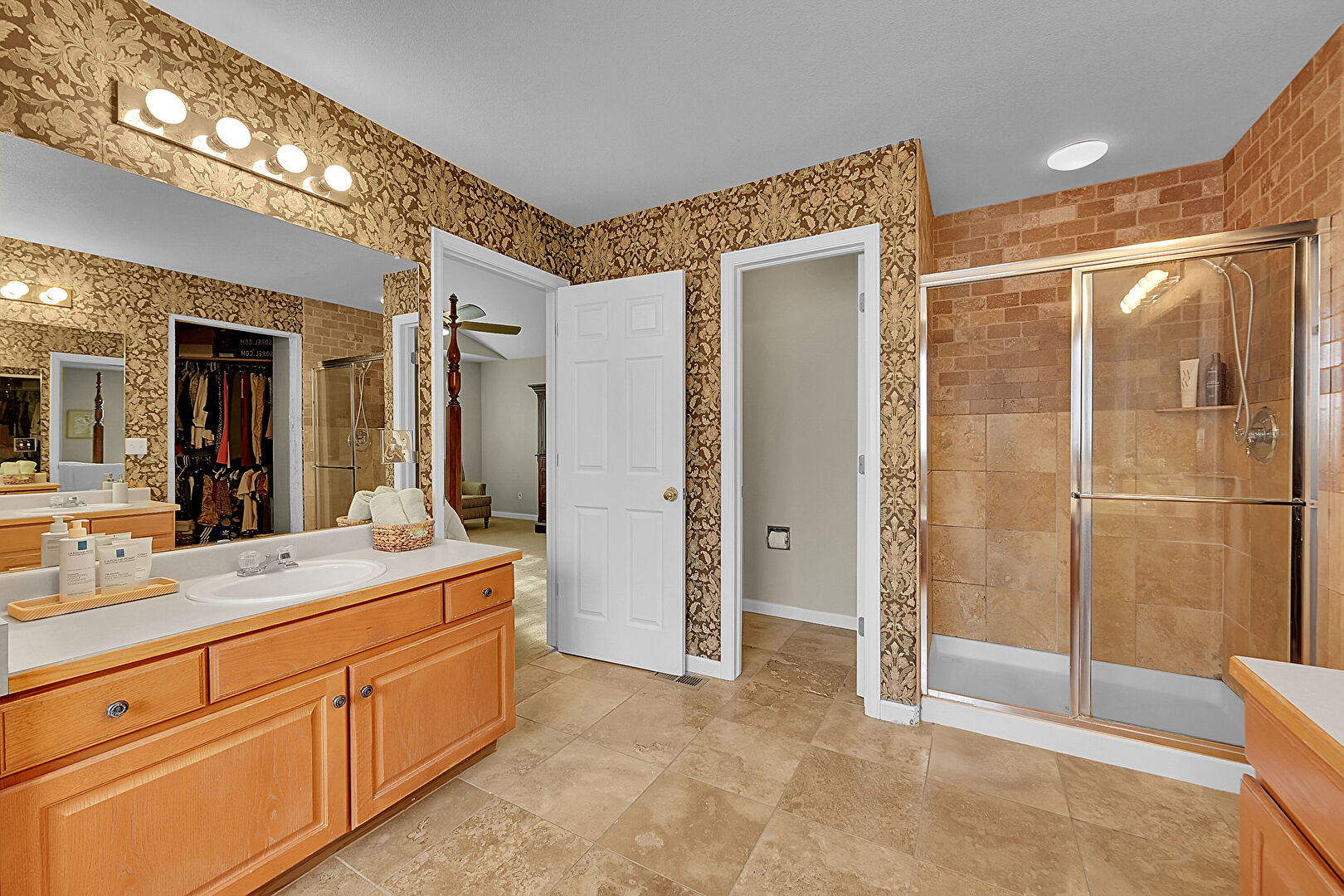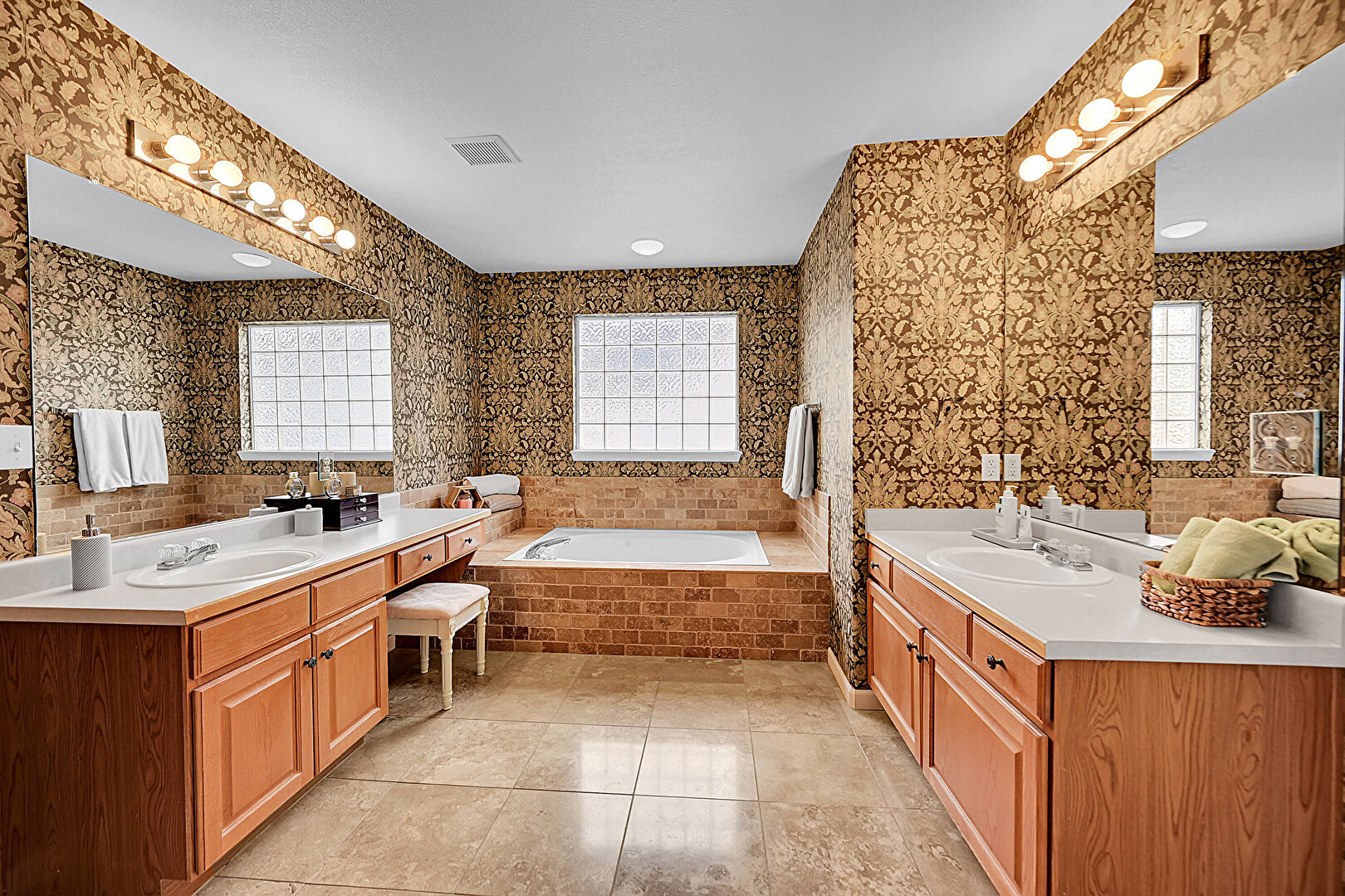 Baseboards Wall, Full Bathroom, Natural Light, Tile Floor, Vent, Walk In Closet, Wallpaper Wall, Two Single Vanities, Vanity