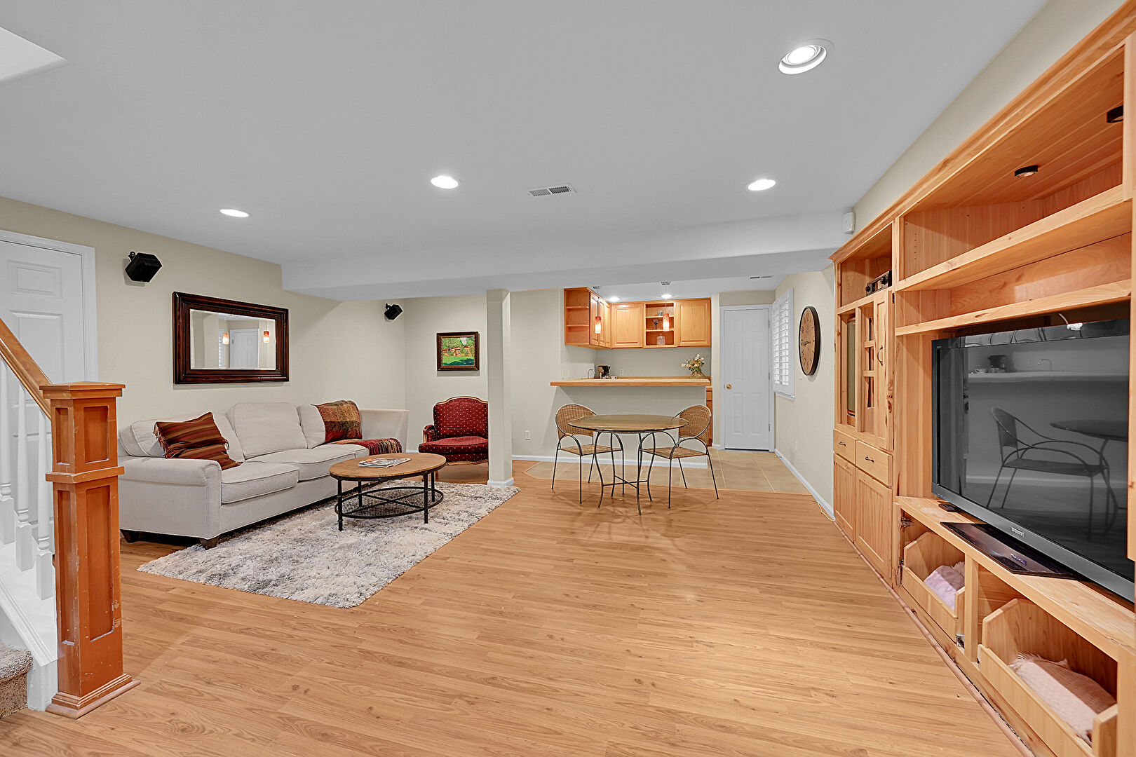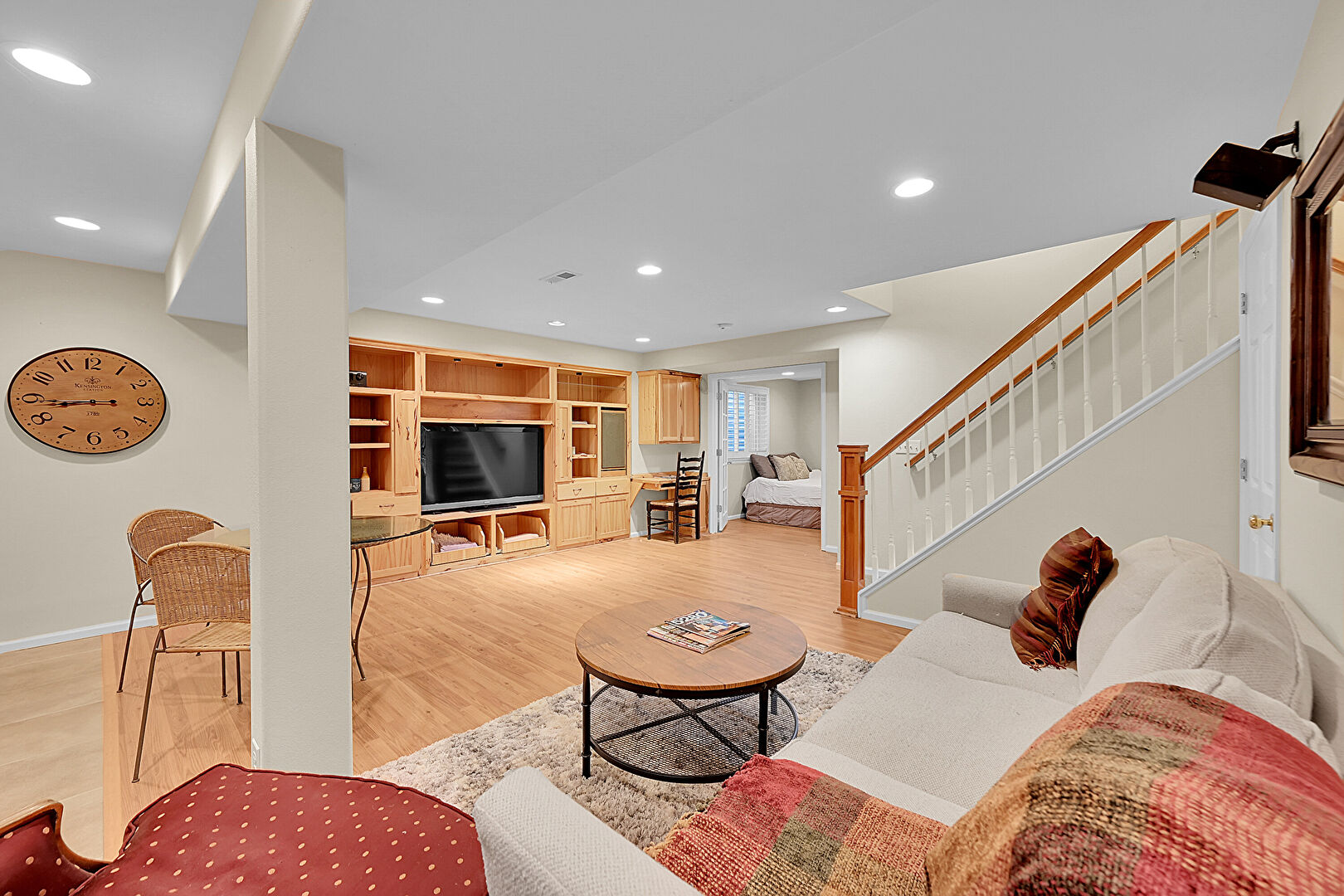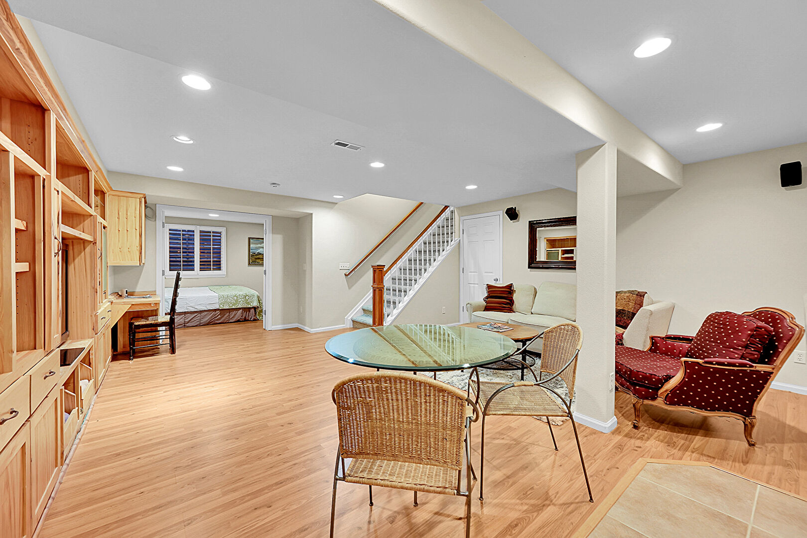 Baseboards Wall, Basement, Drywall, Office Area, Recessed Lighting, Stairs, Vent, Wood Finish Floor, Baseboards Wall, Basement, Stairs