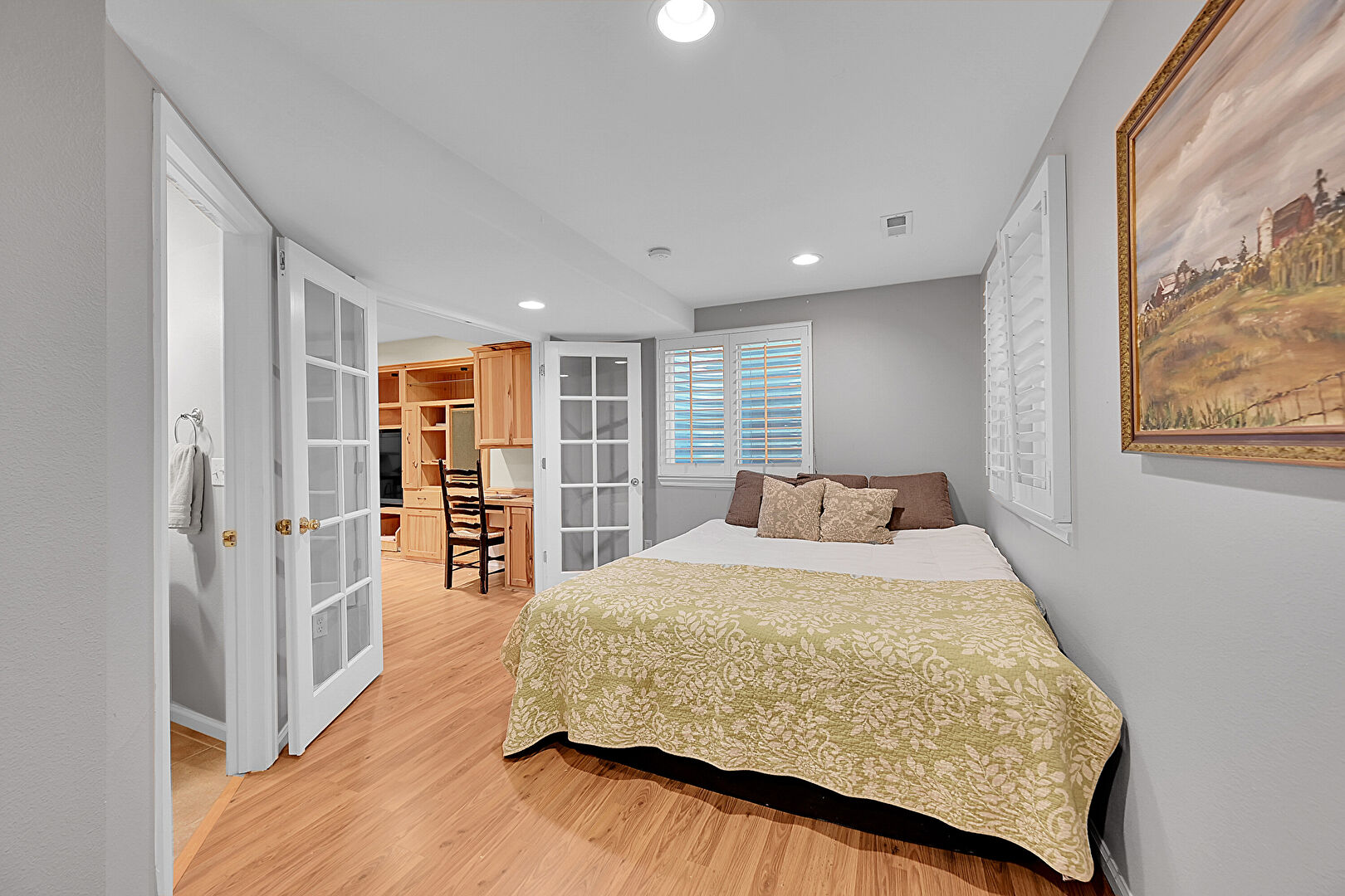 Baseboards Wall, Carpet, Ceiling Fan, Drywall, Ensuite Bathroom, French Doors, Natural Light, Office Area, Recessed Lighting, Textured Wall, Vent, Wood Finish Floor, Baseboards Wall, Ceiling Fan, Vent