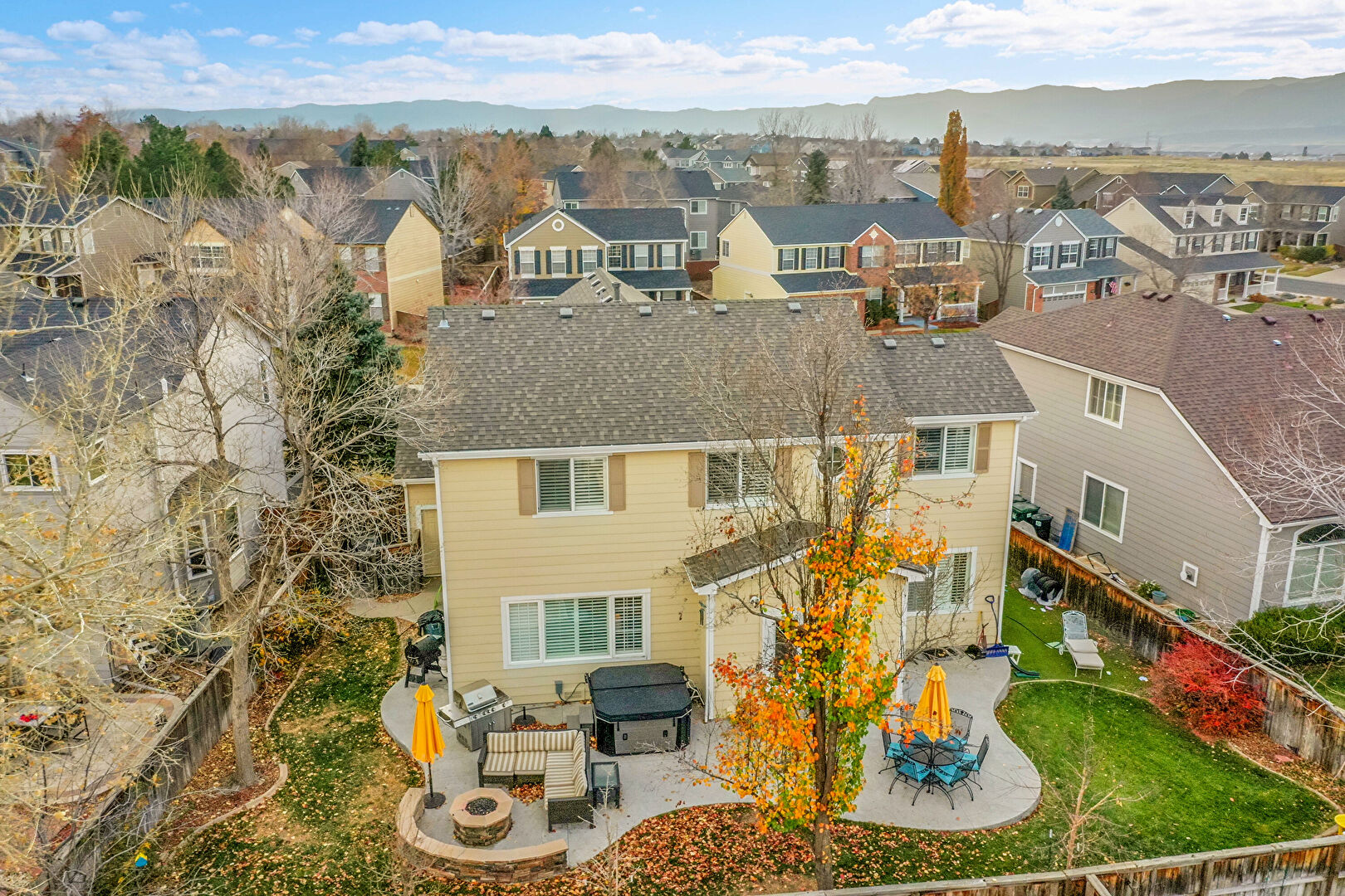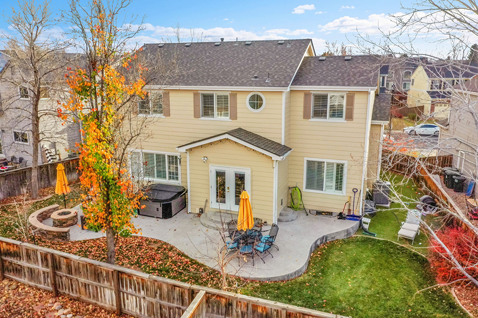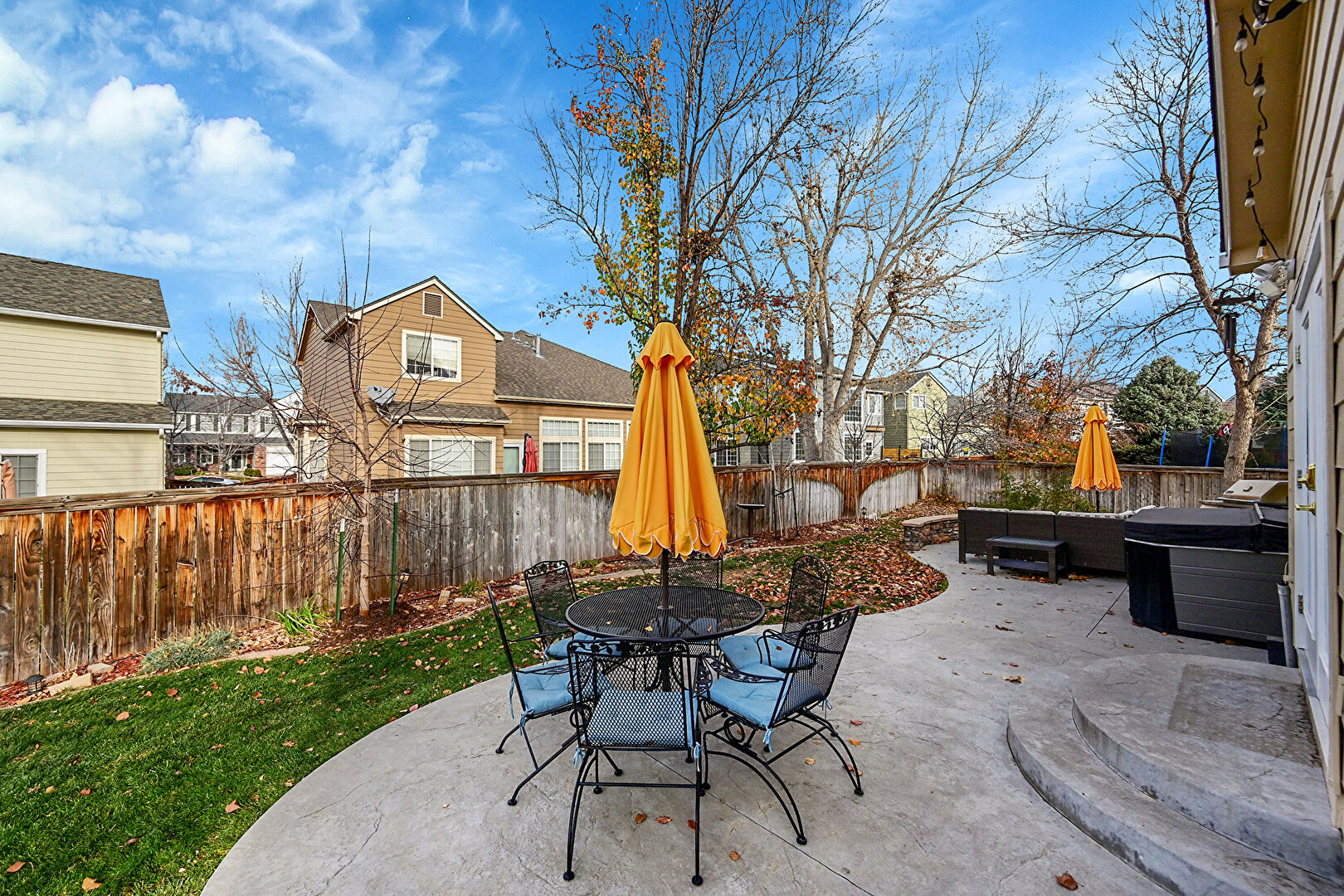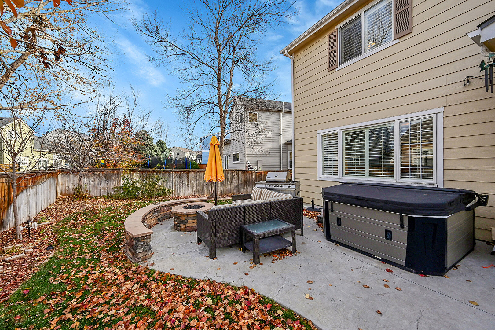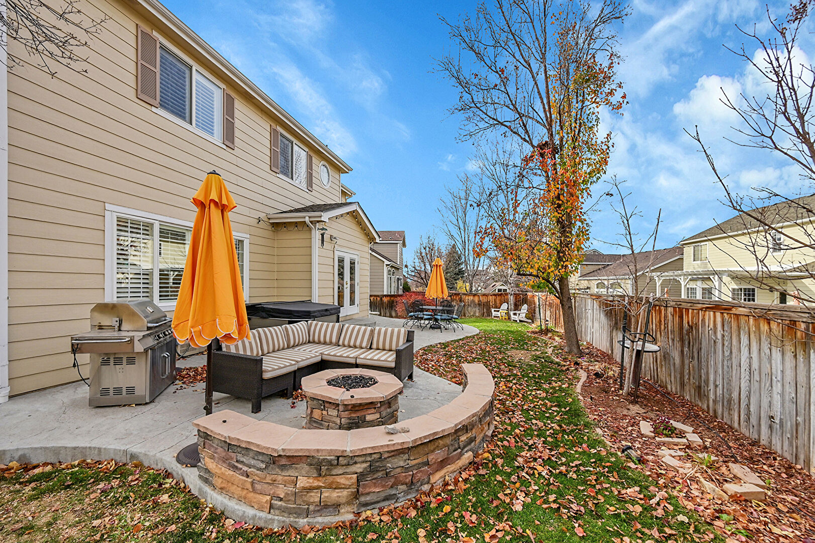 Fence, Fire Pit, Grill, Hot Tub, Lawn, Patio, Residential View, Outdoor Dining Area, Outdoor Living Space