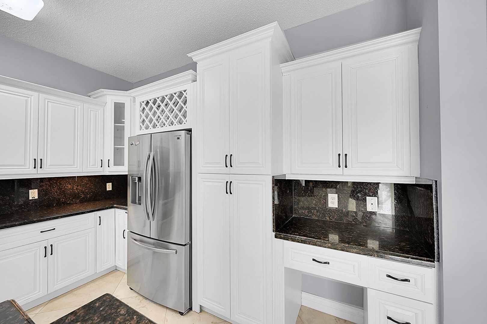Baseboards Wall, Built In Desk, Crown Molding Cabinets, Drywall, G Shaped Kitchen, Glass Insert Cabinets, Kitchen Peninsula, Natural Light, Office Area, Open Shelves, Opens To Living Area, Pendant Lighting, Raised Cabinets, Recessed Lighting, Stone Countertops, Textured Ceiling, Tile Floor, Toaster, Vent, Glass Insert Cabinets, Kitchen Peninsula, Stone Countertops, Textured Ceiling