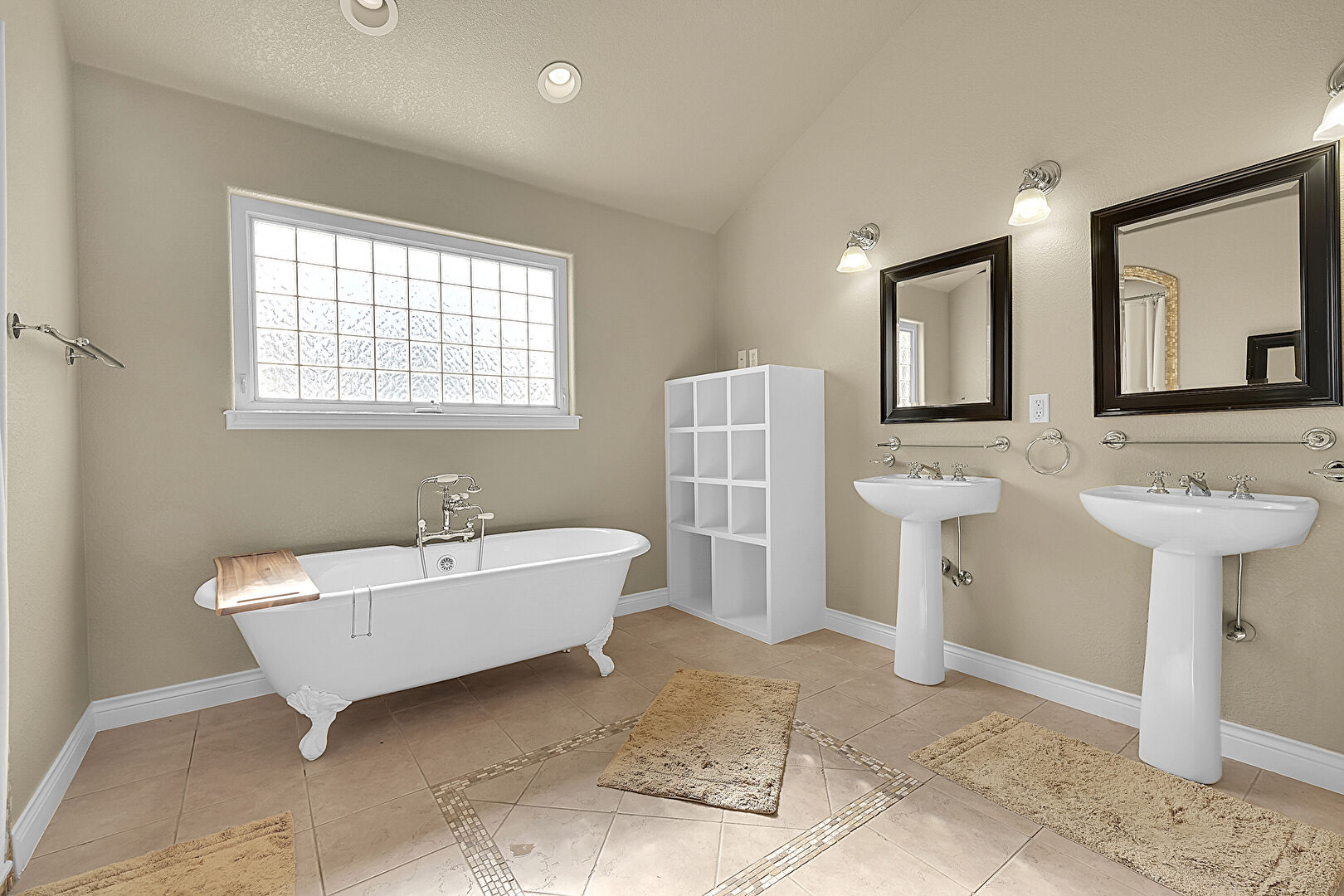 Baseboards Wall, Drywall, Full Bathroom, Natural Light, Recessed Lighting, Textured Ceiling, Tile Floor, Two Single Sinks, Vaulted Ceiling