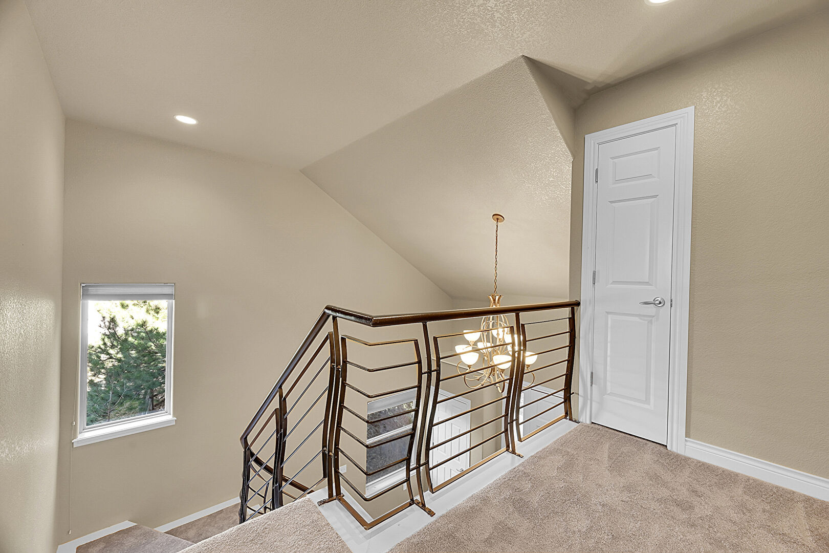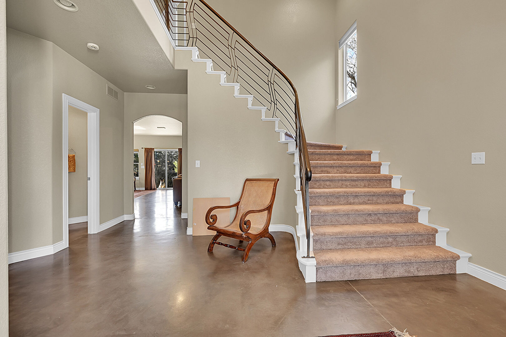 Arched Walkways, Baseboards Wall, Drywall, High Ceiling, Natural Light, Notable Chandelier, Recessed Lighting, Stairs, Textured Ceiling, Vaulted Ceiling, Vent, Carpet, Concrete Floor