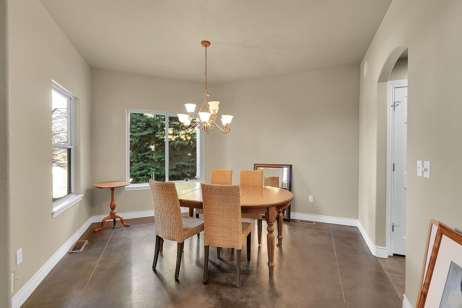 Arched Walkways, Baseboards Wall, Concrete Floor, Drywall, Natural Light, Vent, Notable Chandelier