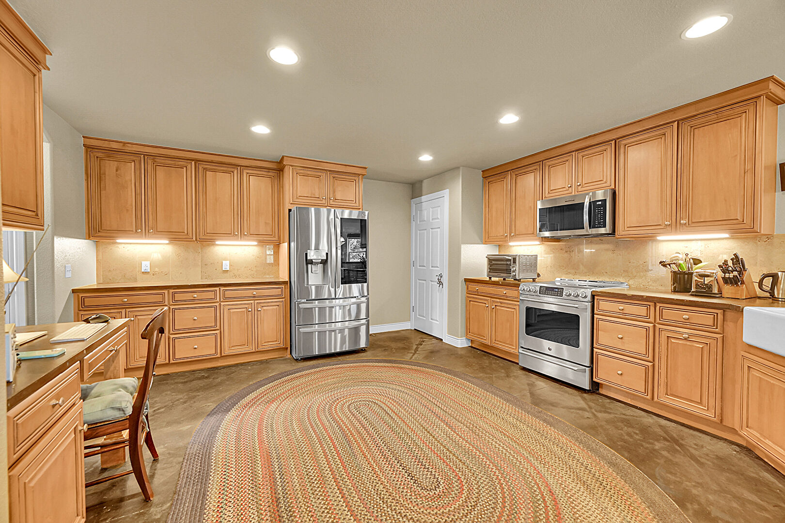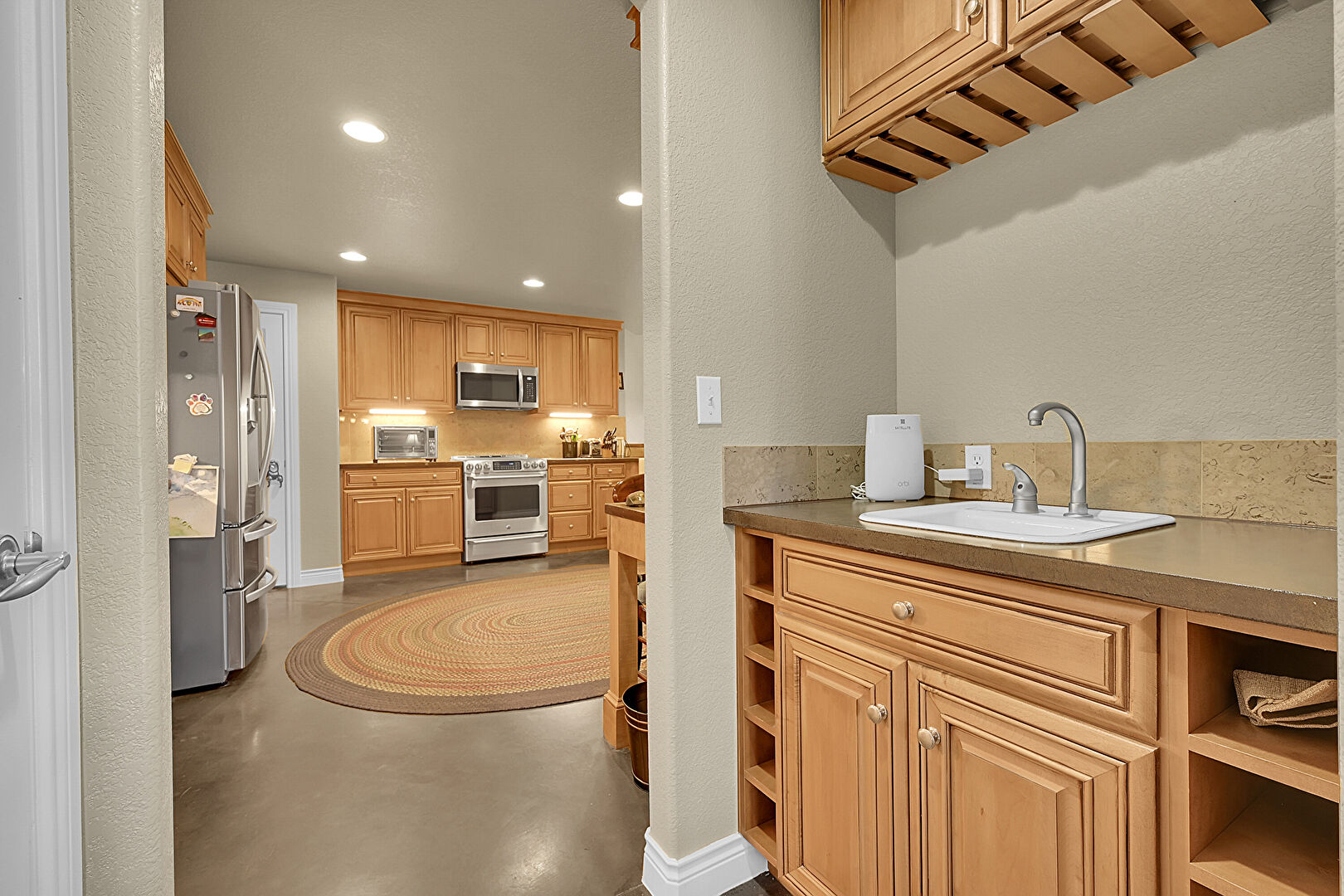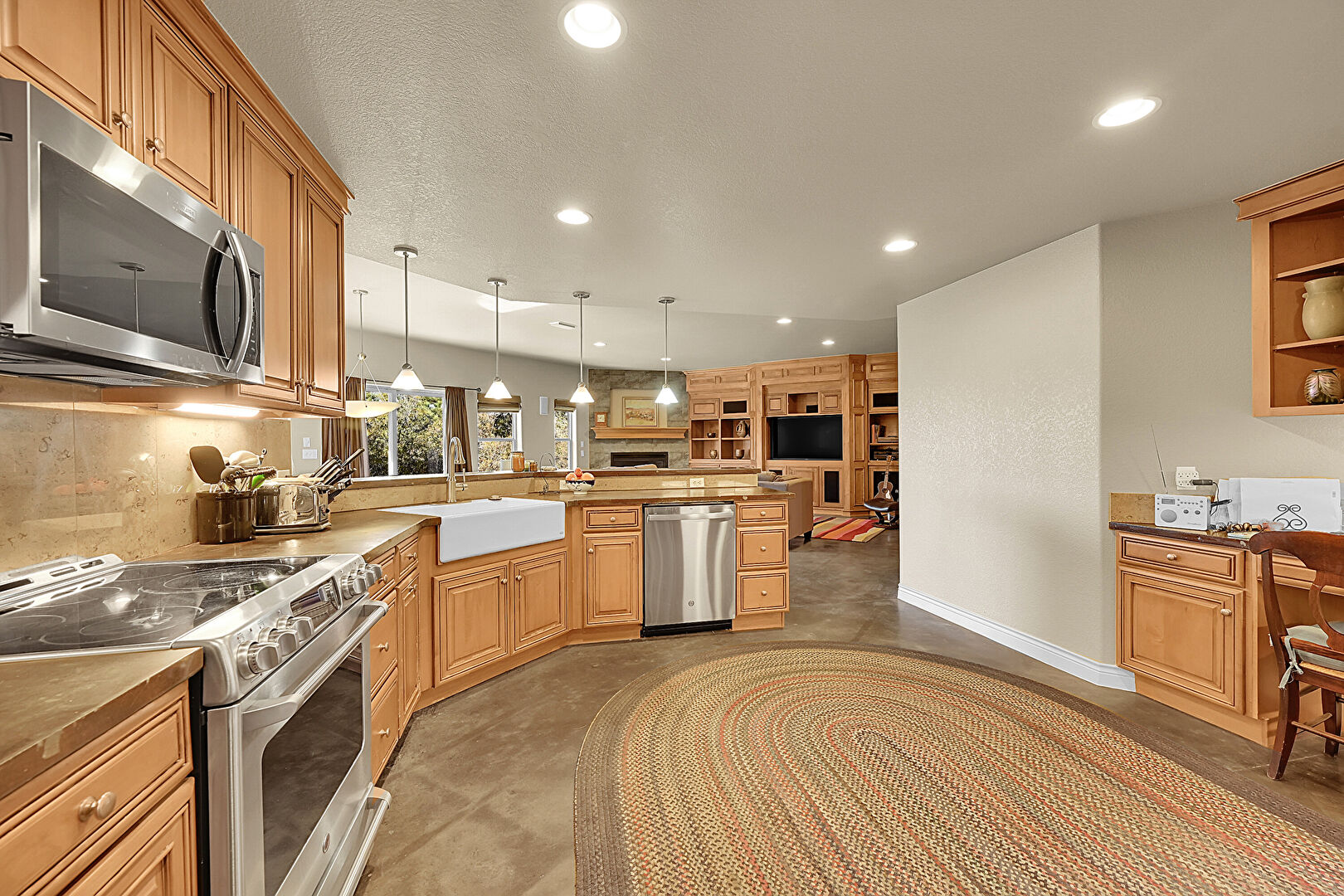 Baseboards Wall, Built In Desk, Concrete Floor, Crown Molding Cabinets, Drywall, Kitchen Peninsula, Medium Brown Cabinets, Natural Light, Office Area, Open Shelves, Opens To Living Area, Pendant Lighting, Raised Cabinets, Recessed Lighting, Stone Countertops, Textured Wall, Toaster, Crown Molding Cabinets, Open Shelves, Recessed Lighting