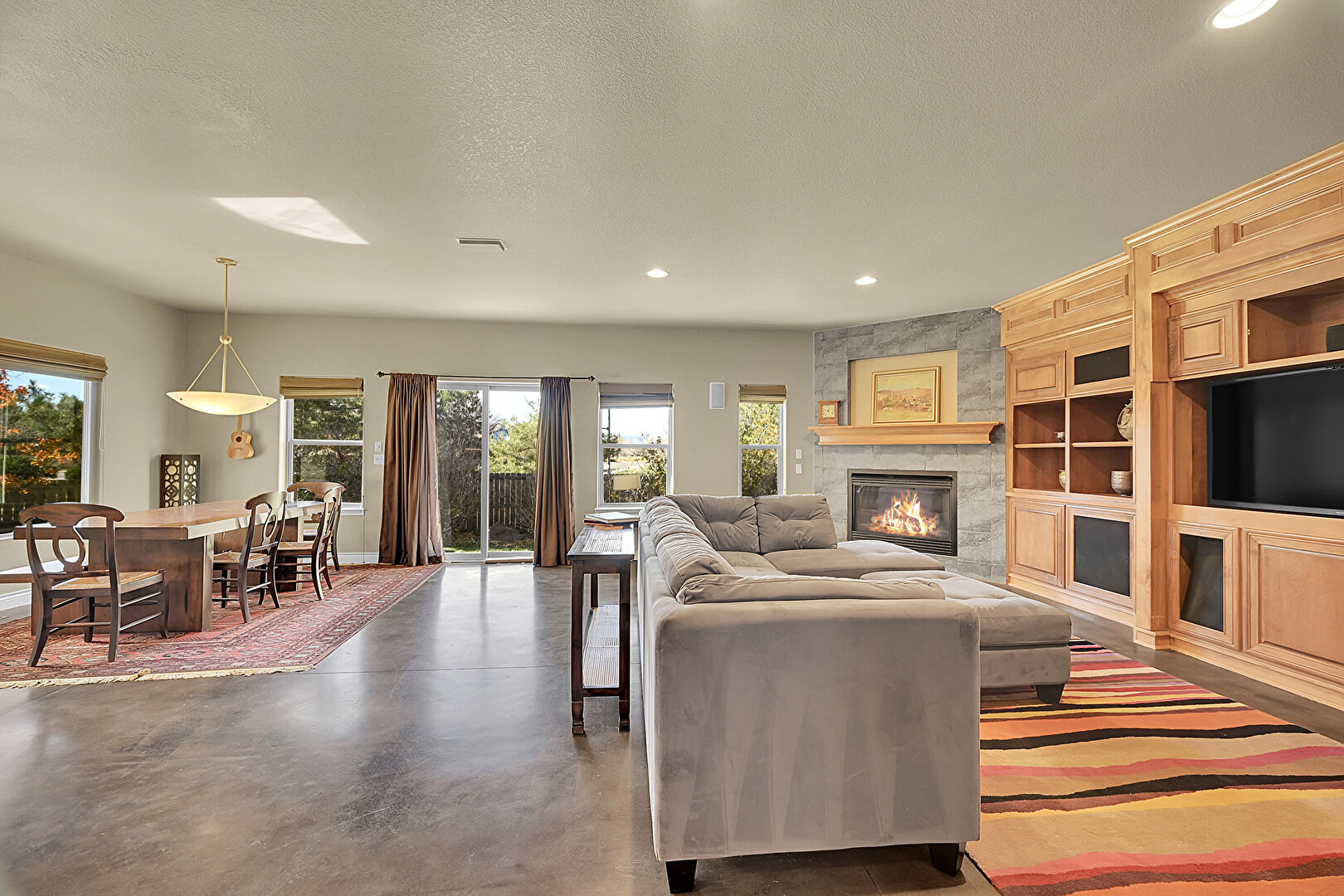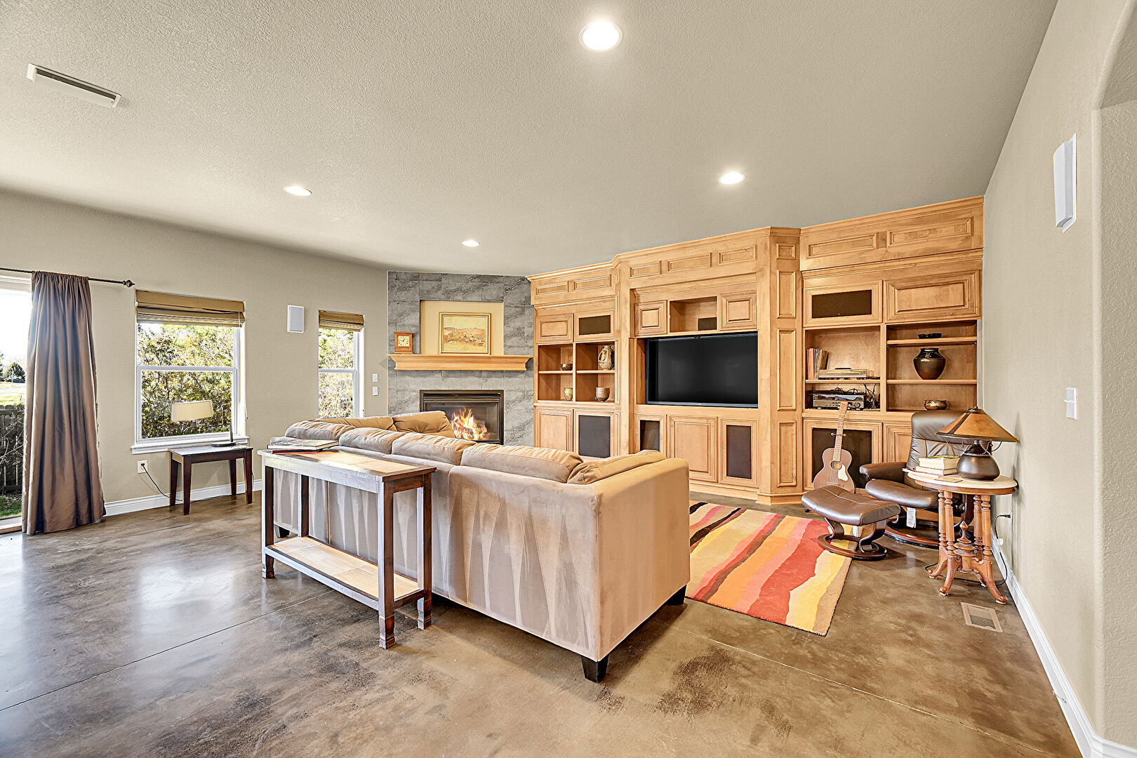 Baseboards Wall, Built In Shelves, Concrete Floor, Drywall, Fireplace, Natural Light, Recessed Lighting, Skylight, Textured Ceiling, Vent, Built In Shelves, Drywall, Textured Ceiling