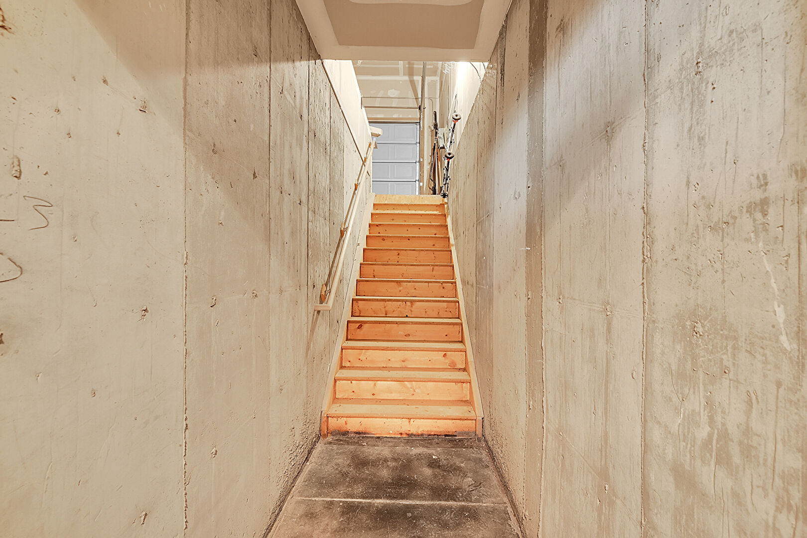 Concrete Floor, Fence, Stone Siding, Lawn, Stairs