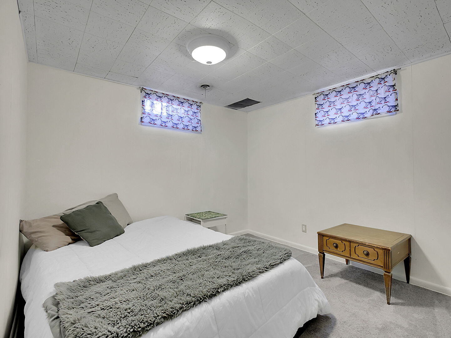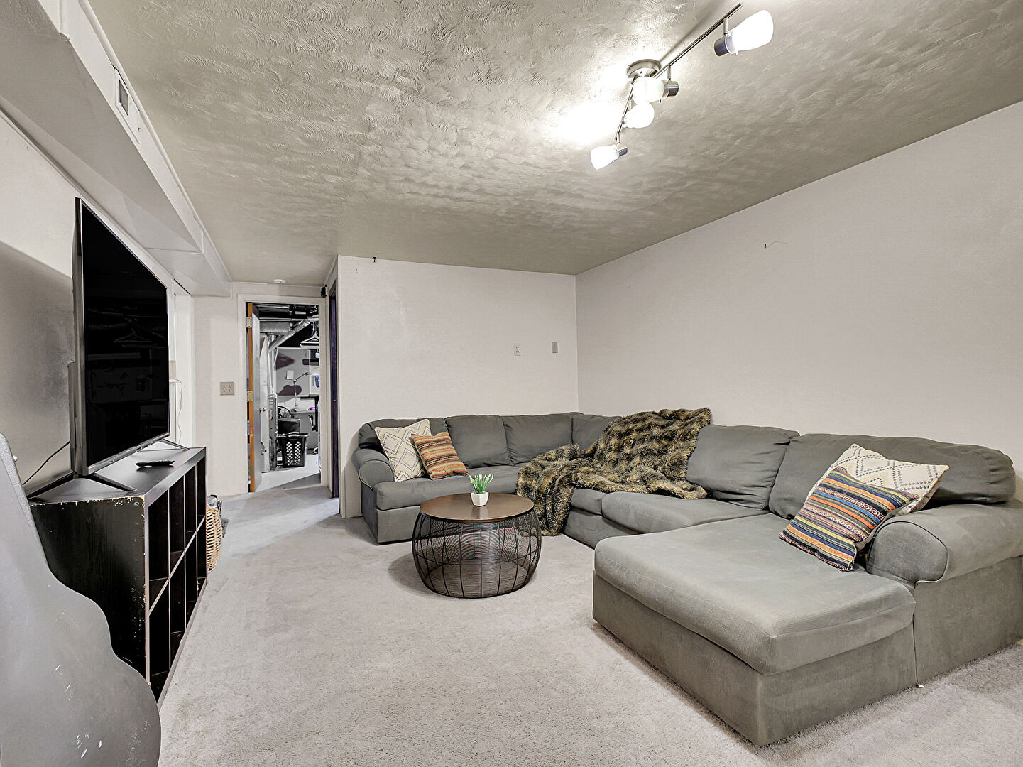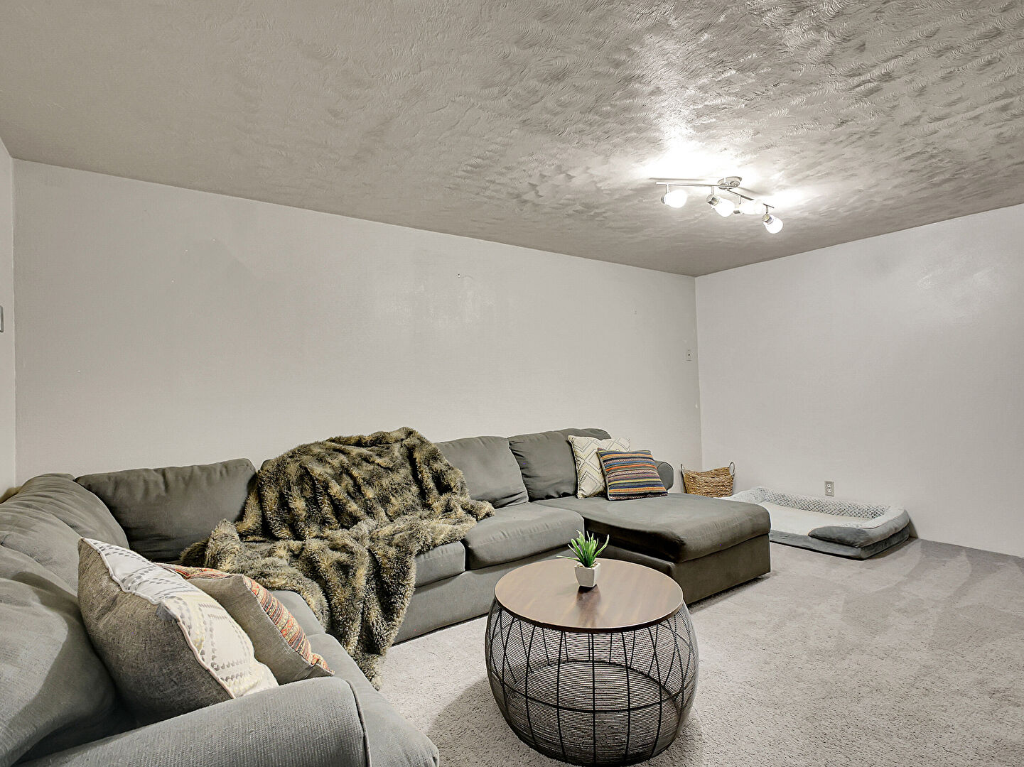 Baseboards Wall, Carpet, Drywall, Natural Light, Textured Ceiling, Vent, Wood Finish Floor, Basement, Drywall, Natural Light, Textured Ceiling