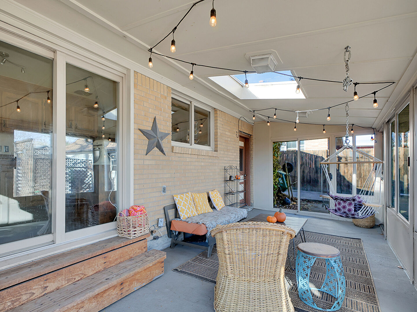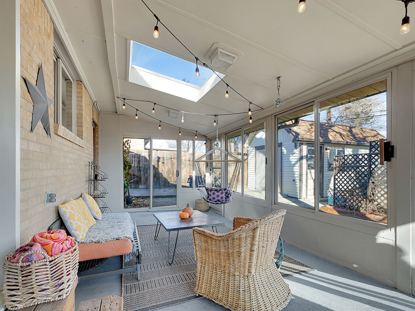 Brick Wall, Concrete Floor, Drywall, Entry Steps, Natural Light, Patio, Skylight, Sunroom, Track Lighting, Natural Light, Outdoor Living Space, Sunroom
