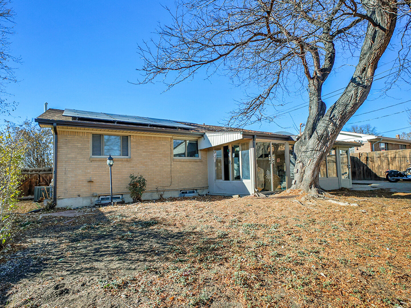 Brick Siding, Central Ac, Concrete Foundation, Downspout, Driveway, Fence, Gutters, Lawn, Porch, Sunroom, Vertical Siding, Fence, Solar Panels, Vertical Siding