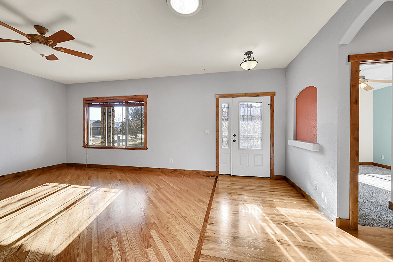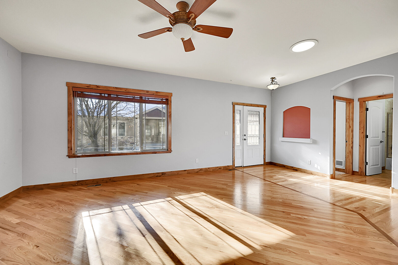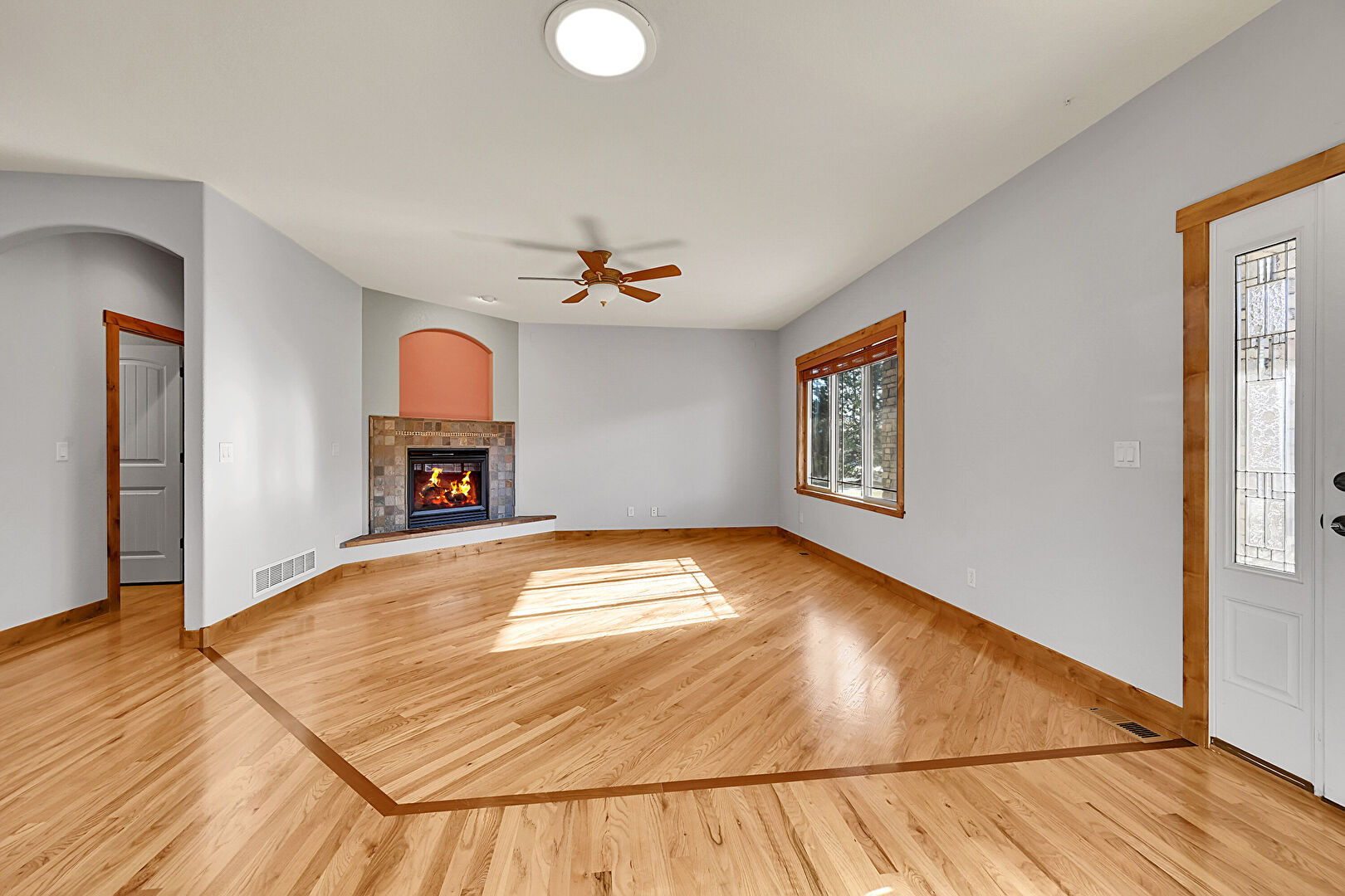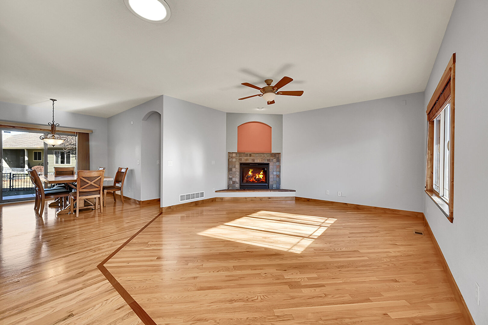 Arched Walkways, Baseboards Wall, Ceiling Fan, Drywall, L Shaped Kitchen, Natural Light, Recessed Lighting, Vent, Wood Finish Floor, Arched Walkways, Drywall, Fireplace, L Shaped Kitchen, Natural Light, Recessed Lighting