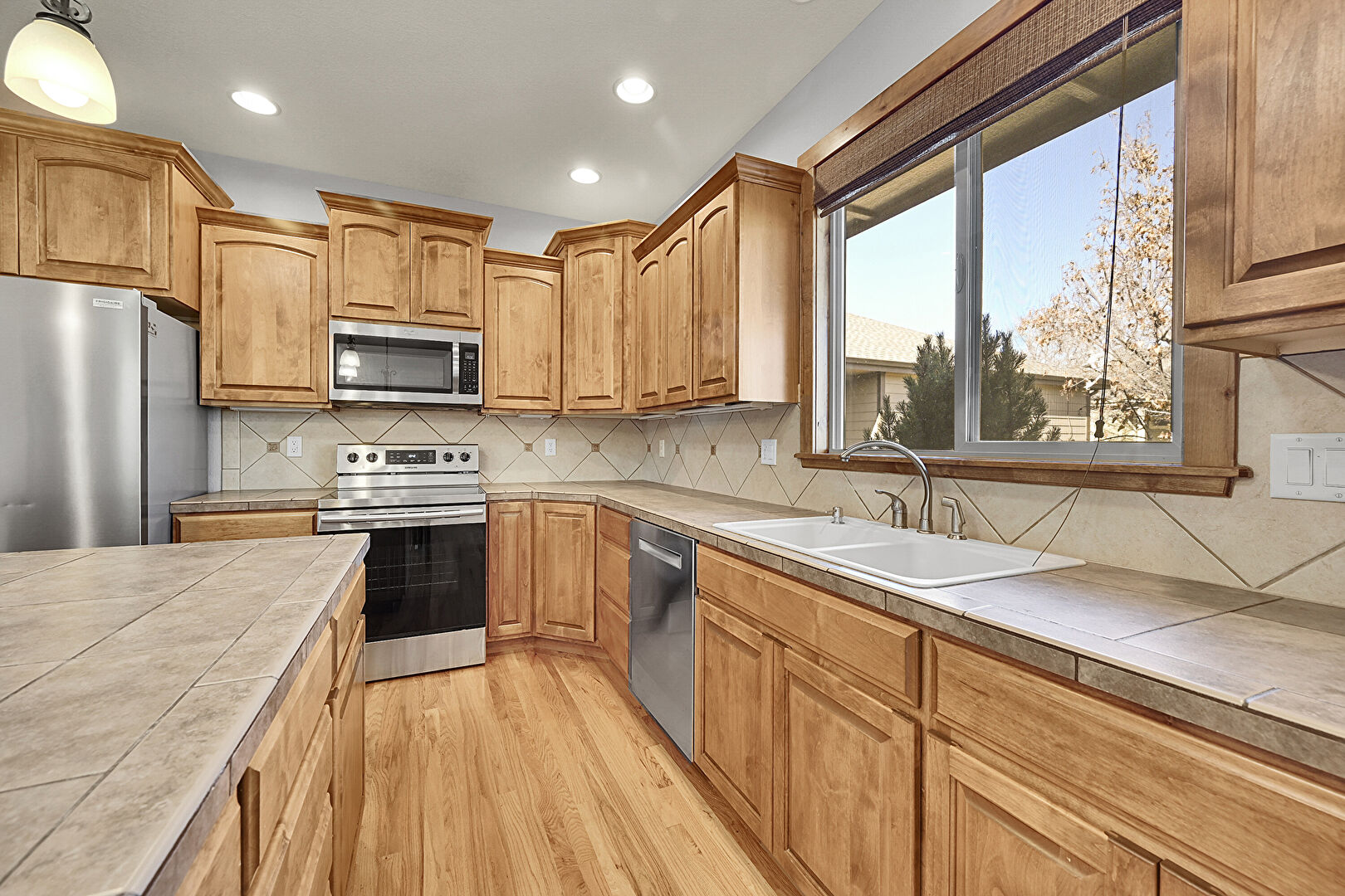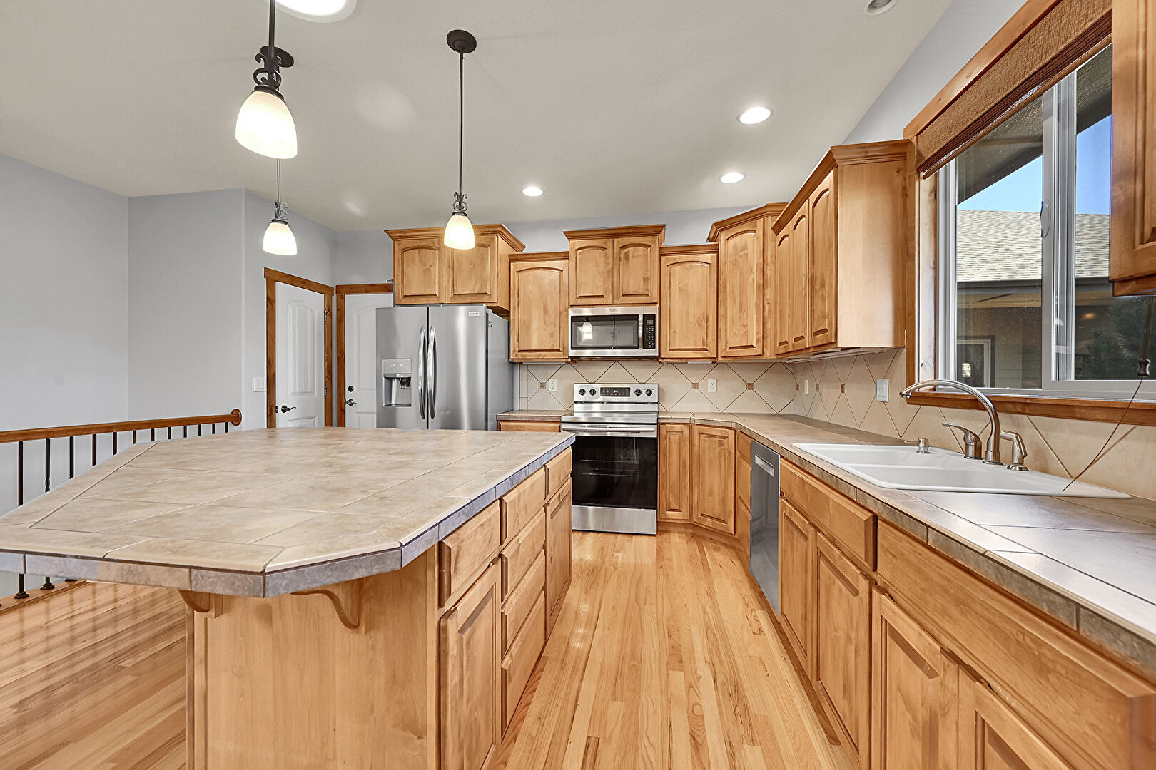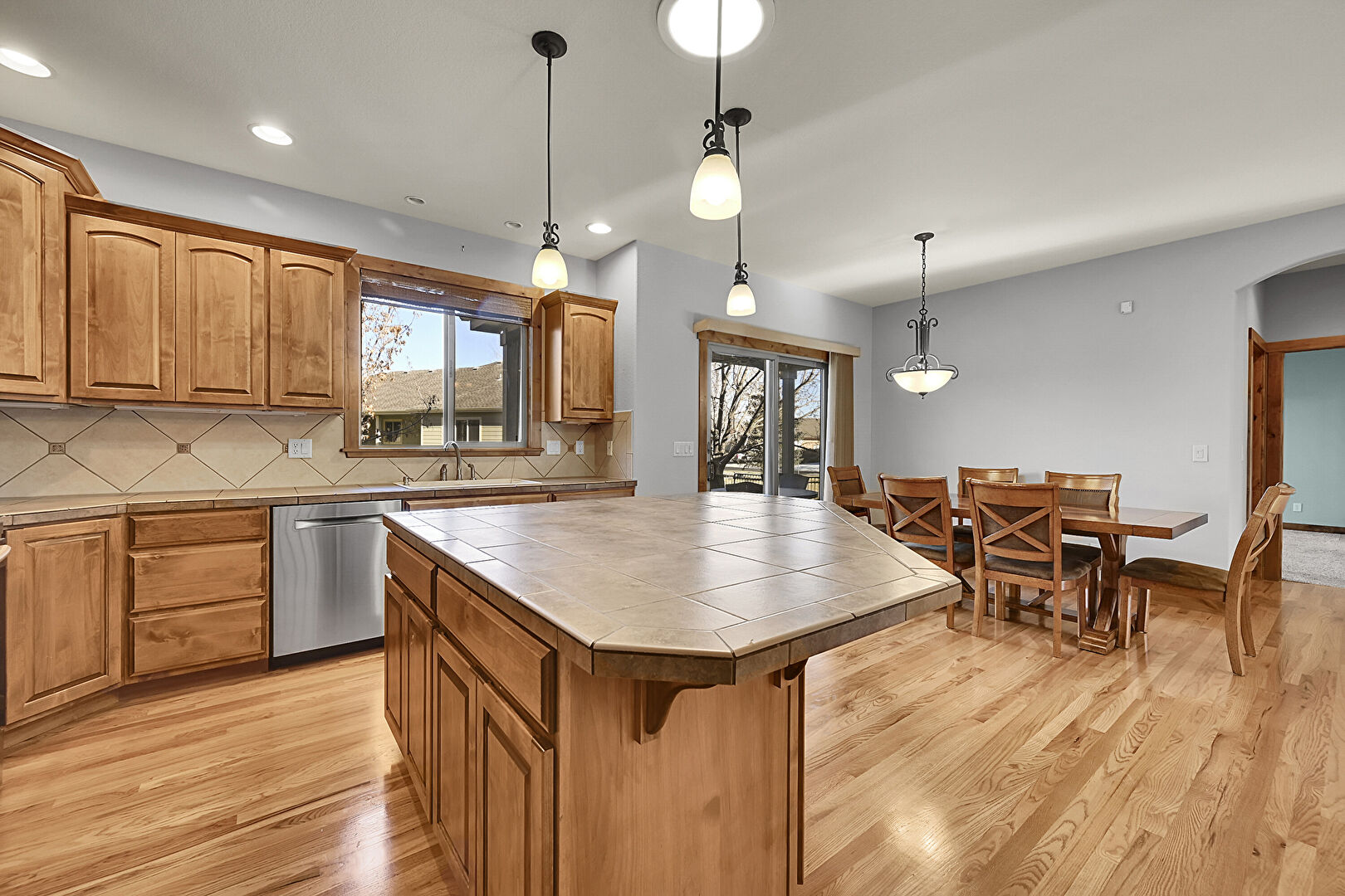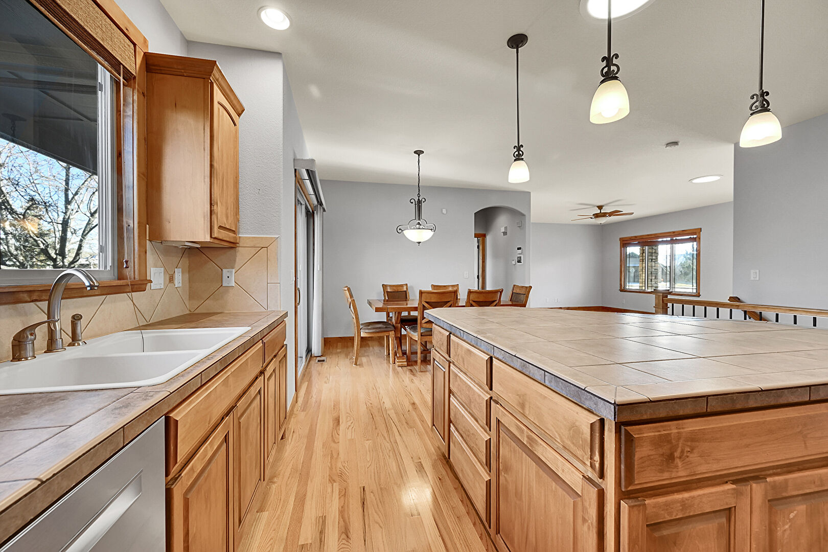 Arched Cabinets, Arched Walkways, Baseboards Wall, Ceiling Fan, Crown Molding Cabinets, Drywall, Kitchen Bar, Kitchen Island, L Shaped Kitchen, Medium Brown Cabinets, Natural Light, Pendant Lighting, Raised Cabinets, Recessed Lighting, Tile Countertops, Wood Finish Floor, Arched Cabinets, Medium Brown Cabinets, Natural Light, Recessed Lighting, Tile Countertops, Wood Finish Floor