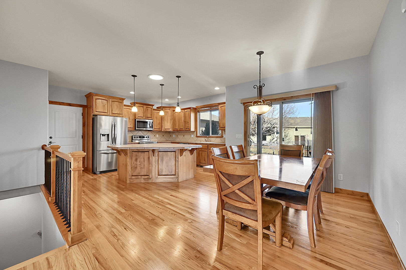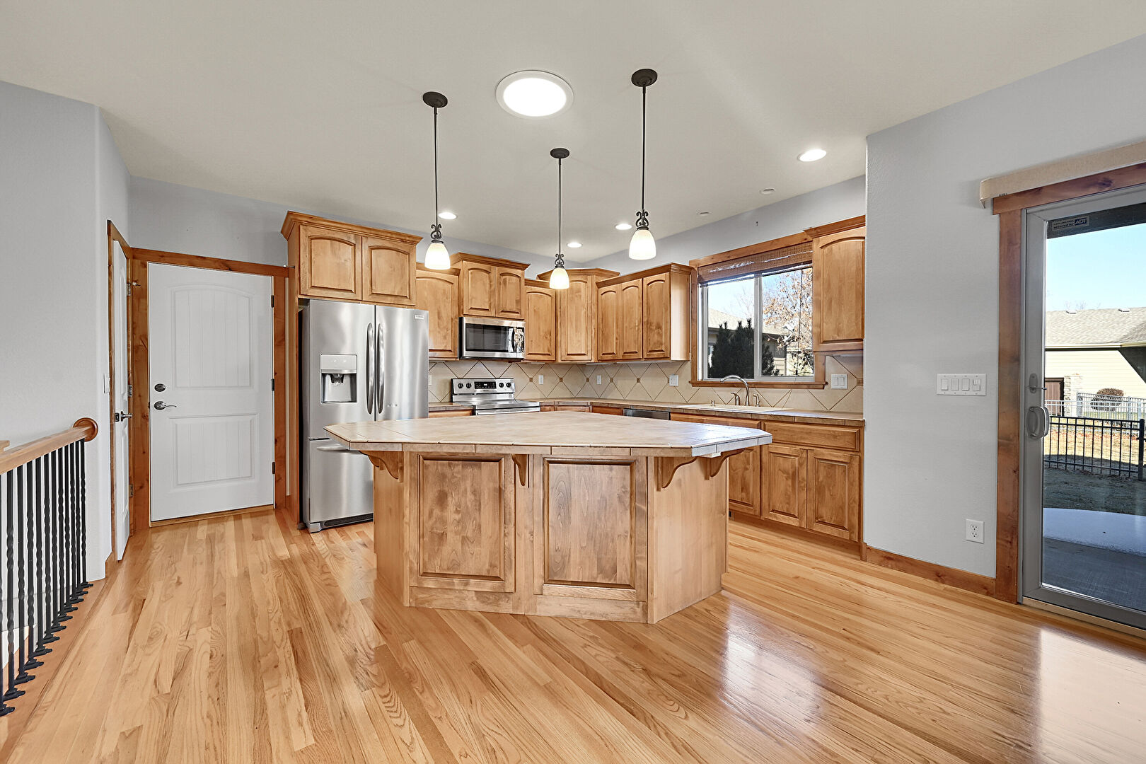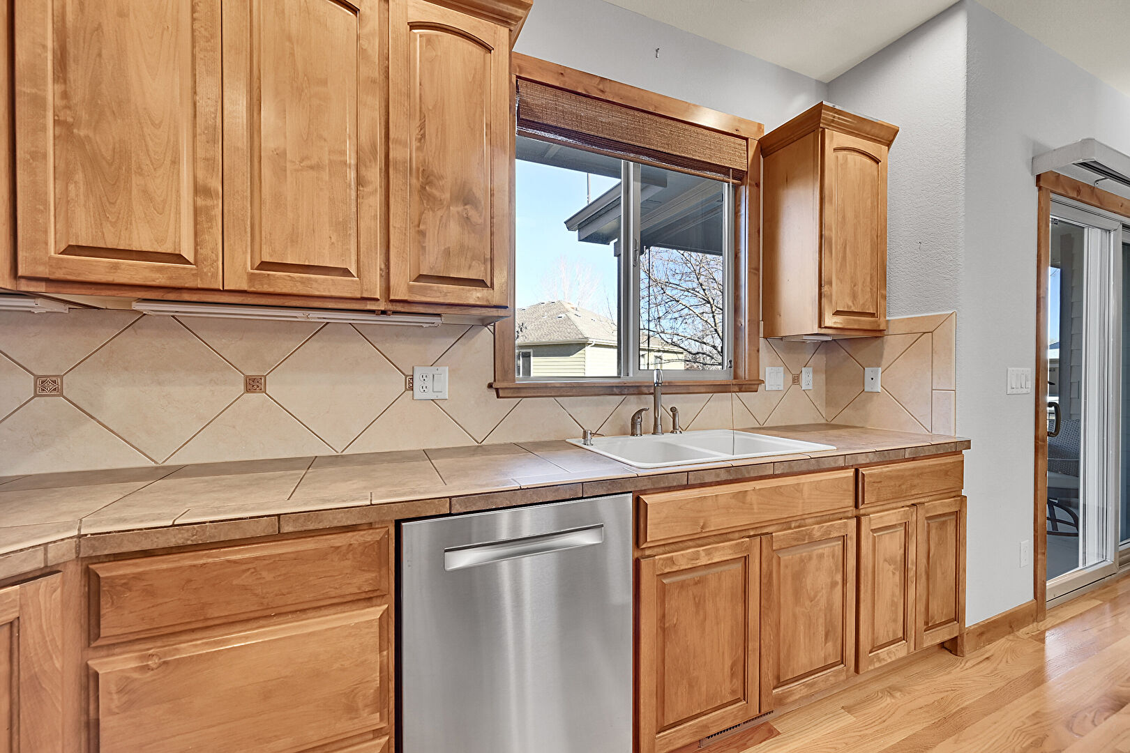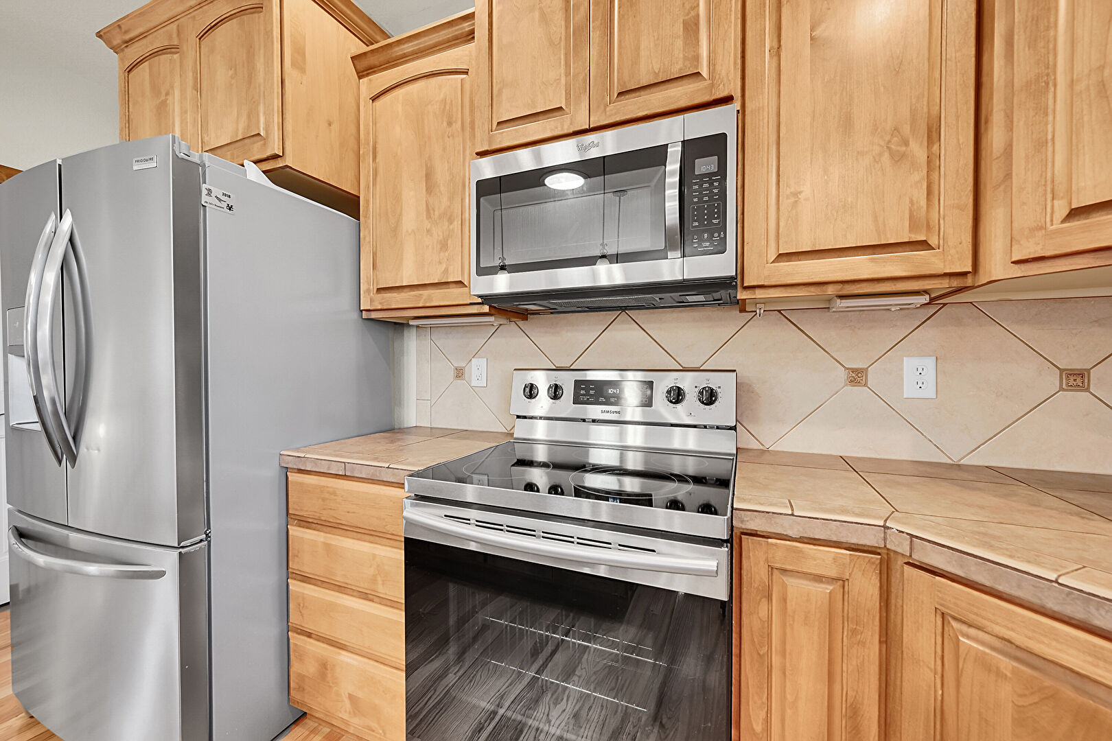 Arched Cabinets, Arched Walkways, Baseboards Wall, Ceiling Fan, Crown Molding Cabinets, Drywall, Kitchen Bar, Kitchen Island, L Shaped Kitchen, Medium Brown Cabinets, Natural Light, Pendant Lighting, Raised Cabinets, Recessed Lighting, Tile Countertops, Wood Finish Floor, Arched Cabinets, Medium Brown Cabinets, Natural Light, Recessed Lighting, Tile Countertops, Wood Finish Floor