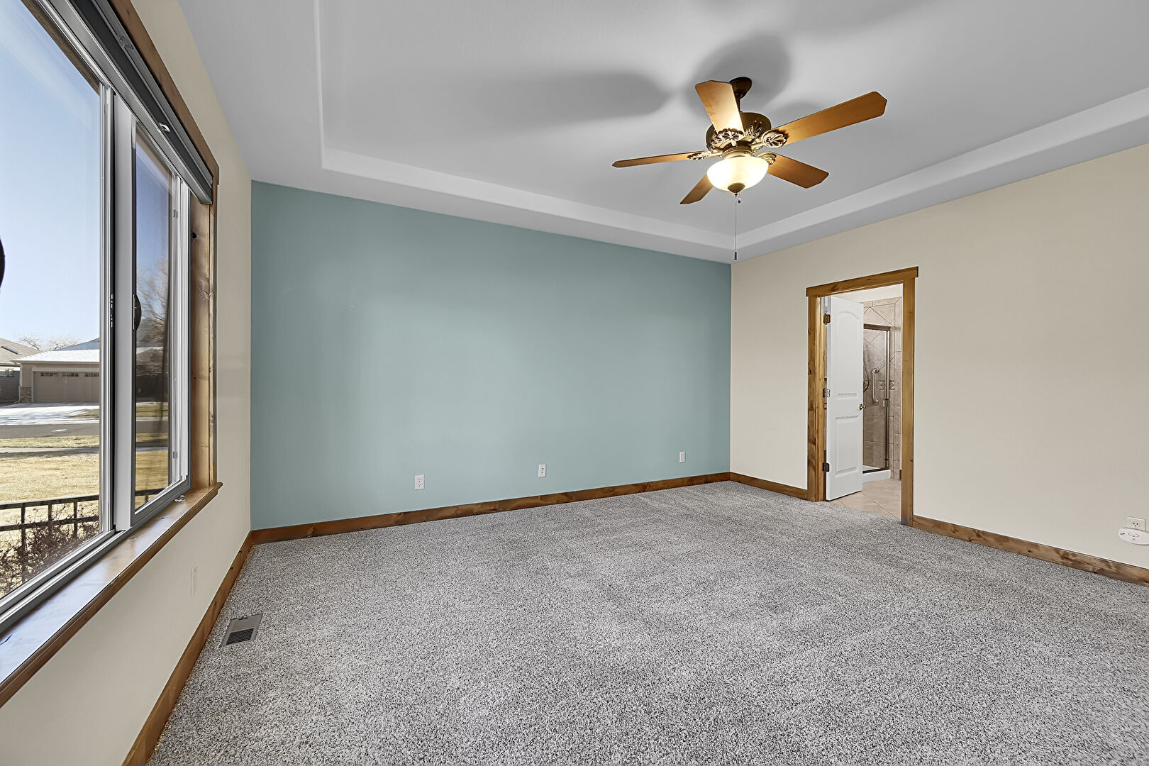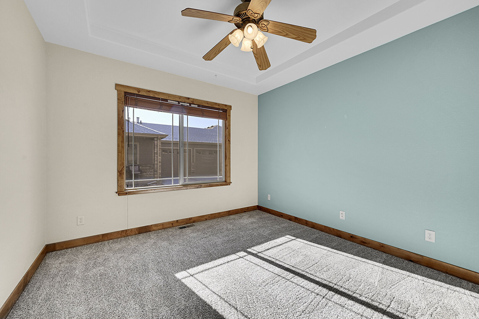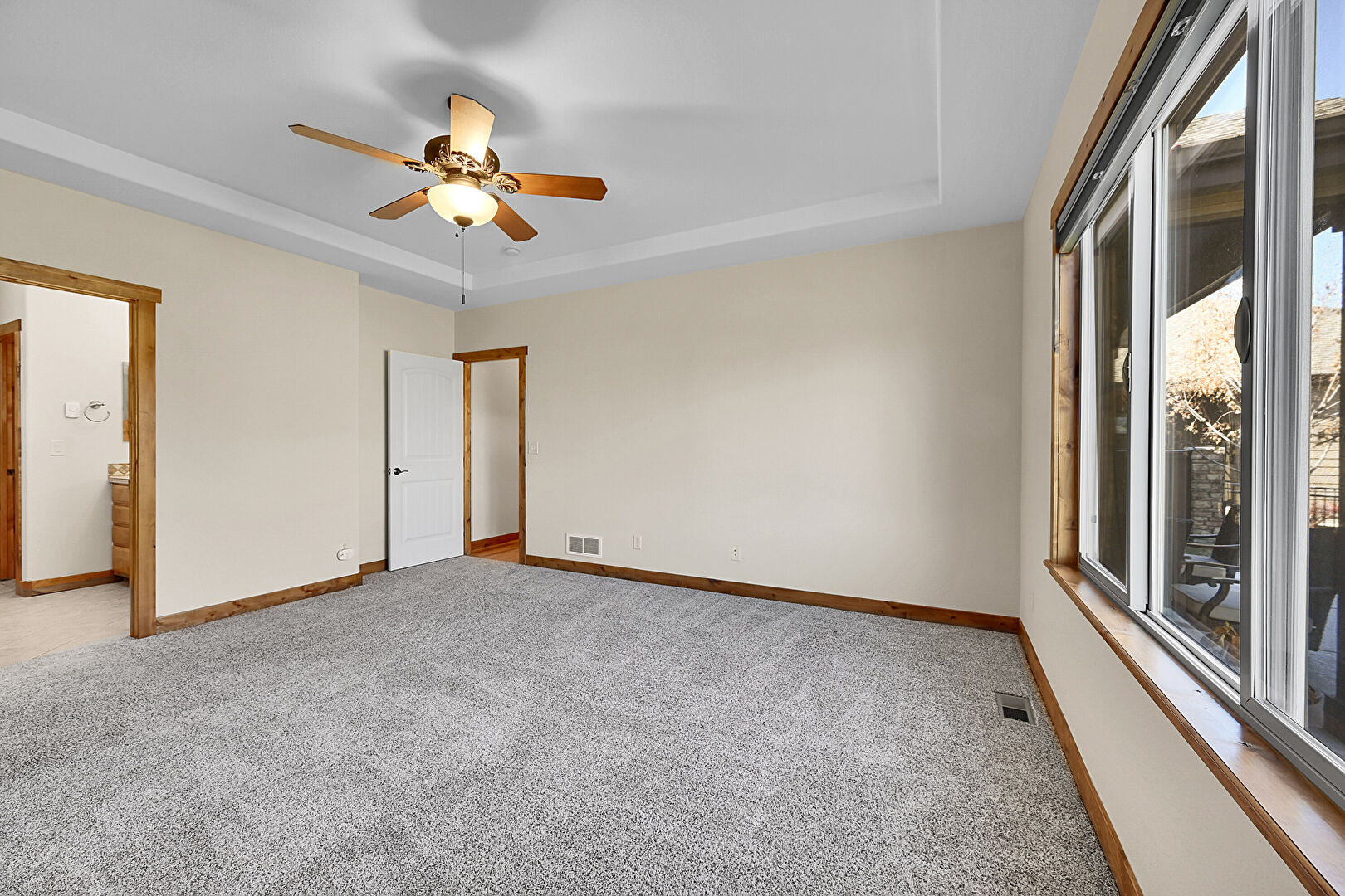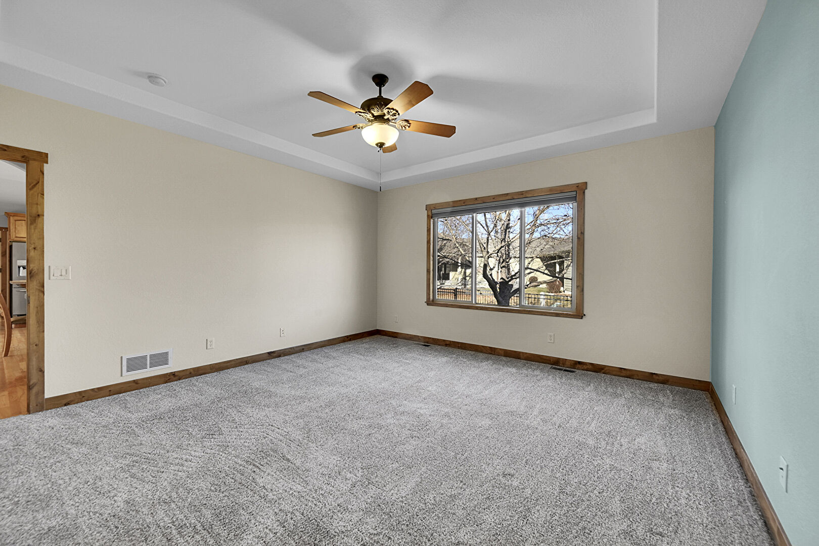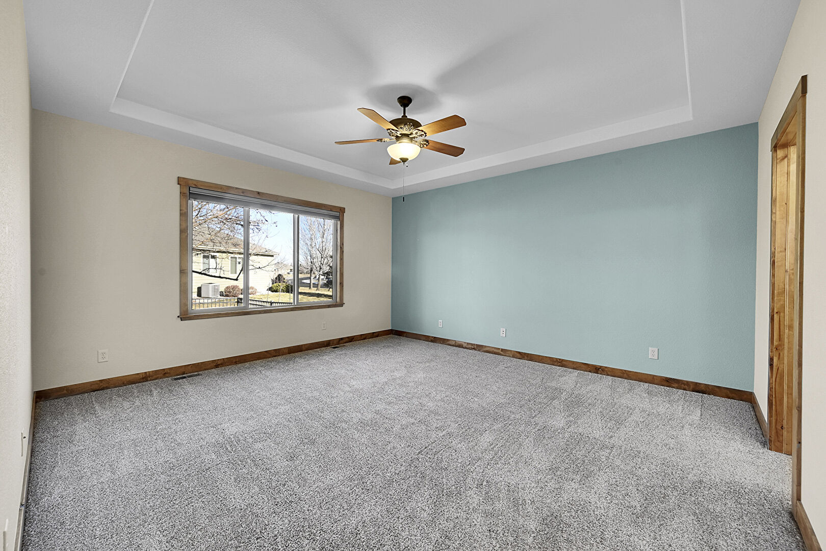 Baseboards Wall, Carpet, Ceiling Fan, Drywall, Natural Light, Tray Ceiling, Vent, Baseboards Wall, Carpet, Drywall, Tray Ceiling