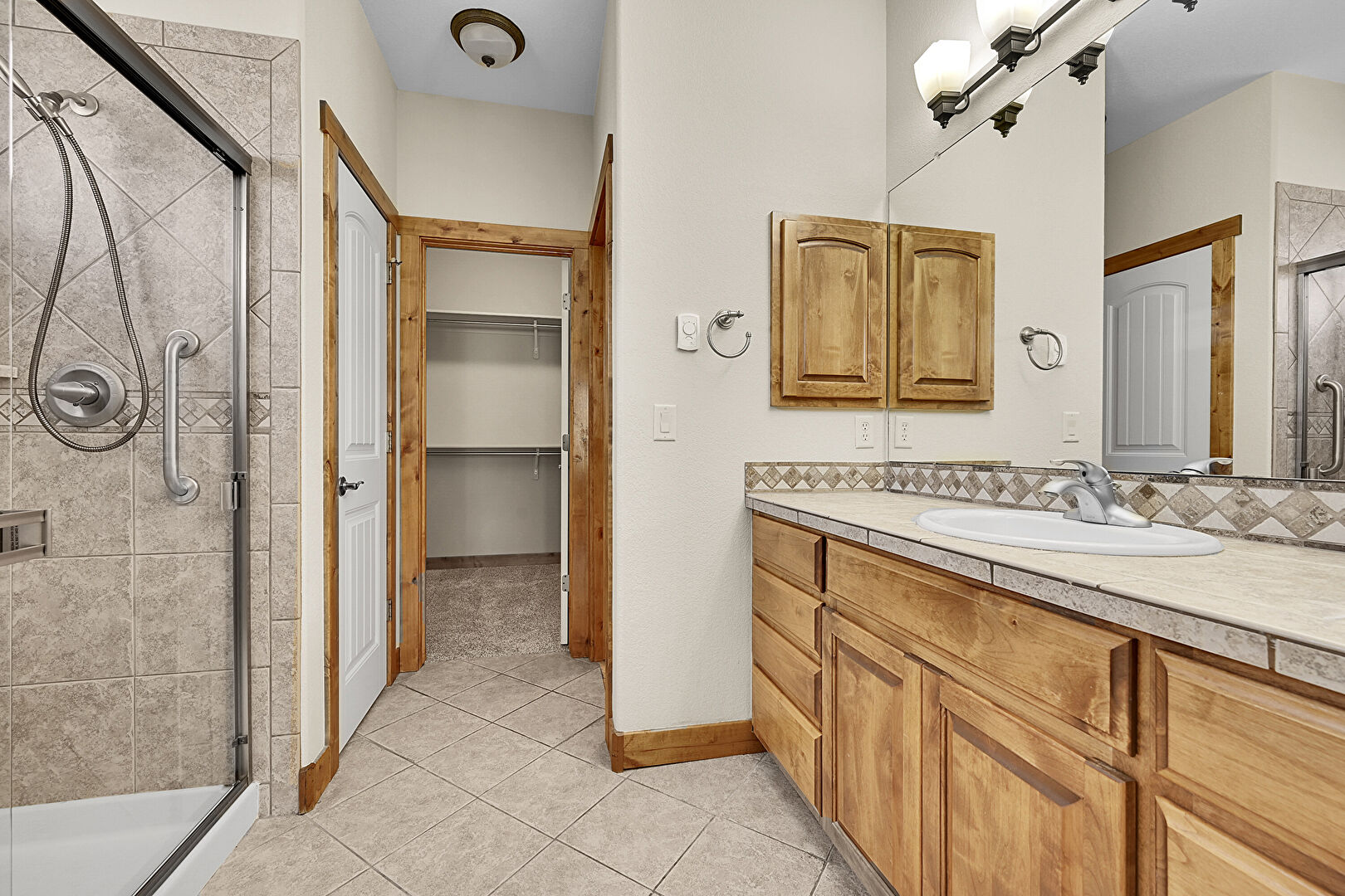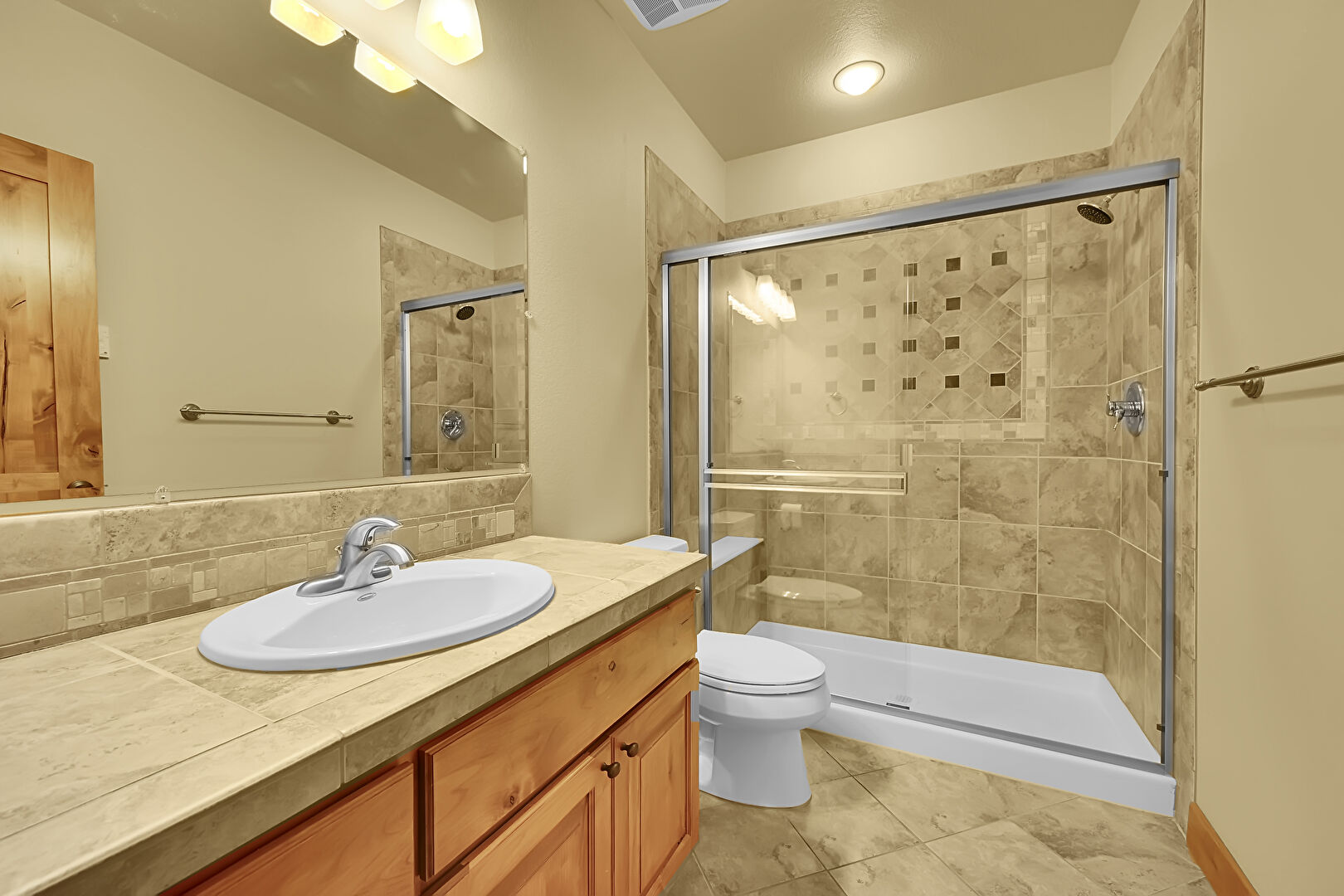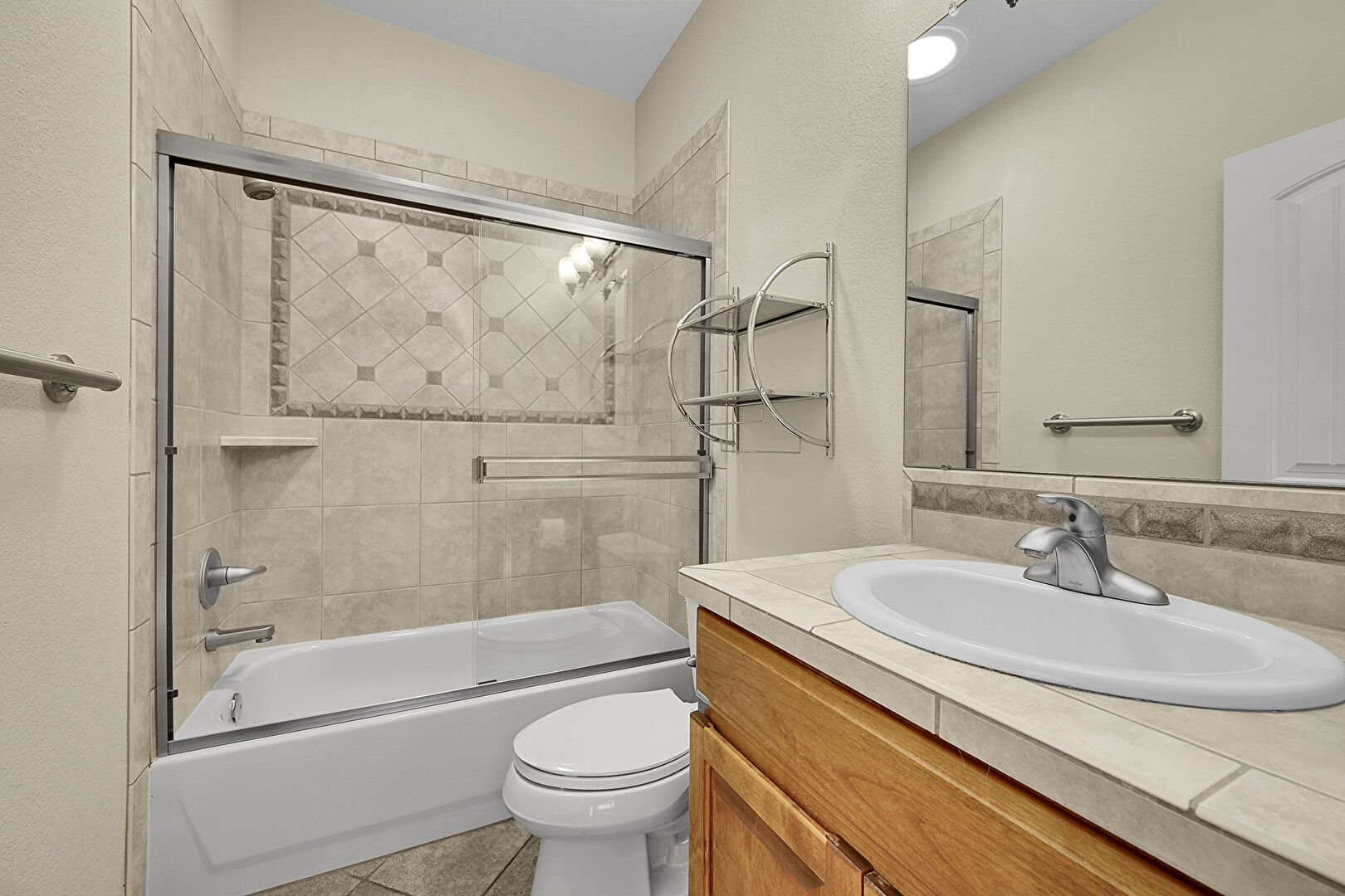 Baseboards Wall, Combined Bath Shower, Drywall, Full Bathroom, Textured Wall, Tile Floor, Vanity, Vanity, Vent