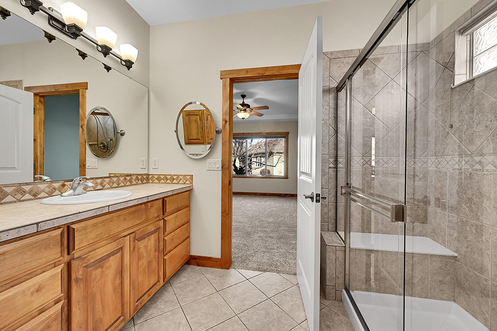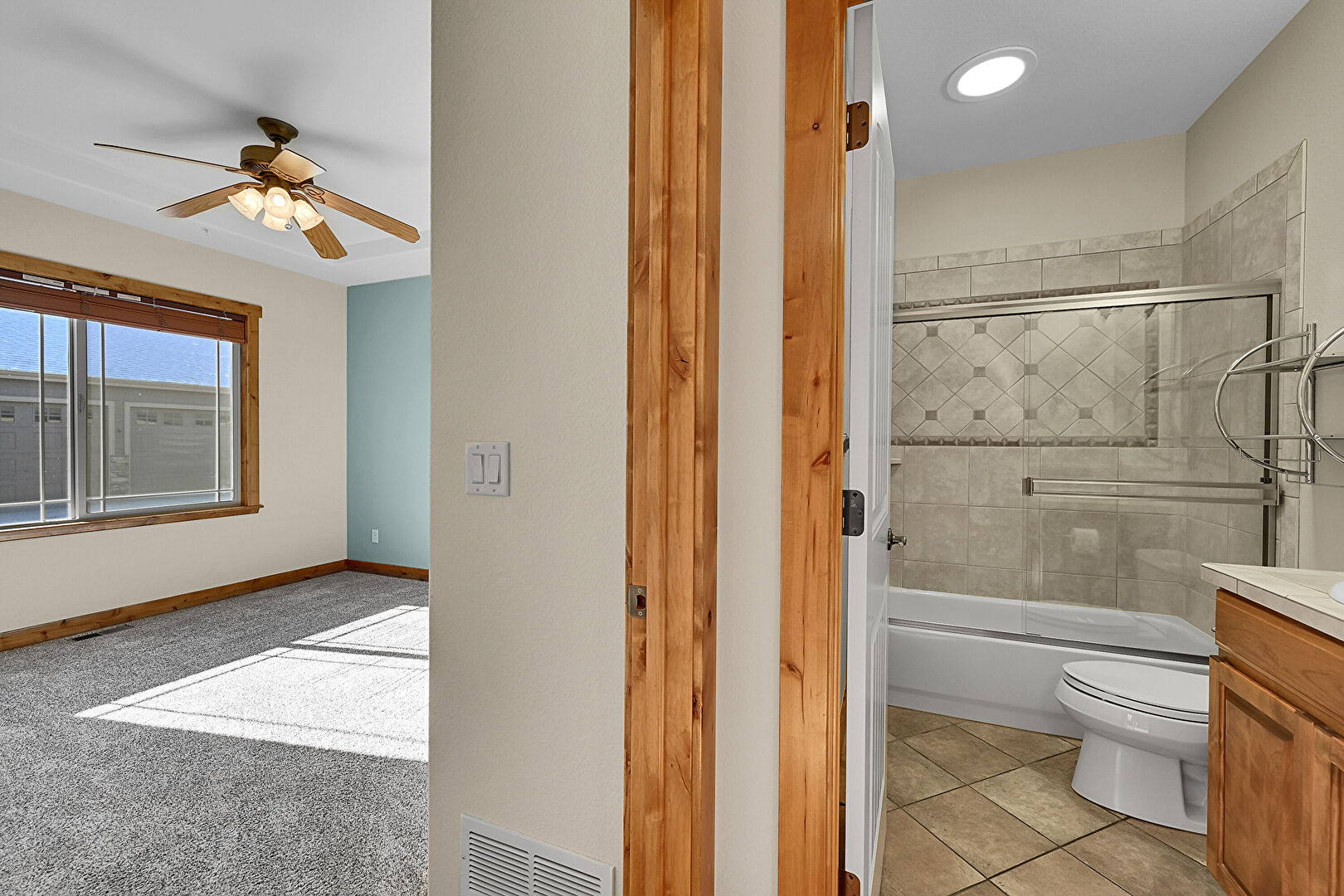 Baseboards Wall, Carpet, Ceiling Fan, Combined Bath Shower, Drywall, Full Bathroom, Natural Light, Tile Floor, Vent, Vanity