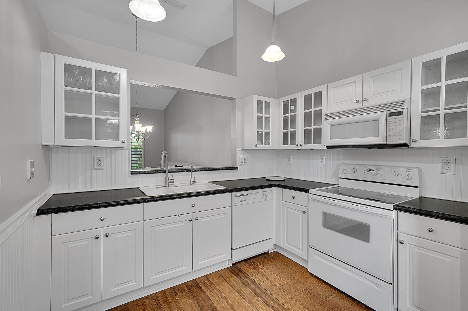 Drywall, Glass Insert Cabinets, Natural Light, Notable Chandelier, Pass Through Window, Pendant Lighting, Raised Cabinets, Stone Countertops, Vaulted Ceiling, Wainscot Wall, Wood Finish Floor, Drywall, Vaulted Ceiling, Wainscot Wall