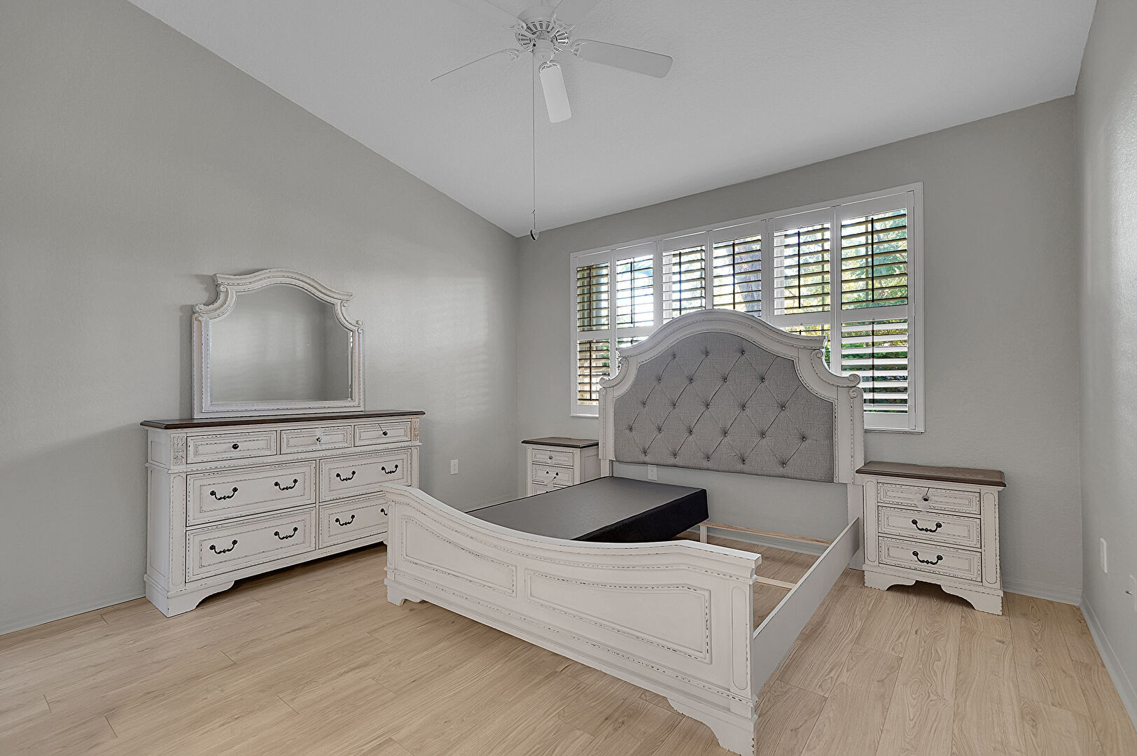 Baseboards Wall, Ceiling Fan, Drywall, Ensuite Bathroom, Natural Light, Vaulted Ceiling, Vent, Wood Finish Floor, Drywall, High Ceiling, Wood Finish Floor