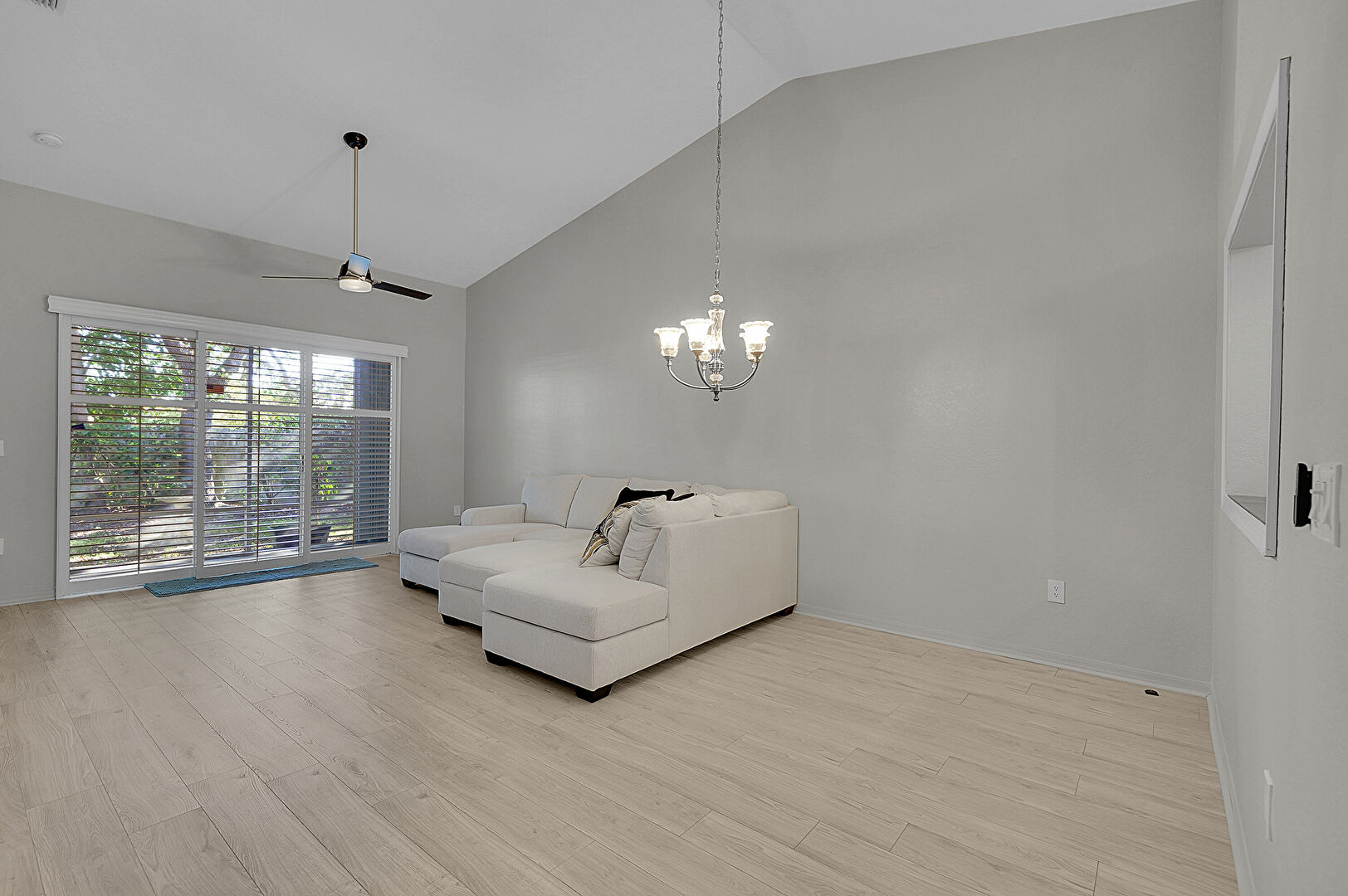 Baseboards Wall, Cathedral Ceiling, Drywall, High Ceiling, Natural Light, Notable Chandelier, Vaulted Ceiling, Vent, Wood Finish Floor, Baseboards Wall, Ceiling Fan