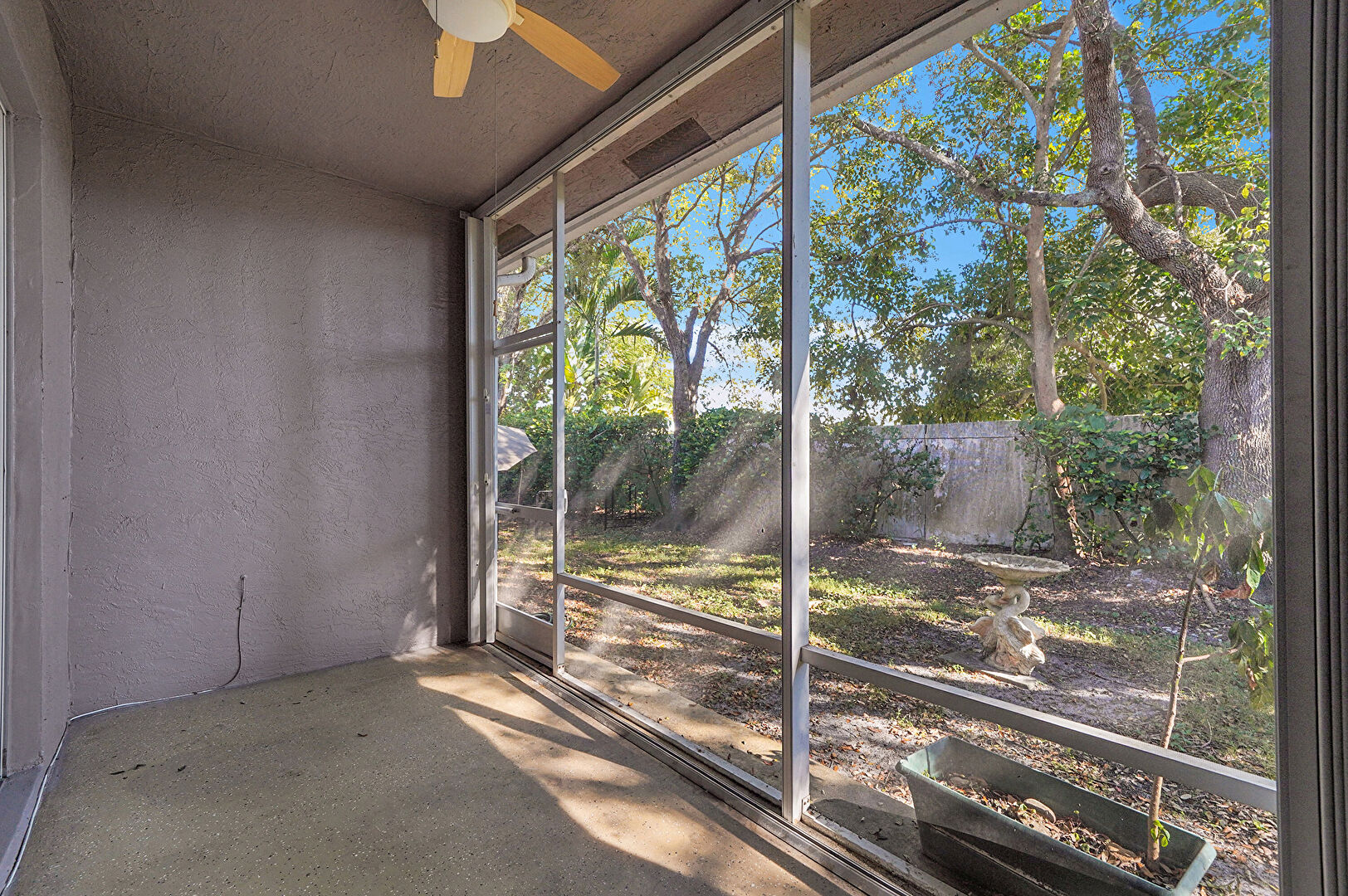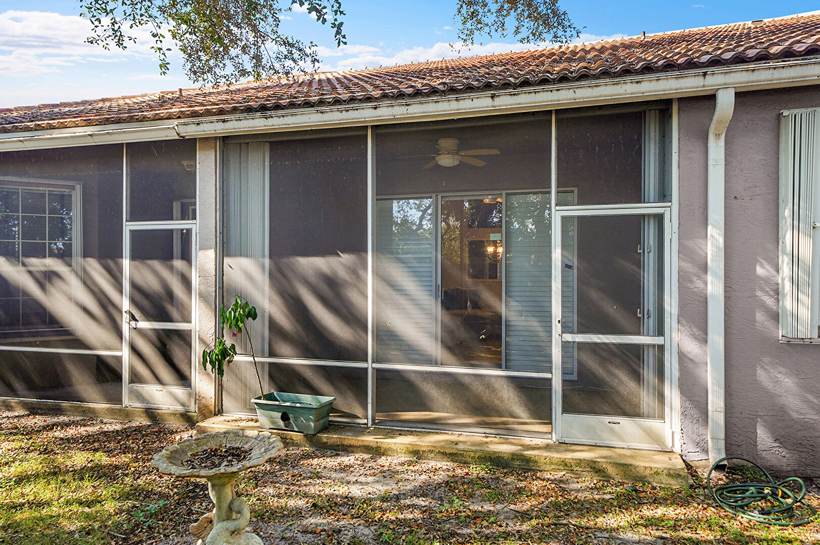 Ceiling Fan, Gutters, Stucco Siding, Sunroom, Tile Roof, Downspout