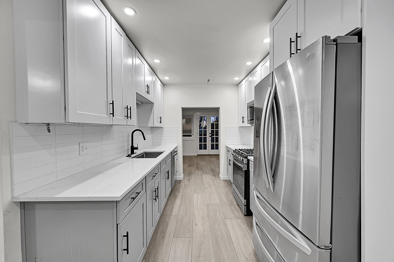Baseboards Wall, Drywall, Galley Kitchen, Gray Cabinets, Recessed Lighting, Shaker Cabinets, Wood Finish Floor, Stone Countertops