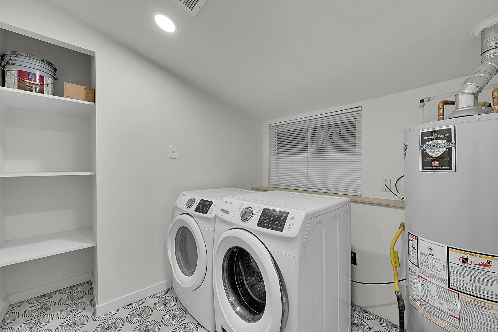 Baseboards Wall, Drywall, Laundry, Recessed Lighting, Tile Floor, Vent, Water Heater