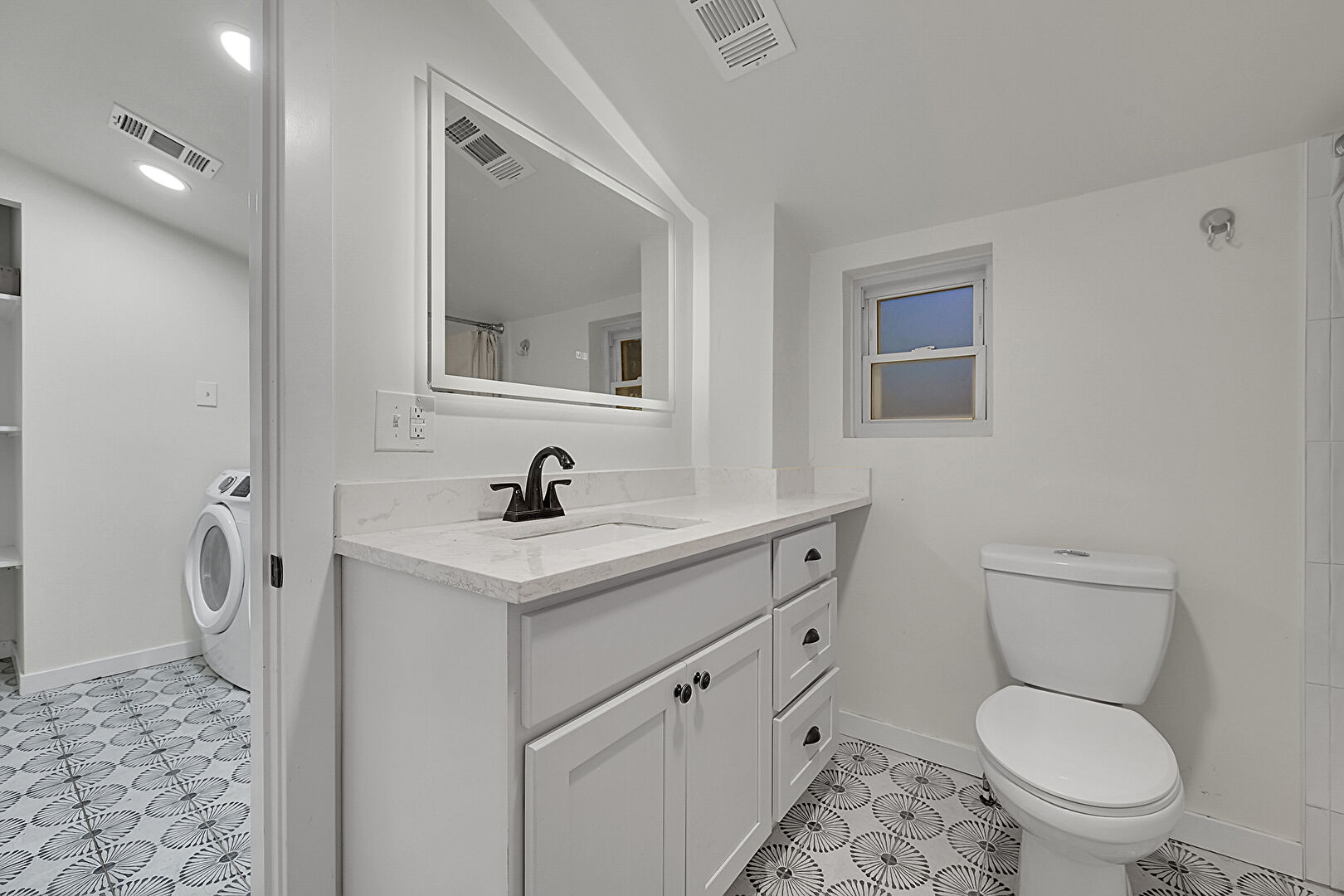 Baseboards Wall, Drywall, Full Bathroom, Laundry, Recessed Lighting, Tile Floor, Vent, Washer Dryer, Vanity