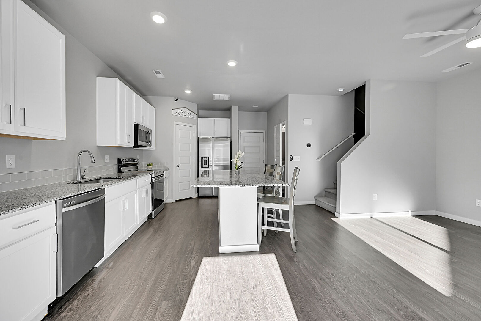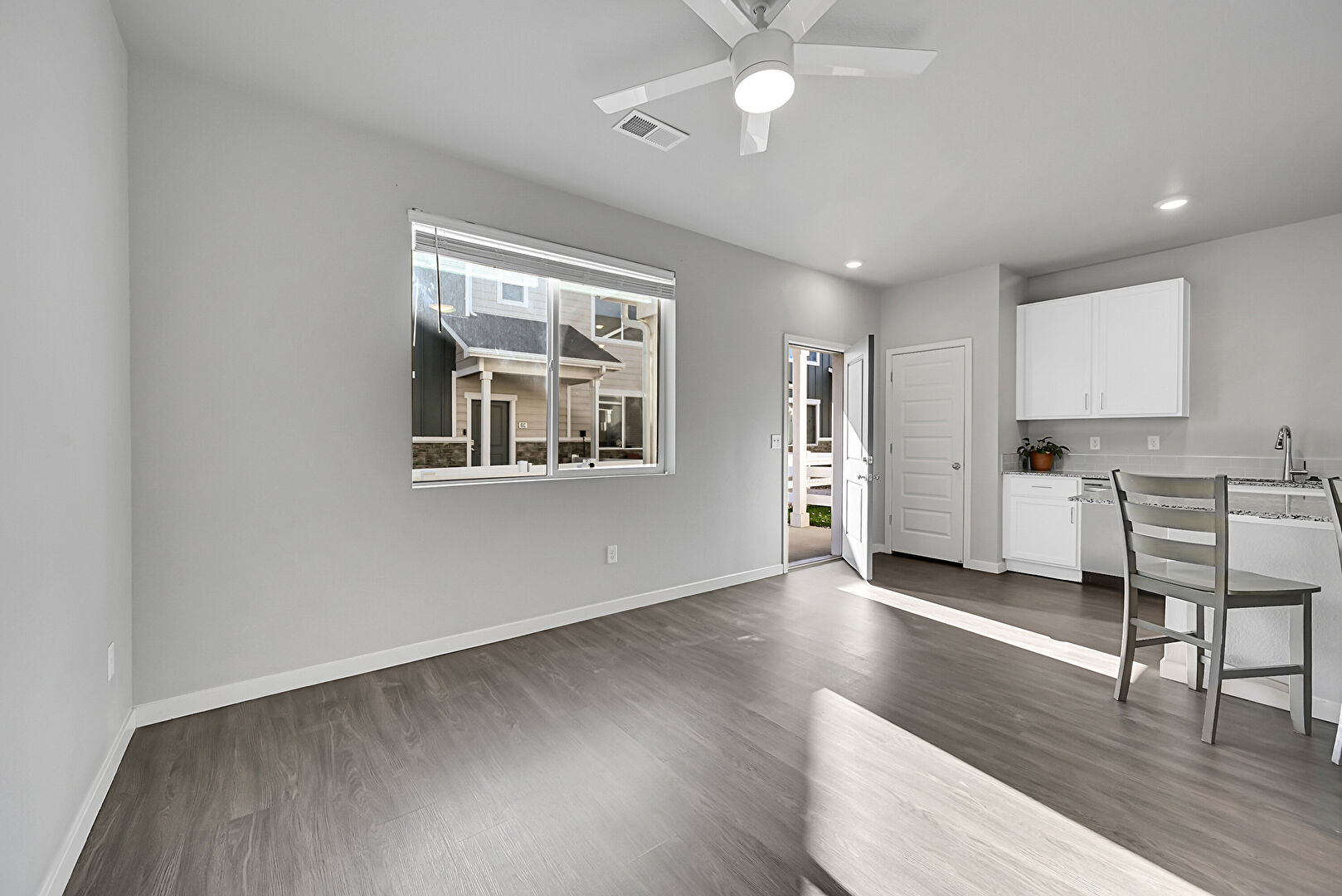 Ceiling Fan, Drywall, Natural Light, Recessed Lighting, Shaker Cabinets, Vent, Wood Finish Floor, Baseboards Wall