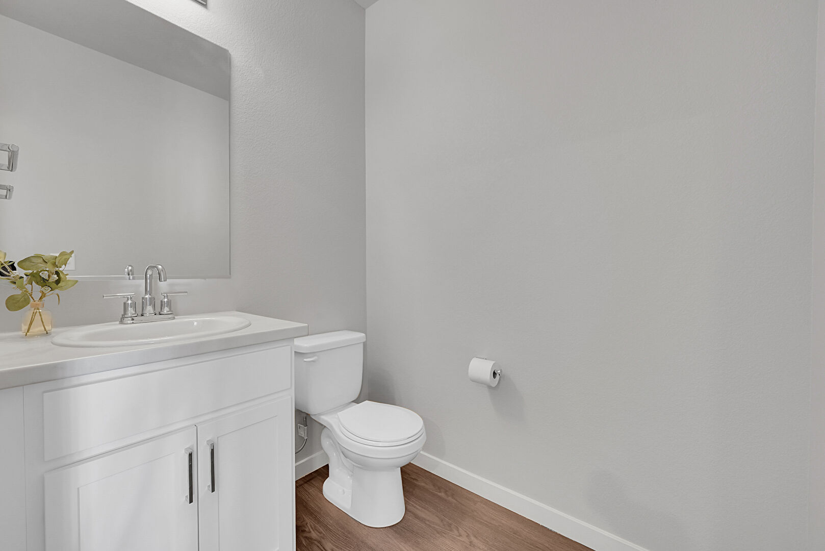 Baseboards Wall, Drywall, Full Bathroom, Textured Wall, Vanity, Wood Finish Floor, Combined Bath Shower, Half Bathroom